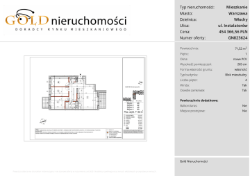 Typ nieruchomości: Mieszkanie Miasto: Warszawa Dzielnica: Włochy Ulica: ul. Instalatorów Cena: 454 366,56 PLN Numer oferty: Powierzchnia: Piętro: Okna: GN823624 71,52 m2 1 nowe PCV Wysokość pomieszczeń: 265 cm Forma własności gruntu: własność Typ budynku: Blok mieszkalny Liczba pięter: 4 Winda: Tak Osiedle zamknięte: Tak Powierzchnie dodatkowe: Balkon/taras: Nie Miejsce postojowe: Nie Gold Nieruchomości Powyższa oferta ma charakter informacyjny i nie stanowi oferty w rozumieniu art.66 $1 kodeksu cywilnego oraz innych właściwych przepsiów prawnych. Typ nieruchomości: Mieszkanie Miasto: Warszawa Dzielnica: Włochy Ulica: ul. Instalatorów Cena: 454 366,56 PLN Numer oferty: Powierzchnia: Piętro: Okna: GN823624 71,52 m2 1 nowe PCV Wysokość pomieszczeń: 265 cm Forma własności gruntu: własność Typ budynku: Blok mieszkalny Liczba pięter: 4 Winda: Tak Osiedle zamknięte: Tak Powierzchnie dodatkowe: Balkon/taras: Nie Miejsce postojowe: Nie Gold Nieruchomości Powyższa oferta ma charakter informacyjny i nie stanowi oferty w rozumieniu art.66 $1 kodeksu cywilnego oraz innych właściwych przepsiów prawnych. Typ nieruchomości: Mieszkanie Miasto: Warszawa Dzielnica: Włochy Ulica: ul. Instalatorów Cena: 454 366,56 PLN Numer oferty: Opis Powierzchnia: Piętro: GN823624 71,52 m2 1 Na obszarze ponad 8 hektarów, powstaje nowa przestrzeń mieszkalna wraz z infrastrukturą handlową i użytkową. Prezentowane osiedle to kolejna inwestycja mieszkaniowa, znajdująca się w szybko zmieniającej swój charakter warszawskiej dzielnicy Włochy, w sąsiedztwie Parku Szczęśliwickiego i Alei Krakowskiej. Okna: Rozpoczęcie prac budowlanych nastąpiło w kwietniu 2013 roku, inwestycja zakłada budowę około 2000 mieszkań, sieci ulic wewnętrznych wraz z małą architekturą. Planowany czas trwania inwestycji to 6 lat. Typ budynku: Blok mieszkalny Liczba pięter: 4 Oferta z rynku pierwotnego klient nie ponosi dodatkowych kosztów związanych z wynagrodzeniem pośrednika oraz PCC. nowe PCV Wysokość pomieszczeń: 265 cm Forma własności gruntu: własność Winda: Tak Osiedle zamknięte: Tak Powierzchnie dodatkowe: Balkon/taras: Nie Miejsce postojowe: Nie Gold Nieruchomości Powyższa oferta ma charakter informacyjny i nie stanowi oferty w rozumieniu art.66 $1 kodeksu cywilnego oraz innych właściwych przepsiów prawnych.