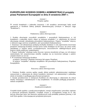 EUROPEJSKI KODEKS DOBREJ ADMINISTRACJI przyjęty przez Parlament Europejski w dniu 6 września 2001 r. Artykuł 1 Przepisy ogólne W swoich kontaktach z jednostką instytucje i ich urzędnicy przestrzegać będą zasad zapisanych w Kodeksie dobrej praktyki administracyjnej (zwanym w dalszym ciągu "Kodeksem"). Artykuł 2 Podmiotowy zakres obowiązywania 1. Kodeks obowiązuje wszystkich urzędników i pozostałych funkcjonariuszy w ich kontaktach z jednostką, którzy objęci są statusem urzędnika i w odniesieniu do których obowiązują warunki zatrudniania pozostałych funkcjonariuszy. Pojęcie "urzędnika" dotyczy w dalszym ciągu zarówno urzędników, jak i pozostałych funkcjonariuszy. 2. Instytucje i ich administracje podejmą niezbędne działania w celu zapewnienia stosowania przepisów niniejszego Kodeksu również przez osoby działające na ich rzecz, np. przez osoby zatrudniane w ramach umów cywilnoprawnych, rzeczoznawców oddelegowanych przez krajowe służby publiczne i praktykantów 3. Pojęcie "jednostka" obejmuje osoby fizyczne i prawne niezależnie od tego, czy ich miejsce zamieszkania lub zarejestrowanej siedziby znajduje się na terytorium jednego z państw członkowskich czy też nie 4. W rozumieniu niniejszego Kodeksu a) pojęcie "instytucji" obejmuje instytucje lub organy Wspólnot; b) pojęcie "urzędnika" obejmuje urzędników lub pozostałych funkcjonariuszy Wspólnot Europejskich. Artykuł 3 Rzeczowy zakres obowiązywania 1. Niniejszy Kodeks zawiera ogólne zasady dobrej praktyki administracyjnej znajdujące zastosowanie w odniesieniu do całości kontaktów instytucji i ich administracji z jednostką, chyba że kontakty te podlegają specyficznym przepisom. 2. Zasady przedstawione w niniejszym Kodeksie nie obowiązują w odniesieniu do relacji między instytucją a zatrudnionymi w niej urzędnikami. Te stosunki podlegają przepisom o statusie urzędników. Artykuł 4 Zasada praworządności Urzędnik działa zgodnie z zasadą praworządności, stosuje uregulowania i procedury zapisane w prawnych przepisach Wspólnot. Urzędnik zwraca w szczególności uwagę na to, aby decyzje dotyczące praw lub interesów pojedynczych osób posiadały podstawę prawną, a ich treść była zgodna z obowiązującymi przepisami prawnymi. 1 Artykuł 5 Zasada niedyskryminowania 1. Przy rozpatrywaniu wniosków jednostek i przy podejmowaniu decyzji urzędnik zapewni przestrzeganie zasady równego traktowania. Pojedyncze osoby znajdujące się w takiej samej sytuacji będą traktowane w porównywalny sposób. 2. W przypadku różnic w traktowaniu urzędnik zapewni, aby to nierówne traktowanie było usprawiedliwione obiektywnymi, istotnymi właściwościami danej sprawy. 3. Urzędnik powstrzyma się w szczególności od wszelkiego nieusprawiedliwionego nierównego traktowania pojedynczych osób ze względu na ich narodowość, płeć, rasę, kolor skóry, pochodzenie etniczne lub społeczne, cechy genetyczne, język, religię lub wyznanie, przekonania polityczne lub inne; przynależność do mniejszości narodowej, posiadaną własność, urodzenie, inwalidztwo, wiek lub preferencje seksualne. Artykuł 6 Zasada współmierności 1. W toku podejmowania decyzji urzędnik zapewni, że przyjęte działania pozostaną współmierne do obranego celu. Urzędnik będzie w szczególności unikać ograniczania praw obywateli lub nakładania na nich obciążeń, jeżeli ograniczenia te lub obciążenia byłyby niewspółmierne do celu prowadzonych działań. 2. W toku podejmowania decyzji urzędnik zwróci uwagę na stosowne wyważenie spraw osób prywatnych i ogólnego interesu publicznego. Artykuł 7 Zakaz nadużywania uprawnień Z uprawnień urzędnik może korzystać wyłącznie dla osiągnięcia celów, dla których uprawnienia te zostały mu powierzone mocą odnośnych przepisów. Urzędnik odstąpi w szczególności od korzystania z uprawnień dla osiągnięcia celów, dla których brak jest podstawy prawnej lub które nie mogą być uzasadnione interesem publicznym. Artykuł 8 Zasada bezstronności i niezależności 1. Urzędnik działa bezstronnie i niezależnie. Urzędnik powstrzyma się od wszelkich arbitralnych działań, które mogą mieć negatywny wpływ na sytuację pojedynczych osób, oraz od wszelkich form faworyzowania, bez względu na motywy takiego postępowania. 2. Na postępowanie urzędników nie będzie miał wpływu, w żadnym czasie, interes osobisty, rodzinny lub narodowy, ani też nie będzie wpływać presja polityczna. Urzędnik nie będzie uczestniczył w podejmowaniu decyzji, w której on lub bliski członek jego rodziny miałby interes finansowy. Artykuł 9 Zasada obiektywności W toku podejmowania decyzji urzędnik uwzględni wszystkie istotne czynniki i przypisze każdemu z nich należne mu znaczenie; nie uwzględnia się żadnych okoliczności nie należących do sprawy. 2 Artykuł 10 Zgodne z prawem oczekiwania oraz konsekwentne działanie i doradztwo 1. Urzędnik działa konsekwentnie w ramach swojej praktyki administracyjnej i w swoim stosunku do działalności administracyjnej instytucji. Urzędnik przestrzega obowiązujących w instytucji praktyk administracyjnych, o ile nie istnieją uzasadnione powody, które usprawiedliwiałyby odejście w indywidualnym przypadku od tych praktyk. Te powody należy przedstawić na piśmie. 2. Urzędnik uwzględnia uzasadnione i słuszne oczekiwania jednostki, które wynikają z działań podejmowanych przez daną instytucję w przeszłości. 3. W razie potrzeby urzędnik służy jednostce poradą dotyczącą możliwego sposobu postępowania w sprawie wchodzącej w zakres jego działania oraz dotyczącą pożądanego sposobu rozstrzygnięcia sprawy. Artykuł 11 Zasada uczciwości Urzędnik powinien działać bezstronnie, uczciwie i rozsądnie. Artykuł 12 Zasada uprzejmości 1. W swoich kontaktach z jednostką urzędnik pozostaje usługodawcą i zachowuje się właściwie, uprzejmie i pozostaje dostępny. Odpowiad