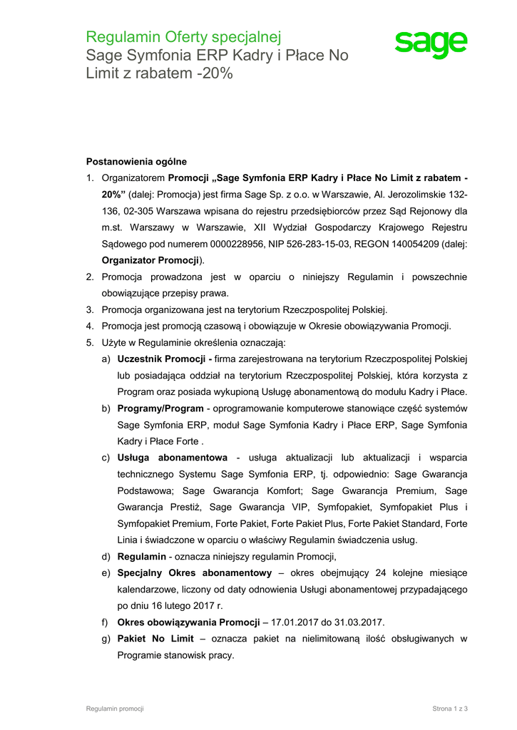 Regulamin Oferty specjalnej Sage Symfonia ERP Kadry i Płace No