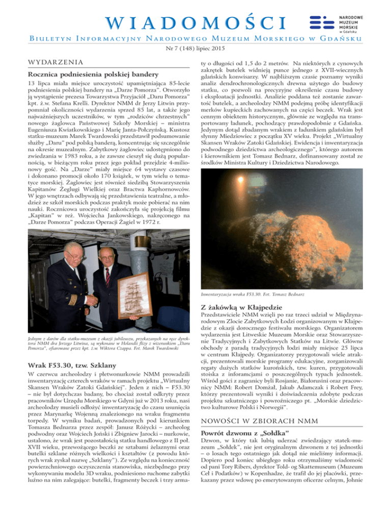 WIADOMOŚCI BIULETYN INFORMACYJNY NARODOWEGO MUZEUM MORSKIEGO W GDAŃSKU Nr 7 (148) lipiec 2015 WY DARZENIA Rocznica podniesienia polskiej bandery 13 lipca miała miejsce uroczystość upamiętniająca 85-lecie podniesienia polskiej bandery na „Darze Pomorza”. Otworzyło ją wystąpienie prezesa Towarzystwa Przyjaciół „Daru Pomorza” kpt. ż.w. Stefana Krelli. Dyrektor NMM dr Jerzy Litwin przypomniał okoliczności wydarzenia sprzed 85 lat, a także jego najważniejszych uczestników, w tym „rodziców chrzestnych” nowego żaglowca Państwowej Szkoły Morskiej – ministra Eugeniusza Kwiatkowskiego i Marię Janta-Połczyńską. Kustosz statku-muzeum Marek Twardowski przedstawił podsumowanie służby „Daru” pod polską banderą, koncentrując się szczególnie na okresie muzealnym. Zabytkowy żaglowiec udostępniono do zwiedzania w 1983 roku, a że zawsze cieszył się dużą popularnością, w bieżącym roku przez jego pokład przejdzie 4-milionowy gość. Na „Darze” miały miejsce 64 wystawy czasowe i dokonano promocji około 170 książek, w tym wielu o tematyce morskiej. Żaglowiec jest również siedzibą Stowarzyszenia Kapitanów Żeglugi Wielkiej oraz Bractwa Kaphornowców. W jego wnętrzach odbywają się przedstawienia teatralne, a młodzież ze szkół morskich podczas praktyk może pobierać na nim nauki. Rocznicowa uroczystość zakończyła się projekcją filmu „Kapitan” w reż. Wojciecha Jankowskiego, nakręconego na „Darze Pomorza” podczas Operacji Żagiel w 1972 r. ty o długości od 1,5 do 2 metrów. Na niektórych z cynowych zakrętek butelek widnieją punce jednego z XVII-wiecznych gdańskich konwisarzy. W najbliższym czasie poznamy wyniki analiz dendrochronologicznych drewna użytego do budowy statku, co pozwoli na precyzyjne określenie czasu budowy i eksploatacji jednostki. Analizie poddana też zostanie zawartość butelek, a archeolodzy NMM podejmą próbę identyfikacji merków kupieckich zachowanych na części beczek. Wrak jest cennym obiektem historycznym, głównie ze względu na transportowany ładunek, pochodzący prawdopodobnie z Gdańska. Jedynym dotąd zbadanym wrakiem z ładunkiem gdańskim był słynny Miedziowiec z początku XV wieku. Projekt „Wirtualny Skansen Wraków Zatoki Gdańskiej. Ewidencja i inwentaryzacja podwodnego dziedzictwa archeologicznego”, którego autorem i kierownikiem jest Tomasz Bednarz, dofinansowany został ze środków Ministra Kultury i Dziedzictwa Narodowego. Inwentaryzacja wraka F53.30. Fot. Tomasz Bednarz Z żakówką w Kłajpedzie Jednym z darów dla statku-muzeum z okazji jubileuszu, przekazanych na ręce dyrektora NMM dra Jerzego Litwina, są wykonane w Holandii flizy z wizerunkiem „Daru Pomorza”, ofiarowane przez kpt. ż.w. Wiktora Czappa. Fot. Marek Twardowski Wrak F53.30, tzw. Szklany W czerwcu archeolodzy i płetwonurkowie NMM prowadzili inwentaryzację czterech wraków w ramach projektu „Wirtualny Skansen Wraków Zatoki Gdańskiej”. Jeden z nich – F53.30 – nie był dotychczas badany, bo chociaż został odkryty przez pracowników Urzędu Morskiego w Gdyni już w 2013 roku, nasi archeolodzy musieli odłożyć inwentaryzację do czasu usunięcia przez Marynarkę Wojenną znalezionego na wraku fragmentu torpedy. W wyniku badań, prowadzonych pod kierunkiem Tomasza Bednarza przez zespół: Janusz Różycki – archeolog podwodny oraz Wojciech Joński i Zbigniew Jarocki – nurkowie, ustalono, że wrak jest pozostałością statku handlowego z II poł. XVII wieku, przewożącego beczki ze sztabami żelaznymi oraz butelki szklane różnych wielkości i kształtów (z powodu których wrak zyskał nazwę „Szklany”). Ze względu na konieczność powierzchniowego oczyszczenia stanowiska, niezbędnego przy wykonywaniu modelu 3D wraku, podniesiono ruchome zabytki luźno na nim zalegające: butelki, fragmenty beczek i trzy arma- Przedstawiciele NMM wzięli po raz trzeci udział w Międzynarodowym Zlocie Zabytkowych Łodzi organizowanym w Kłajpedzie z okazji dorocznego festiwalu morskiego. Organizatorem wydarzenia jest Litweskie Muzeum Morskie oraz Stowarzyszenie Tradycyjnych i Zabytkowych Statków na Litwie. Główne obchody z paradą tradycyjnych łodzi miały miejsce 25 lipca w centrum Kłajpedy. Organizatorzy przygotowali wiele atrakcji, prezentowali morskie programy edukacyjne, zorganizowali regaty dużych statków kurońskich, tzw. kuren, przygotowali stoiska z inforamcjami o poszczególnych typach jednostek. Wśród gości z zagranicy byli Rosjanie, Białorusini oraz pracownicy NMM: Robert Domżał, Jakub Adamczak i Robert Frey, którzy prezentowali wyniki i doświadczenia zdobyte podczas projektu szkutniczego i powroźniczego pt. „Morskie dziedzictwo kulturowe Polski i Norwegii”. NOWO Ś C I W Z B I O R AC H NM M Powrót dzwonu z „Sołdka” Dzwon, w który tak lubią uderzać zwiedzający statek-muzeum „Sołdek”, nie jest oryginalnym dzwonem z tej jednostki – o losach tego ostatniego jak dotąd nie mieliśmy informacji. Dopiero pod koniec ubiegłego roku otrzymaliśmy wiadomość od pani Tory Ribers, dyrektor Told- og Skattemuseum (Muzeum Ceł i Podatków) w Kopenhadze, że trafił do jej placówki, przekazany przez wdowę po emerytowanym oficerze celnym, Johnie Nielsenie. Zgodnie z jej relacją, Duńczyk otrzymał dzwon z „Sołdka” z rąk kapitana statku jako wyraz podziękowania za dobrą współpracę. Stało się to podczas ostatniego rejsu parowca, gdy ofiarodawca przekonany był, że statek po powrocie trafi na złom. Dyrektor Muzeum w Kopenhadze (którego przedstawiciel gościł kilka lat temu w Gdańsku na seminarium poświęconym „Sołdkowi”) postanowiła podarować zabytkowy dzwon NMM. Zostanie on wyeksponowany w Spichlerzach na Ołowiance. Zaślubiny z morzem wg Fałata Kolekcja dzieł sztuki Narodowego Muzeum Morskiego w Gdańsku wzbogaciła się ostatnio o wyjątkowe dzieło – obraz pt. „Zaślubiny Polski z morzem” autorstwa Juliana