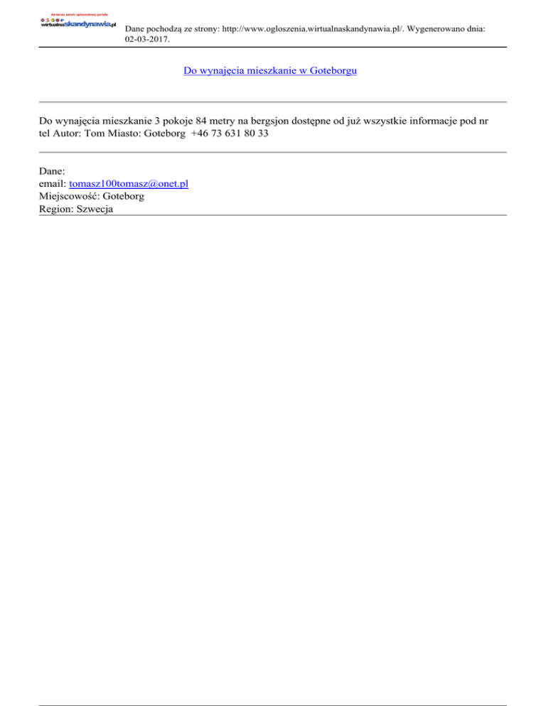 Dane pochodzą ze strony: http://www.ogloszenia.wirtualnaskandynawia.pl/. Wygenerowano dnia: 02-03-2017. Do wynajęcia mieszkanie w Goteborgu Do wynajęcia mieszkanie 3 pokoje 84 metry na bergsjon dostępne od już wszystkie informacje pod nr tel Autor: Tom Miasto: Goteborg +46 73 631 80 33 Dane: email: [email protected] Miejscowość: Goteborg Region: Szwecja