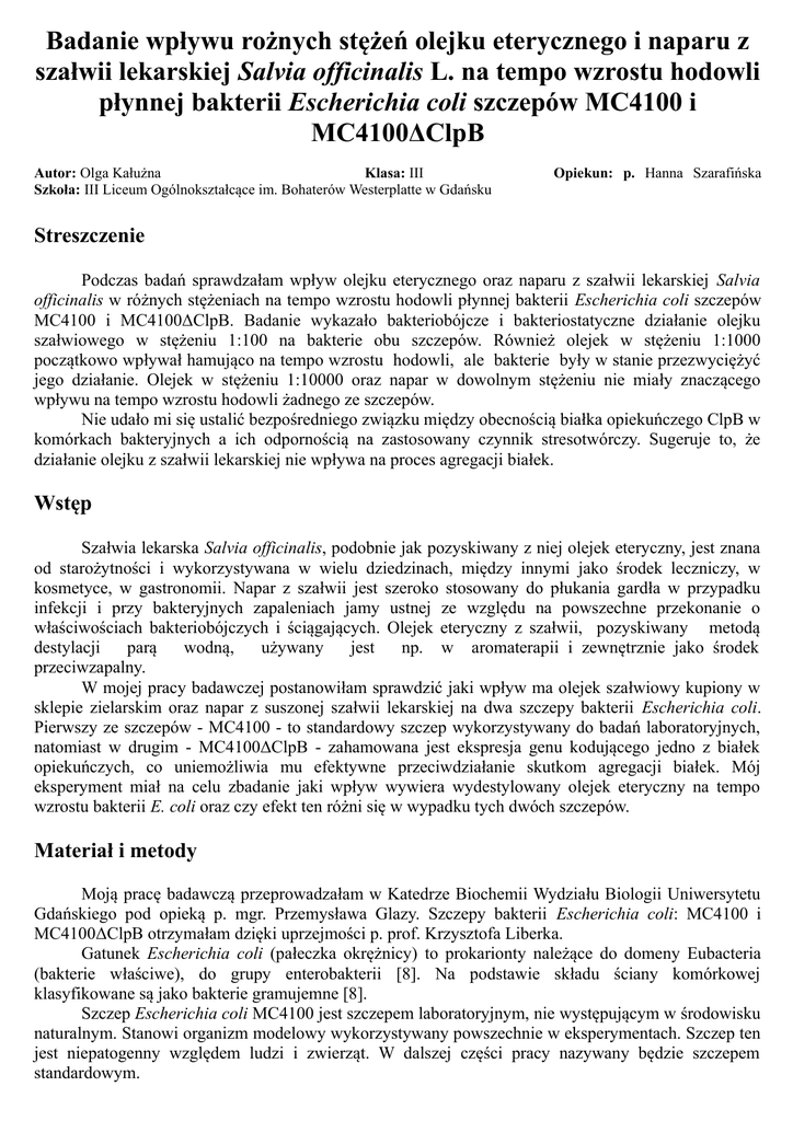Badanie wpływu rożnych stężeń olejku eterycznego i naparu z szałwii lekarskiej Salvia officinalis L. na tempo wzrostu hodowli płynnej bakterii Escherichia coli szczepów MC4100 i MC4100ΔClpB Autor: Olga Kałużna Klasa: III Szkoła: III Liceum Ogólnokształcące im. Bohaterów Westerplatte w Gdańsku Opiekun: p. Hanna Szarafińska Streszczenie Podczas badań sprawdzałam wpływ olejku eterycznego oraz naparu z szałwii lekarskiej Salvia officinalis w różnych stężeniach na tempo wzrostu hodowli płynnej bakterii Escherichia coli szczepów MC4100 i MC4100ΔClpB. Badanie wykazało bakteriobójcze i bakteriostatyczne działanie olejku szałwiowego w stężeniu 1:100 na bakterie obu szczepów. Również olejek w stężeniu 1:1000 początkowo wpływał hamująco na tempo wzrostu hodowli, ale bakterie były w stanie przezwyciężyć jego działanie. Olejek w stężeniu 1:10000 oraz napar w dowolnym stężeniu nie miały znaczącego wpływu na tempo wzrostu hodowli żadnego ze szczepów. Nie udało mi się ustalić bezpośredniego związku między obecnością białka opiekuńczego ClpB w komórkach bakteryjnych a ich odpornością na zastosowany czynnik stresotwórczy. Sugeruje to, że działanie olejku z szałwii lekarskiej nie wpływa na proces agregacji białek. Wstęp Szałwia lekarska Salvia officinalis, podobnie jak pozyskiwany z niej olejek eteryczny, jest znana od starożytności i wykorzystywana w wielu dziedzinach, między innymi jako środek leczniczy, w kosmetyce, w gastronomii. Napar z szałwii jest szeroko stosowany do płukania gardła w przypadku infekcji i przy bakteryjnych zapaleniach jamy ustnej ze względu na powszechne przekonanie o właściwościach bakteriobójczych i ściągających. Olejek eteryczny z szałwii, pozyskiwany metodą destylacji parą wodną, używany jest np. w aromaterapii i zewnętrznie jako środek przeciwzapalny. W mojej pracy badawczej postanowiłam sprawdzić jaki wpływ ma olejek szałwiowy kupiony w sklepie zielarskim oraz napar z suszonej szałwii lekarskiej na dwa szczepy bakterii Escherichia coli. Pierwszy ze szczepów - MC4100 - to standardowy szczep wykorzystywany do badań laboratoryjnych, natomiast w drugim - MC4100ΔClpB - zahamowana jest ekspresja genu kodującego jedno z białek opiekuńczych, co uniemożliwia mu efektywne przeciwdziałanie skutkom agregacji białek. Mój eksperyment miał na celu zbadanie jaki wpływ wywiera wydestylowany olejek eteryczny na tempo wzrostu bakterii E. coli oraz czy efekt ten różni się w wypadku tych dwóch szczepów. Materiał i metody Moją pracę badawczą przeprowadzałam w Katedrze Biochemii Wydziału Biologii Uniwersytetu Gdańskiego pod opieką p. mgr. Przemysława Glazy. Szczepy bakterii Escherichia coli: MC4100 i MC4100ΔClpB otrzymałam dzięki uprzejmości p. prof. Krzysztofa Liberka. Gatunek Escherichia coli (pałeczka okrężnicy) to prokarionty należące do domeny Eubacteria (bakterie właściwe), do grupy enterobakterii [8]. Na podstawie składu ściany komórkowej klasyfikowane są jako bakterie gramujemne [8]. Szczep Escherichia coli MC4100 jest szczepem laboratoryjnym, nie występującym w środowisku naturalnym. Stanowi organizm modelowy wykorzystywany powszechnie w eksperymentach. Szczep ten jest niepatogenny względem ludzi i zwierząt. W dalszej części pracy nazywany będzie szczepem standardowym. Szczep MC4100ΔClpB różni się od szczepu standardowego blokadą ekspresji genu kodującego białko ClpB (jedno z białek opiekuńczych, chroniących komórkę bakteryjną przed negatywnym wpływem czynników środowiskowych zmieniających prawidłową konformację białek). Dalej nazywany jest szczepem zmutowanym. Zaszczepiłam hodowle nocne bakterii dodając jedną kolonię bakterii odpowiedniego szczepu pobraną z płytki z pożywką do 50 ml pożywki LB i pozostawiając na noc w wytrząsarce Julabo SW23 w temperaturze 37ºC. Odmłodziłam hodowle dodając 2 ml hodowli nocnej do 50 ml pożywki LB. Kolby z nowymi hodowlami wstawiłam do wytrząsarki (temperatura łaźni wodnej 37ºC, tempo obrotów 200 rpm) i odmładzałam do momentu uzyskania gęstości optycznej (OD) w przedziale 0,250-0,400 przy długości fali 600 nm. Użyłam spektrofotometru NOVASPEC II firmy PHARMACIA. W przypadku szczepu standardowego odmładzanie trwało 60 min., a zmutowanego 120 min. z powodu mniejszego tempa wzrostu bakterii szczepu zmutowanego w pierwszej fazie rozwoju kolonii. Do badań użyłam olejku szałwiowego firmy Semifarm, który zakupiłam w sklepie zielarskim. Jest to czysty olejek, pozyskiwany metodą destylacji parą wodną, co oznacza, że jego stężenie wynosi 100%. Napar z szałwii lekarskiej przygotowałam przy użyciu suszonej szałwii w saszetkach firmy Herbapol według instrukcji na opakowaniu. 2 saszetki (każda po 1,2 g suszonej szałwii) zalałam 100 ml wody o temperaturze 95ºC. Pozostawiłam mieszankę do zaparzenia przez 15 min. Następnie ostudziłam do temperatury pokojowej. Stężenie olejku eterycznego w naparze było niemożliwe do oszacowania, natomiast prawdopodobnie wielokrotnie niższe niż w czystym olejku ze względu na niewielką jego zawartość w pędach szałwii oraz rozcieńczenie wodą podczas parzenia. W skład olejku szałwiowego wchodzą między innymi związki takie jak: α-tujon (31,7%), kamfora (16,7%), α-pinen, kamfen, β-pinen, β-mircen, p-cymen, limonen, 1,8-cineol, β-tujon, borneol, β-kariofilen i α-humulen, które należą do głównie do grup terpenów i monoterpenów. Przed użyciem odczynników do doświadczenia przefiltrowałam je używając jałowej strzykawki i filtra Syringe Driven Filter Unit Millipore Millex-GS 0,22 μm w celu pozbycia się ewentualnych biologicznych zanieczyszczeń, które mogłyby zafałszować wyniki doświadczenia. Aby uzyskać roztwory o różnych stężeniach, do kolb stożkowych o pojemności 100 ml odmierzyłam po 9 ml odmłodzonych hodowli E. coli, oznaczyłam kolby, a następnie dodałam odpowie
