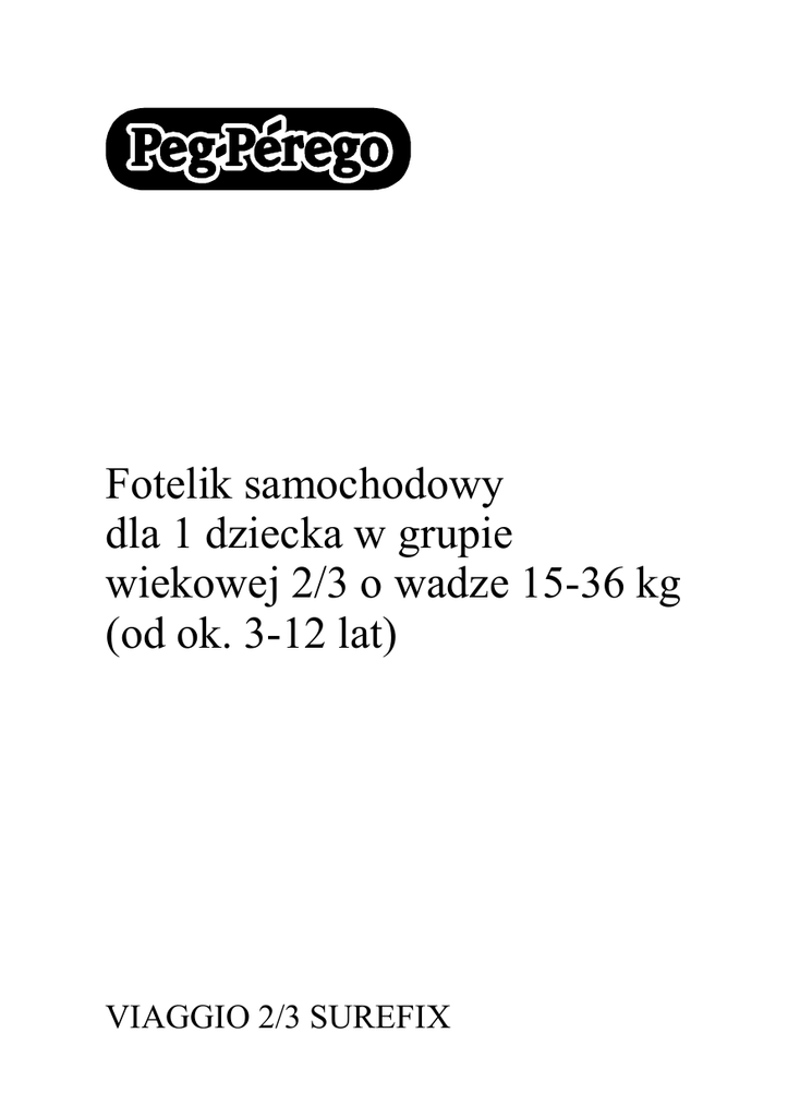 Fotelik samochodowy dla 1 dziecka w grupie wiekowej 2/3 o wadze 15-36 kg (od ok. 3-12 lat) VIAGGIO 2/3 SUREFIX OK NO NO 1 NO NO NO A 3 1 2 3 4 5 6 6 5 4 3 2 1 2 4 5 6 7 8 A B C 9 10 11 12 13 14 2cm 15 16 17 18 19 20 A B 21 22 23 24 25 26 27 28 UWAGA! WAŻNE. ZACHOWAĆ W CELU POWOŁANIA SIĘ W PRZYSZŁOŚCI. Firma Peg Perego posiada certyfikat ISO 9001 Przeczytaj uważnie poniższą instrukcję i zachowaj ją na przyszłość. Przestrzeganie zawartych w niej poleceń i wskazówek zapobiegnie powstaniu niebezpiecznych dla zdrowia i życia dziecka sytuacji. WAŻNE! Dziecko w foteliku Viaggio 2/3 Surefix należy przewozić zawsze zabezpieczone samochodowymi pasami bezpieczeństwa. Dodatkowo można użyć zaczepów surefix, które zapobiegają samoczynnemu przemieszczaniu się fotelika podczas pokonywania zakrętów lub hamowania. Fotelik Viaggio 2/3, model „Universal” z pasami samochodowymi - Homologowany zgodnie z europejską normą UN/ECE R44/04 dla dzieci o wadze 15-36 kg (ok. 3-12 lat). - Kompatybilny z wieloma markami samochodów, ale nie ze wszystkimi. - Fotelik można poprawnie zamontować w samochodzie, którego instrukcja użycia wyraźnie określa, że jest kompatybilny z mocowaniem systemu „Universal”. - Fotelik ten jest sklasyfikowany jako „Universal” co oznacza, że spełnia wymagania ostrzejszych kryteriów homologacji niż wcześniejsze modele nie posiadające naklejki z tą homologacją. - Fotelik może być używany wyłącznie w zatwierdzonych modelach samochodów wyposażonych w 3 punktowe bezwładnościowe pasy bezpieczeństwa, zgodne z normą UN/ECE R16 lub równoważną. - Używanie fotelika w samochodzie wyposażonym w 2 punktowe pasy jest ZABRONIONE Fotelik Viaggio 2/3, model „Semi-universal”, z pasami samochodowymi i zaczepami surefix - Homologowany zgodnie z europejską normą UN/ECE R44/04 dla dzieci o wadze 15-36 kg (ok. 3-12 lat). - Ten fotelik jest sklasyfikowany jako „semi-universal” i może być przewożony w modelach samochodów podanych w załączonej przez producenta broszurce. - Fotelik może być przewożony wyłącznie w zatwierdzonych modelach wyposażonych w 3-punktowe bezwładnościowe pasy bezpieczeństwa spełniające normy UN/ECE R16 lub równoważną. - Przewożenie tego fotelika w samochodzie wyposażonym w 2 punktowe pasy jest ZABRONIONE UWAGA! - Fotelik może być montowany wyłącznie przez osoby dorosłe, podczas montażu dziecko nie może przebywać w foteliku. - Nie wkładaj palców w ruchome mechanizmy fotelika. - Szczególnie pilnuj aby w pobliżu przewożonego dziecka nie znajdowały się żadne niebezpieczne przedmioty mogące zranić dziecko podczas wypadku. - Nie stosuj innych metod instalacji niż podane w instrukcji. - Zawsze upewniaj się, że samochodowe pasy nie są poskręcane. - Podczas jazdy samochodem nigdy nie trzymaj dziecka na kolanach lub w ramionach. - Nigdy nie pozostawiaj dziecka samego w samochodzie i doglądaj je podczas snu. - Nigdy nie wyjmuj dziecka z fotelika podczas jazdy samochodem. - Sprawdź czy siedzącemu w foteliku dziecku nie zagrażają ruchome elementy samochodu, drzwi. - Poprawnie reguluj wysokość i napięcie pasów, sprawdzaj czy przylegają do ciała dziecka bez wywierania nadmiernego nacisku. Sprawdzaj czy pasy nie są poskręcane i czy dziecko ich nie wypięło. - Nie pozostawiaj samochodu z wpiętym fotelikiem na ostrym słońcu, przed posadzeniem dziecka sprawdź, czy nie jest on zbyt nagrzany. - Nigdy nie używaj fotelika bez tapicerki, ponieważ jest ona jego integralną częścią. - Nigdy nie usuwaj z fotelika żadnych styropianowych elementów. - Jeśli zgubisz lub uszkodzisz jakiś element, skontaktuj się z serwisem w Polsce. - Fotelik posiada swój numer fabryczny. - Nie usuwaj z fotelika żadnych naklejek ani wszywek gdyż poświadczają one jego zgodność z normami. - Ze względów bezpieczeństwa nigdy nie używaj fotelika jeśli jest uszkodzony, wybrakowany lub pochodzi z tzw. drugiej ręki - istnieje ryzyko, że brał udział w wypadku i nie spełnia już wymaganych norm bezpieczeństwa. - Nie dokonuj w produkcie żadnych zmian. - Jeżeli fotelik jest przypięty zaczepami surefix, może zostać w samochodzie nawet jeśli nie przewozisz w nim dziecka, w przeciwnym wypadku lepiej przewozić fotelik w bagażniku. - Nie używaj żadnych dodatkowych akcesoriów nie zatwierdzonych przez producenta. 1. WAŻNE! - Fotelik Viaggio 2/3 dla grupy wiekowej 2/3 musi być przewożony przodem do kierunku jazdy. - Nie instaluj go tyłem lub bokiem względem kierunku jazdy. - Zalecane jest przewożenie dziecka na tylnej kanapie po stronie pasażera. - Jeżeli zainstalowałeś fotelik na przednim siedzeniu, odsuń go możliwie jak najdalej od deski rozdzielczej. Jeżeli powstały jakieś problemy podczas montażu, spróbuj unieść zagłówek bez jego usuwania. 2. CZĘŚCI SKŁADOWE FOTELIKA. Skontaktuj się z serwisem jeśli po otwarciu kartonu twierdzisz brak któregoś z wymienionych elementów fotelika: 1) zagłówek, 2) oparcie, 3)siedzisko. Po wyjęciu z kartonu produkt jest gotowy do użycia, nie wymaga złożenia. CECHY PRODUKTU 3. Unoś oparcie fotelika zgodnie ze strzałką A do momentu, aż usłyszysz „kliknięcie”. Oparcie może się poruszać między dwoma blokadami (strzałka B). 4. Zagłówek można umieścić na 6 różnych wysokościach. Unieś dźwignię znajdującą się w tylnej części zagłówka i ustaw go na wybranej wysokości. WAŻNE: Wysokość zagłówka musi być zawsze dostosowana do wzrostu dziecka. WAŻNE: Po zmianie wysokości zagłówka spróbuj usunąć go aby upewnić się, że został poprawnie zablokowany. 5. Viaggio 2-3 posiada 2 chowane uchwyty na butelki. 6. Dla zwiększenia komfortu podróżowania fotelik posiada regulację położenia siedziska. Pociągnij dźwignię do siebie jednocześnie podnosząc siedzisko. Aby powrócić do poprzedniej pozycji pociągnij ponownie dźwignię i naciśnij siedzisko. 7. Jeśli to możliwe, przygoto