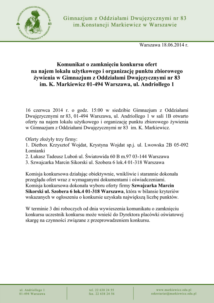 Warszawa 18.06.2014 r. Komunikat o zamknięciu konkursu ofert na najem lokalu użytkowego i organizację punktu zbiorowego żywienia w Gimnazjum z Oddziałami Dwujęzycznymi nr 83 im. K. Markiewicz 01-494 Warszawa, ul. Andriollego 1 16 czerwca 2014 r. o godz. 15:00 w siedzibie Gimnazjum z Oddziałami Dwujęzycznymi nr 83, 01-494 Warszawa, ul. Andriollego 1 w sali 1B otwarto oferty na najem lokalu użytkowego i organizację punktu zbiorowego żywienia w Gimnazjum z Oddziałami Dwujęzycznymi nr 83 im. K. Markiewicz. Oferty złożyły trzy firmy: 1. Dietbox Krzysztof Wojdat, Krystyna Wojdat sp.j. ul. Lwowska 2B 05-092 Łomianki 2. Łukasz Tadeusz Luboń ul. Światowida 60 B m.97 03-144 Warszawa 3. Szwajcarka Marcin Sikorski ul. Szobera 6 lok.4 01-318 Warszawa Komisja konkursowa działając obiektywnie, wnikliwie i starannie dokonała przeglądu ofert wraz z wymaganymi dokumentami i oświadczeniami. Komisja konkursowa dokonała wyboru oferty firmy Szwajcarka Marcin Sikorski ul. Szobera 6 lok.4 01-318 Warszawa, która w bilansie kryteriów wskazanych w ogłoszeniu o konkursie uzyskała największą liczbę punktów. W terminie 3 dni roboczych od dnia wywieszenia komunikatu o zamknięciu konkursu uczestnik konkursu może wnieść do Dyrektora placówki oświatowej skargę na czynności związane z przeprowadzeniem konkursu.