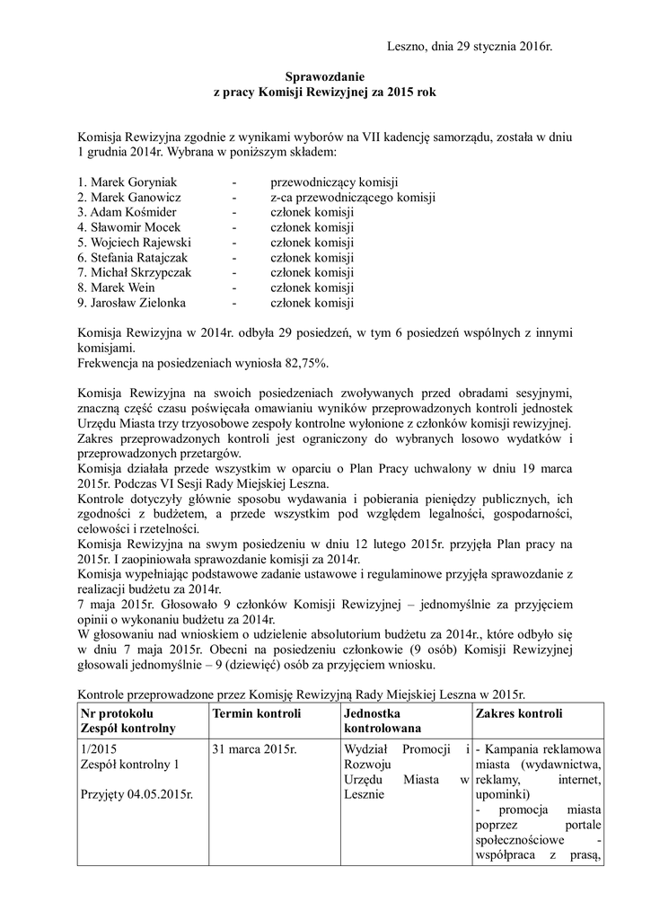 Leszno, dnia 29 stycznia 2016r. Sprawozdanie z pracy Komisji