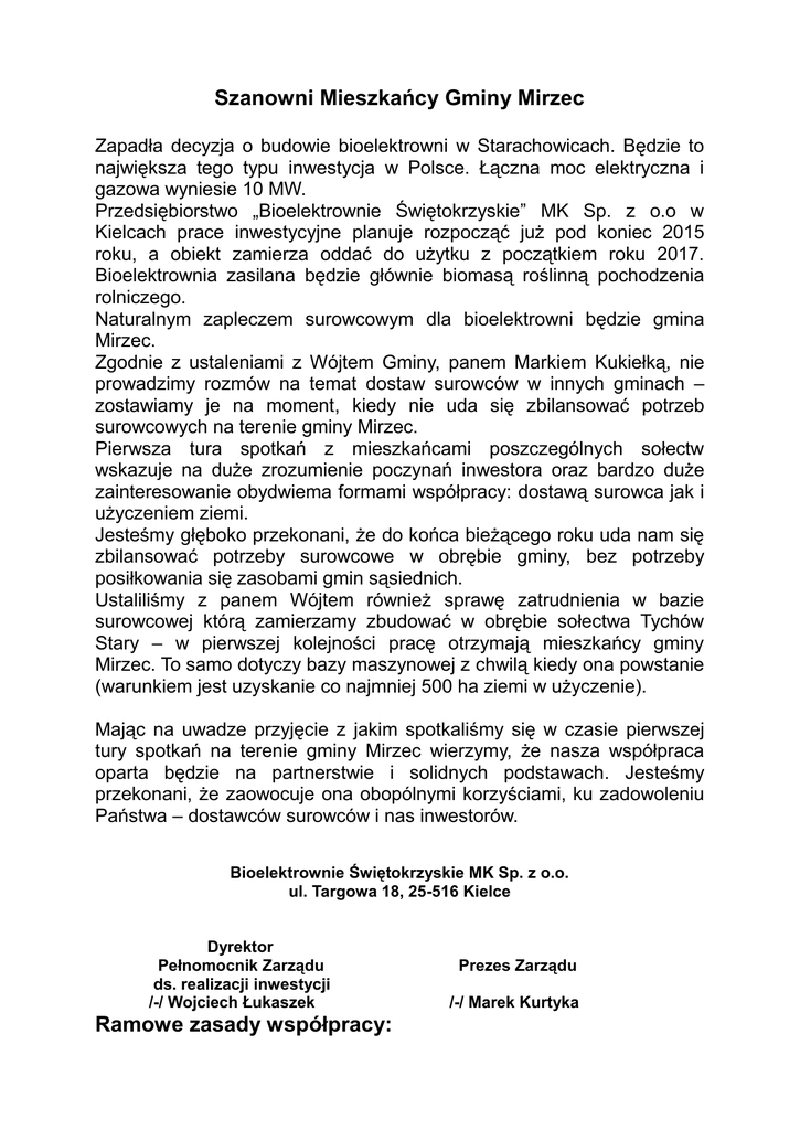 Szanowni Mieszkańcy Gminy Mirzec Zapadła decyzja o budowie bioelektrowni w Starachowicach. Będzie to największa tego typu inwestycja w Polsce. Łączna moc elektryczna i gazowa wyniesie 10 MW. Przedsiębiorstwo „Bioelektrownie Świętokrzyskie” MK Sp. z o.o w Kielcach prace inwestycyjne planuje rozpocząć już pod koniec 2015 roku, a obiekt zamierza oddać do użytku z początkiem roku 2017. Bioelektrownia zasilana będzie głównie biomasą roślinną pochodzenia rolniczego. Naturalnym zapleczem surowcowym dla bioelektrowni będzie gmina Mirzec. Zgodnie z ustaleniami z Wójtem Gminy, panem Markiem Kukiełką, nie prowadzimy rozmów na temat dostaw surowców w innych gminach – zostawiamy je na moment, kiedy nie uda się zbilansować potrzeb surowcowych na terenie gminy Mirzec. Pierwsza tura spotkań z mieszkańcami poszczególnych sołectw wskazuje na duże zrozumienie poczynań inwestora oraz bardzo duże zainteresowanie obydwiema formami współpracy: dostawą surowca jak i użyczeniem ziemi. Jesteśmy głęboko przekonani, że do końca bieżącego roku uda nam się zbilansować potrzeby surowcowe w obrębie gminy, bez potrzeby posiłkowania się zasobami gmin sąsiednich. Ustaliliśmy z panem Wójtem również sprawę zatrudnienia w bazie surowcowej którą zamierzamy zbudować w obrębie sołectwa Tychów Stary – w pierwszej kolejności pracę otrzymają mieszkańcy gminy Mirzec. To samo dotyczy bazy maszynowej z chwilą kiedy ona powstanie (warunkiem jest uzyskanie co najmniej 500 ha ziemi w użyczenie). Mając na uwadze przyjęcie z jakim spotkaliśmy się w czasie pierwszej tury spotkań na terenie gminy Mirzec wierzymy, że nasza współpraca oparta będzie na partnerstwie i solidnych podstawach. Jesteśmy przekonani, że zaowocuje ona obopólnymi korzyściami, ku zadowoleniu Państwa – dostawców surowców i nas inwestorów. Bioelektrownie Świętokrzyskie MK Sp. z o.o. ul. Targowa 18, 25-516 Kielce Dyrektor Pełnomocnik Zarządu ds. realizacji inwestycji /-/ Wojciech Łukaszek Ramowe zasady współpracy: Prezes Zarządu /-/ Marek Kurtyka Produkcja substratów (masy zielonej) Kontraktacja na okres od 5 – 24 lat Umowy zawierane indywidualne Rozliczenia gotówkowe, barterowe (nawóz produkowany w bioelektrowni z możliwością dalszej odsprzedaży za zielonkę lub kiszonkę dostarczoną do bioelektrowni) lub łączone Opieka i doradztwo agrotechniczne Wypowiedzenie umowy przez rolnika z rocznym wyprzedzeniem bez konsekwencji finansowych z jego strony Użyczenie ziemi Umowy na okres 5 – 24 lat Umowy zawierane indywidualne Właściciel zatrzymuje dopłaty obszarowe i dodatkowo 200 zł za użyczenie gruntów za każdy ha użyczonego gruntu Wypowiedzenie umowy przez rolnika z rocznym wyprzedzeniem bez konsekwencji finansowych z jego strony z jednoczesną gwarancją przywrócenia ziemi do stanu sprzed umowy na koszt bioelektrowni Jeżeli inwestor pozyska na zasadzie użyczenia minimum 500 ha ziemi pod uprawy roślin energetycznych na potrzeby bioelektrowni Starachowice, to przy magazynie surowcowym w gminie Mirzec powstanie baza maszynowa, z której będą mogli korzystać nieodpłatnie ( zwracając jedynie koszt paliwa i wynagrodzenie operatora sprzętu ) wszyscy producenci biomasy z gminy Mirzec, którzy podpiszą umowę na produkcję i dostawę substratów do bioelektrowni Starachowice. Wyjściowe propozycje cen kontraktacyjnych: Zielonki 1 tona zielonki z kukurydzy energetycznej – 90 zł 1 tona zielonki z topinamburu (łodygi i bulwy) – 80 zł 1 tona zielonki z traw energetycznych – 40 - 45 zł 1 tona zielonki z perzu wydłużonego zbitokępkowego – 50 zł 1 tona surowych buraków energetycznych (korzeń i liście) – 80 zł Kiszonki 1 tona kiszonki z kukurydzy energetycznej – 110 zł 1 tona kiszonki z topinamburu (łodygi i bulwy) – 100 zł 1 tona kiszonki z traw – 55 zł 1 tona kiszonki z perzu wydłużonego zbitokępkowego – 60 zł 1 tona kiszonki z buraków energetycznych (korzeń i liście) – 90 zł Ceny innych substratów uzgadniane będą indywidualnie. - Ceny ulegają corocznie waloryzacji o poziom inflacji Ceny co pół roku indeksowane są o zmianę współczynnika ceny 1 litra oleju napędowego List intencyjny W związku z budową bioelektrowni bazy magazynowej w Mircu zlokalizowanej w Starachowicach oraz ja, …………………………………………………………………………. zamieszkały w ……………………………………………………………… tel. ……………………………... wyrażam zainteresowanie dostawą do bioelektrowni niżej wymienionych substratów z areału: 1. 2. 3. 4. 5. Kiszonka/zielonka z …………………………………………. z areału ………. ha Kiszonka/zielonka z …………………………………………. z areału ………. ha Kiszonka/zielonka z …………………………………………. z areału ………. ha Kiszonka/zielonka z …………………………………………. z areału ………. ha Inne substraty ………………………………………………………………………… ………………………………………………………………………… jestem zainteresowany/a użyczeniem ziemi: pow. ............ha, klasa ........................ Szczegółowe ceny, okres trwania umowy oraz inne ustalenia zawarte będą w umowie kontraktacyjnej podpisanej pomiędzy Bioelektrowniami Świętokrzyskimi MK Sp. z o.o. w Kielcach a dostawcą, z chwilą uzyskania pozwolenia budowlanego na budowę Bioelektrowni w Starachowicach. Szczegółowa treść umowy kontraktacyjnej uzgodniony zostanie z każdym dostawcą indywidualnie w terminie późniejszym. W trakcie spotkania inicjującego współpracę, omówiono ceny wyjściowe substratów (na dzień podpisania kontraktu). Kontrakt zawierał będzie klauzulę corocznej indeksacji cen substratów o poziom inflacji oraz copółroczną waloryzację o współczynnik zmiany 