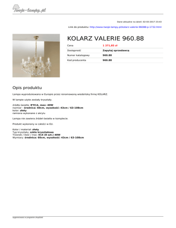 Dane aktualne na dzień: 02-03-2017 23:43 Link do produktu: http://www.twoje-lampy.pl/kolarz-valerie-96088-p-1732.html KOLARZ VALERIE 960.88 Cena 1 371,85 zł Dostępność Zapytaj sprzedawcę Numer katalogowy 960.88 Kod producenta 960.88 Opis produktu Lampa wyprodukowana w Europie przez renomowaną wiedeńską firmę KOLARZ. W lampie użyte zostały kryształy. źródła światła: 8*E14, max: 40W rozmiar - średnica: 60cm, wysokość: 43cm / 63-108cm kolor: złoty ramiona wykonane z akrylu Lampa nie zawiera źródeł światła w komplecie. Produkt wykonany w całości w EU. Kolor / materiał: złoty Typ kryształu: szkło kryształowe Trzonek / ilość / moc: E14 (8 szt.) 40W Wymiary: średnica: 60cm, wysokość: 43cm / 63-108cm wygenerowano w programie shopGold Powered by TCPDF (www.tcpdf.org)