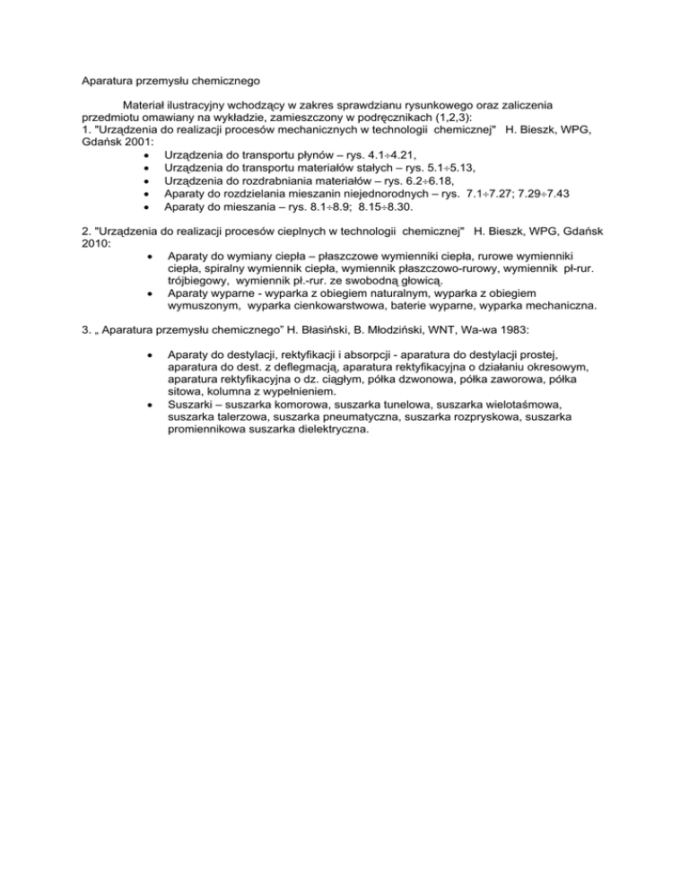 Aparatura przemysłu chemicznego Materiał ilustracyjny wchodzący w zakres sprawdzianu rysunkowego oraz zaliczenia przedmiotu omawiany na wykładzie, zamieszczony w podręcznikach (1,2,3): 1. "Urządzenia do realizacji procesów mechanicznych w technologii chemicznej" H. Bieszk, WPG, Gdańsk 2001: • Urządzenia do transportu płynów – rys. 4.1÷4.21, • Urządzenia do transportu materiałów stałych – rys. 5.1÷5.13, • Urządzenia do rozdrabniania materiałów – rys. 6.2÷6.18, • Aparaty do rozdzielania mieszanin niejednorodnych – rys. 7.1÷7.27; 7.29÷7.43 • Aparaty do mieszania – rys. 8.1÷8.9; 8.15÷8.30. 2. "Urządzenia do realizacji procesów cieplnych w technologii chemicznej" H. Bieszk, WPG, Gdańsk 2010: • Aparaty do wymiany ciepła – płaszczowe wymienniki ciepła, rurowe wymienniki ciepła, spiralny wymiennik ciepła, wymiennik płaszczowo-rurowy, wymiennik pł-rur. trójbiegowy, wymiennik pł.-rur. ze swobodną głowicą. • Aparaty wyparne - wyparka z obiegiem naturalnym, wyparka z obiegiem wymuszonym, wyparka cienkowarstwowa, baterie wyparne, wyparka mechaniczna. 3. „ Aparatura przemysłu chemicznego” H. Błasiński, B. Młodziński, WNT, Wa-wa 1983: • • Aparaty do destylacji, rektyfikacji i absorpcji - aparatura do destylacji prostej, aparatura do dest. z deflegmacją, aparatura rektyfikacyjna o działaniu okresowym, aparatura rektyfikacyjna o dz. ciągłym, półka dzwonowa, półka zaworowa, półka sitowa, kolumna z wypełnieniem. Suszarki – suszarka komorowa, suszarka tunelowa, suszarka wielotaśmowa, suszarka talerzowa, suszarka pneumatyczna, suszarka rozpryskowa, suszarka promiennikowa suszarka dielektryczna.