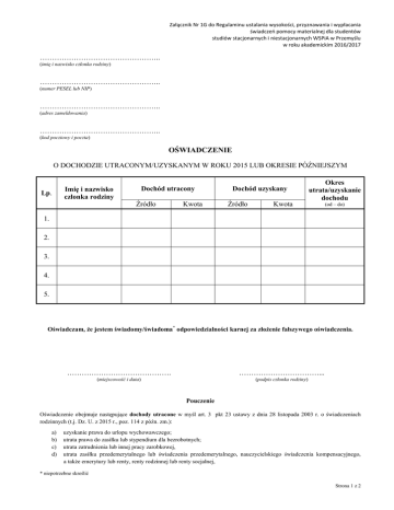 Załącznik Nr 1G do Regulaminu ustalania wysokości, przyznawania i wypłacania świadczeń pomocy materialnej dla studentów studiów stacjonarnych i niestacjonarnych WSPiA w Przemyślu w roku akademickim 2016/2017 ………………………………………….. (imię i nazwisko członka rodziny) ………………………………………….. (numer PESEL lub NIP) ………………………………………….. (adres zameldowania) ………………………………………….. (kod pocztowy i poczta) OŚWIADCZENIE O DOCHODZIE UTRACONYM/UZYSKANYM W ROKU 2015 LUB OKRESIE PÓŹNIEJSZYM Lp. Imię i nazwisko członka rodziny Dochód utracony Źródło Kwota Dochód uzyskany Źródło Okres utrata/uzyskanie dochodu Kwota (od – do) 1. 2. 3. 4. 5. Oświadczam, że jestem świadomy/świadoma* odpowiedzialności karnej za złożenie fałszywego oświadczenia. ……………………………………. ……………………………... (miejscowość i data) (podpis członka rodziny) Pouczenie Oświadczenie obejmuje następujące dochody utracone w myśl art. 3 pkt 23 ustawy z dnia 28 listopada 2003 r. o świadczeniach rodzinnych (t.j. Dz. U. z 2015 r., poz. 114 z późn. zm.): a) b) c) d) uzyskanie prawa do urlopu wychowawczego; utrata prawa do zasiłku lub stypendium dla bezrobotnych; utrata zatrudnienia lub innej pracy zarobkowej, utrata zasiłku przedemerytalnego lub świadczenia przedemerytalnego, nauczycielskiego świadczenia kompensacyjnego, a także emerytury lub renty, renty rodzinnej lub renty socjalnej, * niepotrzebne skreślić Strona 1 z 2 e) f) g) h) i) j) wyrejestrowanie pozarolniczej działalności gospodarczej lub zawieszenie jej wykonywania w rozumieniu art. 14 a ust. 1d ustawy z dnia 2 lipca 2004 o swobodzie działalności gospodarczej (Dz. U. z 2013 r. poz. 672, z późn. zm.); utrata zasiłku chorobowego, świadczenia rehabilitacyjnego lub zasiłku macierzyńskiego przysługujących po utracie zatrudnienia lub innej pracy zarobkowej; utrata zasądzonych świadczeń alimentacyjnych w związku ze śmiercią osoby zobowiązanej do tych świadczeń lub utratą świadczeń pieniężnych wypłacanych w przypadku bezskuteczności egzekucji alimentów w związku ze śmiercią osoby zobowiązanej do świadczeń alimentacyjnych; utratą świadczenia rodzicielskiego; utratą zasiłku macierzyńskiego, o którym mowa w przepisach o ubezpieczeniu społecznym rolników; utratą stypendium doktoranckiego określonego w art. 200 ust. 1 ustawy z dnia 27 lipca 2005 r. –Prawo o szkolnictwie wyższym. Oświadczenie obejmuje następujące dochody uzyskane w myśl art.3, pkt 24 ustawy z dnia 28 listopada 2003r. o świadczeniach rodzinnych (t.j Dz.U. z 2015 r., poz. 114 z późn. zm.): a) b) c) d) e) f) g) h) i) zakończenie urlopu wychowawczego; uzyskanie prawa do zasiłku lub stypendium dla bezrobotnych; uzyskanie zatrudnienia lub innej pracy zarobkowej; uzyskanie zasiłku przedemerytalnego lub świadczenia przedemerytalnego, nauczycielskiego świadczenia kompensacyjnego, a także emerytury lub renty, renty rodzinnej lub renty socjalnej; rozpoczęcie pozarolniczej działalności gospodarczej lub wznowienie jej wykonywania w rozumieniu art. 14a ust.1d ustawy z dnia 2 lipca 2004 r. o swobodzie działalności gospodarczej; uzyskanie zasiłku chorobowego, świadczenia rehabilitacyjnego lub zasiłku macierzyńskiego, przysługujących po utracie zatrudnienia lub innej pracy zarobkowej; uzyskaniem świadczenia rodzicielskiego; uzyskaniem zasiłku macierzyńskiego, o którym mowa w przepisach o ubezpieczeniu społecznym rolników; uzyskaniem stypendium doktoranckiego określonego w art. 200 ust. 1 ustawy z dnia 27 lipca 2005 r. –Prawo o szkolnictwie wyższym. Strona 2 z 2