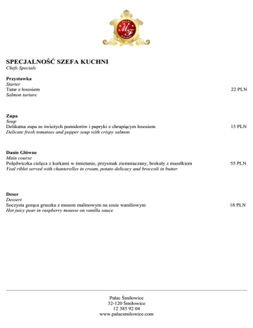 SPECJALNOŚĆ SZEFA KUCHNI Chefs Specials Przystawka Starter Tatar z łososiem Salmon tartare 22 PLN Zupa Soup Delikatna zupa ze świeżych pomidorów i papryki z chrupiącym łososiem Delicate fresh tomatoes and pepper soup with crispy salmon Danie Główne Main course Polędwiczka cielęca z kurkami w śmietanie, przysmak ziemniaczany, brokuły z masełkiem Veal riblet served with chanterelles in cream, potato delicacy and broccoli in butter Deser Dessert Soczysta gorąca gruszka z musem malinowym na sosie waniliowym Hot juicy pear in raspberry mousse on vanilla sauce Pałac Śmiłowice 32-120 Śmiłowice 12 385 92 04 www.palacsmilowice.com 15 PLN 55 PLN 18 PLN PRZYSTAWKI Starters Tatar z łososiem Salmon tartare 22 PLN Marynowany śledź z cebulką, pieczarkami i gruszką 15 PLN Befsztyk tatarski 25 PLN Marinated herring with onion, champignons and pear Steak tartare Pikantna pierś z kurczaka na sałacie z chrupiącym bekonem i warzywami 18 PLN Sałata latem pachnąca z serem sałatkowym, pomidorem, ogórkiem, papryką i sosem miodowo musztardowym 15 PLN Spicy chicken breast on lettuce with crunchy bacon and vegetables Summer breeze salad with cheese., tomato, cucumber, red pepper and honey-mustard sauce Krewetki smażone na maśle czosnkowym z piertuszką i grzankami Shrimps fried in garlic butter served with parsley and croutons 38 PLN Gorąca zakąska z grzybów leśnych z zapiekanymi tostami Hot appetizer from wild mushrooms served with toasts 22 PLN Pałac Śmiłowice 32-120 Śmiłowice 12 385 92 04 www.palacsmilowice.com ZUPY Soups Rosół z makaronem własnej produkcji Chicken soup with pasta own production 10 PLN Bulion czosnkowo-pietruszkowy z pierożkami mięsno-grzybowymi 12 PLN Delikatna zupa ze świeżych pomidorów i papryki z chrupiącym łososiem 15 PLN Garlic and parsley broth served with mushroom-meat dumplings Delicate fresh tomatoes and pepper soup with crispy salmon Kremowa zupa z borowików z plackami ziemniaczanymi 15 PLN Zupa cebulowo-serowa z grzybkami i grzankami czosnkowymi 12 PLN Delicate boletus mushroom soup served with potato pancakes Cheese and onion soup served with mushrooms and garlic croutons Barszcz czerwony z krokietem z kapustą i grzybami, lub z mięsem Beetroot soup served with cabbage-mushroom or meat croquette 10 PLN PRZYSMAK DAMSKI Women's delicacy Chrupiący placek ziemniaczany z filetem kurczaka, warzywami i dipem ogórkowo-czosnkowym Crunchy potato pancake with chicken fillet, served with vegetables and cucumber-garlic dip 25 PLN PRZYSMAK MĘSKI Man's delicacy Dziki gulasz z warzywami i pieczywem 30 PLN Wild goulash served with vegetables and bread Pałac Śmiłowice 32-120 Śmiłowice 12 385 92 04 www.palacsmilowice.com DANIA MIĘSNE Meat Dish Delikatny stek z polędwicy wołowej marynowany w przyprawach z masłem pietruszkowym, frytki stekowe, warzywa z patelni 55 PLN Tender beef riblet steak, marinated in spices and parsley butter, served with steak fries and skillet vegetables Filet z kaczki z jabłkiem i sosem żurowinowo-wiśniowym z kopytkami, buraczki glazurowane 38 PLN Polędwiczka wieprzowa, sos z borowików, ziemniaki podsmażane na maśle z cebulką, sałatka z czerwonej kapusty z jabłkiem i rodzynkami 38 PLN Polędwiczka cielęca z kurkami w śmietanie, przysmak ziemniaczany, brokuły z masełkiem 55 PLN Duck fillet with apple and cherry-cranberry sauce, served with potato dumplings and glazed beetroots Pork riblet in boletus mushroom sauce, served with butter fried potatoes with onion, red cabbage salad with apple and raisins Veal riblet served with chanterelles in cream, potato delicacy and broccoli in butter Wykwintny kotlet schabowy z kością, jabłko pieczone, ziemniaki puree, zasmażana kapusta kiszona 28 PLN Fine pork chop with bone, served with baked apple, potato puree and fried sauerkraut Polędwiczki z kurczaka na fasolce szparagowej, frytki, dip majonezowy, pieczarki w śmietanie 28 PLN Udko królicze w śmietanie, ziemniaki puree, buraczki na ciepło Leg of rabbit in cream, served with potato puree and warm beetroots 38 PLN Chicken riblets on green beans, served with mayonnaise dip and champignons in cream Pałac Śmiłowice 32-120 Śmiłowice 12 385 92 04 www.palacsmilowice.com RYBY Fishes Filet z sandacza smażony z podgrzybkami i szpinakiem w śmietanie,opiekane ziemniaczane puree 40 PLN Zander fillet fried served with boletus mushroom and spinach in cream and baked potato puree Aromatyczna soczysta polędwiczka z dorsza z dodatkiem świeżych warzyw i owoców, ćwiartki ziemniaczane, dip koperkowy 35 PLN Aromatic and juicy cod fillet with addition of fresh vegetables and fruit, potato quarters and dill dip Pstrąg a`la ochmistrz Pałacu, smażony na maśle z płatkami migdałów, sos cebulowo-śmietanowy, frytki, dip chrzanowy z jabłkiem palace steward's trout, fried in butter with almond flakes, served in onion and cream sauce, chips and horseradish dip with apple 30 PLN DANIA WEGETARIAŃSKIE Vegetarian dishes Warzywa gotowane na parze z masełkiem 15 PLN Steamed vegetables with butter Warzywa z patelni zapiekane serem 15 PLN Skillet vegetables baked with cheese Kompozycja Pierogów ( ruskie, z kapustą ) 18 PLN Pierogi z śliwą kalifornijską i masełkiem 15 PLN Selection of dumplings (potato-cheese, cabbage) Californian plum dumplings in butter Pałac Śmiłowice 32-120 Śmiłowice 12 385 92 04 www.palacsmilowice.com PIEROGI Dumplings Zestaw Pałacowych pierogów ( mięso, ruskie, kapusta) Set of palace dumplings (with meat, potato-cheese, cabbage) 20 PLN Pierogi z mięsem 18 PLN Meat dumplings Pierogi z łososiem i szpinakiem z sosem cytrynowo-śmietanowym Salmon and spinach dumplings in lemon-cream sauce 25 PLN DLA DZIECI Children's menu Kotlecik Mamusi, ziemniaki, mizeria 18 PLN Mommy's pork chop, served with chips and cucumber salad Filet z kurczaka z grilla, ziemniaki puree, buraczki Grilled chicken fillet, served with potato puree and beetroots 18 PLN Pierożki z serem i masełkiem na słodko Sw