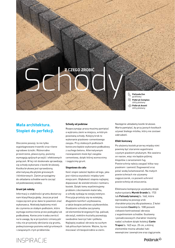 Schody Z CZEGO ZROBIĆ Palisada Zen grafitowy Polbruk Complex żółty płukany Polbruk Avanti żółty płukany Mała architektura. Stopień do perfekcji. Otoczenie posesji, to nie tylko wypielęgnowane trawniki oraz równe ogrodowe ścieżki. Różnorodne przestrzenie, płaszczyzny, poziomy wymagają spójnych przejść i efektownych połączeń. W tej roli doskonale sprawdzają się schody wykonane z kostki brukowej. Kostka brukowa jest sprawdzoną alternatywą dla płytek gresowych i klinkierowych. Zanim przystąpimy do układania schodów warto zacząć od podstawowej wiedzy. Grunt jak należy Informacji o stabilności gruntu dostarczy nam klasyfikacja gleby. Jeszcze przed rozpoczęciem prac dane te powinien znać wykonawca. Niekiedy będziemy mieli do czynienia ze słabym podłożem, które wymaga wzmocnienia przez podsypkę lub podbudowę. Koniecznie trzeba zwrócić na to uwagę, by w przyszłości zmiany pór roku nie przyniosły obniżania się gruntu, podwyższonego poziomu wód gruntowych i związanych z tym problemów. INSPIRACJE Schody od podstaw Rozpoczynając pracę musimy pamiętać o wybraniu ziemi w miejscu, w którym powstaną schody. Kolejny krok to wykonanie piaskowo-cementowego zasypu. Przy słabszych podłożach konieczne będzie wykonanie podbudowy z suchego betonu. Alternatywnym rozwiązaniem może być zasypka cementowa, dzięki której wzmocnimy i zagęścimy grunt. Stopniowo do celu Ilość stopni zależeć będzie od tego, jaka jest różnica wysokości między tymi miejscami. Głębokość stopnia najlepiej dopasować do wielokrotności rozmiaru kostek. Dzięki temu wyeliminujemy problem z docinaniem materiału, a schody zyskają na swojej estetyce. Precyzja przełoży się na estetykę, długoletni komfort użytkowania, a także bezpieczeństwo użytkowników. Osadzanie schodów zaczynamy od elementów brzegowych (np. palisad, obrzeży), niektóre kształty pozwalają swobodnie tworzyć łuki i półkola. Najlepiej osadzać obrzeża na suchym lub półsuchym betonie. Ważne, by nie mocować ich bezpośrednio w ziemi. Następnie układamy kostki brukowe. Warto pamiętać, by przy jasnych kostkach używać białego młotka, który nie zostawi zabrudzeń. Efekt końcowy Po ułożeniu kostek przerwy między nimi powinny być starannie wypełniane czystym piaskiem płukanym. Nie zawiera on nasion, więc nie będzie później kłopotów z zarastaniem fug. Powierzchnię należy zasypać kilka razy piaskiem i zamieść (fugowanie) oraz polać wodą (szlamowanie). Na małych powierzchniach nie używamy zagęszczarek, co pozwoli uchronić powierzchnię od zniszczenia. Efektowne kompozycje uzyskamy dzięki wykorzystaniu Murek Grando (s. 172) lub Palisady łamanej (s. 166), które wprowadzą na posesję urok charakterystyczny dla piaskowca. Z kolei linia kostek Country (s. 108) pozwoli ciekawie kontrastować obrzeża z wypełnieniem schodów. Gustowny i ponadczasowych charakter możemy nadać schodom dzięki kolekcji Canto Trapez (s. 162) wys. 25 cm, a której elementów można układać łuki wewnętrzne i zewnętrzne oraz ciągi proste. Obrzeże Palinea grafitowy Polbruk Beganit szary, grafitowy - płukany Obrzeże Canto Trapez brązowy Polbruk Granito hawaii, latte - gładki Polbruk Carmino latte gładki INSPIRACJE