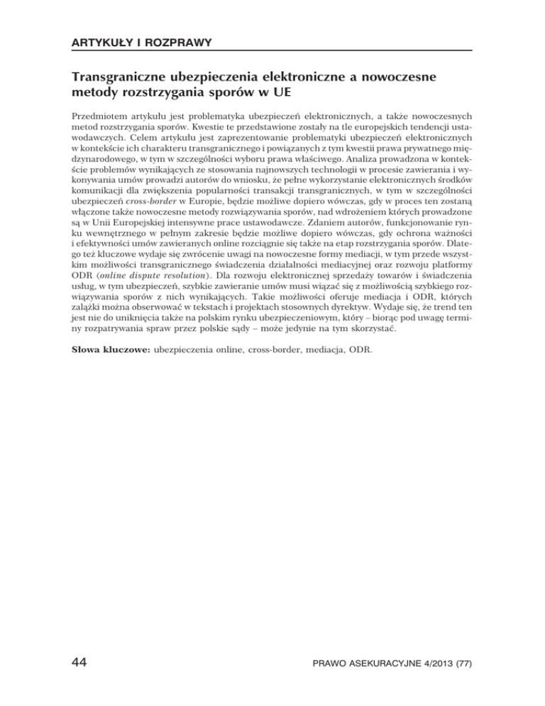 ARTYKU£Y I ROZPRAWY Transgraniczne ubezpieczenia elektroniczne a nowoczesne metody rozstrzygania sporów w UE Przedmiotem artyku³u jest problematyka ubezpieczeñ elektronicznych, a tak¿e nowoczesnych metod rozstrzygania sporów. Kwestie te przedstawione zosta³y na tle europejskich tendencji ustawodawczych. Celem artyku³u jest zaprezentowanie problematyki ubezpieczeñ elektronicznych w kontekœcie ich charakteru transgranicznego i powi¹zanych z tym kwestii prawa prywatnego miêdzynarodowego, w tym w szczególnoœci wyboru prawa w³aœciwego. Analiza prowadzona w kontekœcie problemów wynikaj¹cych ze stosowania najnowszych technologii w procesie zawierania i wykonywania umów prowadzi autorów do wniosku, ¿e pe³ne wykorzystanie elektronicznych œrodków komunikacji dla zwiêkszenia popularnoœci transakcji transgranicznych, w tym w szczególnoœci ubezpieczeñ cross-border w Europie, bêdzie mo¿liwe dopiero wówczas, gdy w proces ten zostan¹ w³¹czone tak¿e nowoczesne metody rozwi¹zywania sporów, nad wdro¿eniem których prowadzone s¹ w Unii Europejskiej intensywne prace ustawodawcze. Zdaniem autorów, funkcjonowanie rynku wewnêtrznego w pe³nym zakresie bêdzie mo¿liwe dopiero wówczas, gdy ochrona wa¿noœci i efektywnoœci umów zawieranych online rozci¹gnie siê tak¿e na etap rozstrzygania sporów. Dlatego te¿ kluczowe wydaje siê zwrócenie uwagi na nowoczesne formy mediacji, w tym przede wszystkim mo¿liwoœci transgranicznego œwiadczenia dzia³alnoœci mediacyjnej oraz rozwoju platformy ODR (online dispute resolution). Dla rozwoju elektronicznej sprzeda¿y towarów i œwiadczenia us³ug, w tym ubezpieczeñ, szybkie zawieranie umów musi wi¹zaæ siê z mo¿liwoœci¹ szybkiego rozwi¹zywania sporów z nich wynikaj¹cych. Takie mo¿liwoœci oferuje mediacja i ODR, których zal¹¿ki mo¿na obserwowaæ w tekstach i projektach stosownych dyrektyw. Wydaje siê, ¿e trend ten jest nie do unikniêcia tak¿e na polskim rynku ubezpieczeniowym, który – bior¹c pod uwagê terminy rozpatrywania spraw przez polskie s¹dy – mo¿e jedynie na tym skorzystaæ. S³owa kluczowe: ubezpieczenia online, cross-border, mediacja, ODR. 44 PRAWO ASEKURACYJNE 4/2013 (77)