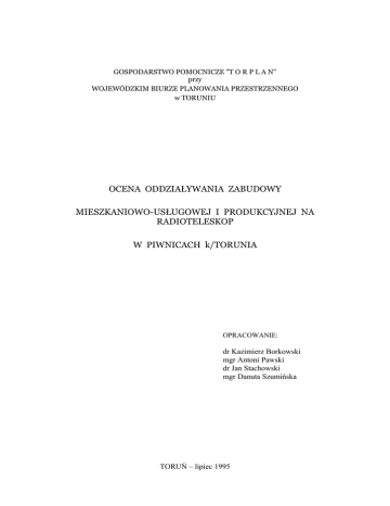 GOSPODARSTWO POMOCNICZE "T O R P L A N" przy WOJEWÓDZKIM BIURZE PLANOWANIA PRZESTRZENNEGO w TORUNIU OCENA ODDZIAŁYWANIA ZABUDOWY MIESZKANIOWO-USŁUGOWEJ I PRODUKCYJNEJ NA RADIOTELESKOP W PIWNICACH k/TORUNIA OPRACOWANIE: dr Kazimierz Borkowski mgr Antoni Pawski dr Jan Stachowski mgr Danuta Szumińska TORUŃ – lipiec 1995 SPIS TREŚCI 1. Wprowadzenie ........................................................................................ 2 2. Charakterystyka Radioteleskopu RT4 …............................................. 2 2.1. Budowa RT4 …................................................................................ 3 2.2. Wyposażenie RT4 …........................................................................... 4 2.3. Znaczenie i zastosowanie RT4 .......................................................... 4 3. Użytkowanie i zagospodarowanie terenu w otoczeniu radioteleskopu ....................................................................................... 5 3.1. Stan istniejący …..…............................................................................ 5 3.1.1. Położenie i warunki naturalne ….................................................... 5 3.1.2. Przemysł, bazy i składy ….............................................................. 6 3.1.3. Rolnictwo i leśnictwo …................................................................ 6 3.1.4. Ludność .…..................................................................................... 7 3.1.5. Infrastruktura społeczno-ekonomiczna …..…............................... 8 3.1.6. Infrastruktura techniczna …......................................................... 9 3.2. Plany zagospodarowania przestrzennego ….................................... 10 3.3. Inne zamierzenia ….....…................................................................... 10 4. Oddziaływanie zagospodarowania terenu na pracę radioteleskopu ….................................................................................. 11 4.1. Charakterystyka zakłóceń pracy radioteleskopów …......................... 11 4.2. Miejscowe źródła zakłóceń pracy radioteleskopu RT4 w Piwnicach ..…...….......................................................................... 12 5. Sposoby ograniczenia negatywnych wpływów zabudowy na pracę radioteleskopu ….….…......................................... 13 6. Wnioski …............................................................................................. 16 Ważniejsze opracowania i źródła statystyczne wykorzystane przy sporządzeniu opracowania …......…....................... 18 Tabele …................................................................................................. 19 1 1. WPROWADZENIE W Piwnicach /gm. Łysomice/ ukończono jedną z największych inwestycji naukowych w Polsce - budowę jednego z najnowocześniejszych w Europie radioteleskopów 32 m anteny parabolicznej. Kilkusetmiliardowa inwestycja /w starych złotych/ z budżetu państwa i ze środków zagranicznych na realizację radioteleskopu i wyposażenie w nowoczesną, czułą aparaturę kontrolno-pomiarową, umożliwia prowadzenie badań radioastronomicznych w Polsce na poziomie światowym. Powstał unikalny i jedyny tak nowoczesny instrument w Europie środkowo-wschodniej. Jednak dla zapewnienia prawidłowej pracy radioteleskopu niezbędne jest utrzymanie możliwie najniższego poziomu zakłóceń radiowych w jego otoczeniu - wprowadzenie strefy ciszy radiowej. Zabudowa wiejska otaczająca radioteleskop od zachodu, północy i wschodu w swej ilości nie stanowi znacznego problemu. Od strony południowej znaczny kompleks leśny skutecznie chroni go przed ,,szkodliwym” wpływem zabudowy Torunia. Jednak ostatnie wykupy ziemi w bezpośrednim sąsiedztwie radioteleskopu, w celu realizacji zabudowy jednorodzinnej, budzą zdecydowany sprzeciw władz Uniwersytetu Mikołaja Kopernika. Powstanie nowych osiedli mieszkalnych wyposażonych w elektronikę użytkową stworzy wysoki poziom zakłóceń radiowych zabójczy dla prowadzenia i rozwoju badań radioastronomicznych. W konsekwencji grozi to wyłączeniem tego nowoczesnego instrumentu ze światowej sieci radioteleskopów, a wieloletni wysiłek inwestycyjny zostanie zniweczony. Stąd w niniejszym opracowaniu próba oceny oddziaływania zabudowy mieszkaniowo-usługowej i produkcyjnej na radioteleskop w aktualnym stanie zainwestowania oraz po realizacji planowanej zabudowy. Autorzy, zdają sobie sprawę z pewnej niedoskonałości tego opracowania wynikającej z unikalności problemu, z którym w Polsce spotykamy się poraz pierwszy. Celem oceny jest stworzenie wytycznych dla nowej edycji miejscowego planu zagospodarowania przestrzennego gminy Łysomice, w zakresie ograniczenia negatywnego wpływu zagospodarowania na radioteleskop, szczególnie w rejonie jego lokalizacji. Na koniec jedna uwaga. Zwrot ,,ocena wpływu zabudowy” jest oczywiście skrótem myślowym, gdyż zabudowa sama w sobie negatywnie nie oddziaływuje na pracę radioteleskopu. Oczywistym jest natomiast, że budownictwo mieszkaniowe, usługowe i produkcyjne przyczynia się do instalacji wielu urządzeń służących w gospodarstwach domowych, usługach i produkcji. To one właśnie są głównym zagrożeniem. 2. CHARAKTERYSTYKA RADIOTELESKOPU – RT4 Omawiany instrument jest narzędziem badawczym w dziedzinie radioastronomii. Dziedzina ta zajmuje się badaniem pozaziemskich obiektów poprzez odbiór i analizę ich emisji elektromagnetycznej w zakresie radiowym. Radioastronomia w fundamentalny sposób przyczynia się do lepszego rozumienia Wszechświata otaczającego Ziemię, a z drugiej strony pozwala naukowcom badać warunki fizyczne i procesy, które nie mogą być symulowane w żadnym laboratorium. Radioteleskop jest urządzeniem służącym do odbioru i analizy sygnałów radiowych pochodzących z naturalnych źródeł kosmicznych. Wiadomo, że materia po