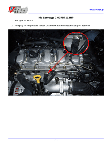 www.vtech.pl ____________________________________________________________________________ Kia Sportage 2.0CRDi 113HP 1. Box type: VT101201. 2. Find plug for rail pressure sensor. Disconnect it and connect box adapter between. ___________________________________________________________________________________________ -1-