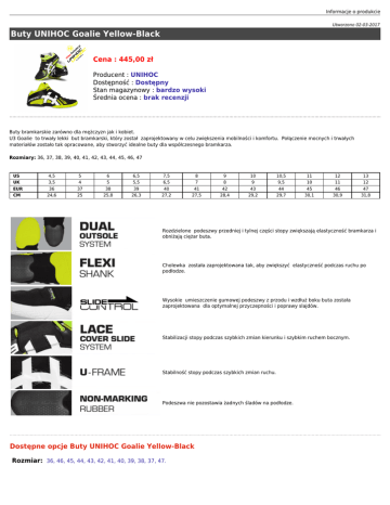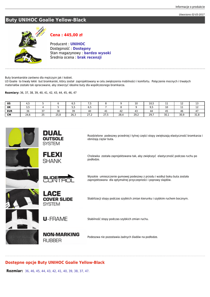 Informacje o produkcie Utworzono 02-03-2017 Buty UNIHOC Goalie Yellow-Black Cena : 445,00 zł Producent : UNIHOC Dostępność : Dostępny Stan magazynowy : bardzo wysoki Średnia ocena : brak recenzji Buty bramkarskie zarówno dla mężczyzn jak i kobiet. U3 Goalie to trwały lekki but bramkarski, który został zaprojektowany w celu zwiększenia mobilności i komfortu. Połączenie mocnych i trwałych materiałów zostało tak opracowane, aby stworzyć idealne buty dla współczesnego bramkarza. Rozmiary: 36, 37, 38, 39, 40, 41, 42, 43, 44, 45, 46, 47 US UK EUR CM 4,5 3,5 36 24,6 5 4 37 25 6 5 38 25,8 6,5 5,5 39 26,3 7,5 6,5 40 27,2 8 7 41 27,5 9 8 42 28,4 10 9 43 29,2 10,5 9,5 44 29,7 11 10 45 30,1 12 11 46 30,9 13 12 47 31,8 Rozdzielone podeszwy przedniej i tylnej części stopy zwiększają elastyczność bramkarza i obniżają ciężar buta. Cholewka została zaprojektowana tak, aby zwiększyć elastyczność podczas ruchu po podłodze. Wysokie umieszczenie gumowej podeszwy z przodu i wzdłuż boku buta została zaprojektowana dla optymalnej przyczepności i poprawy slajdów. Stabilizacji stopy podczas szybkich zmian kierunku i szybkim ruchem bocznym. Stabilność stopy podczas szybkich zmian ruchu. Podeszwa nie pozostawia żadnych śladów na podłodze. Dostępne opcje Buty UNIHOC Goalie Yellow-Black Rozmiar: 36, 46, 45, 44, 43, 42, 41, 40, 39, 38, 37, 47.