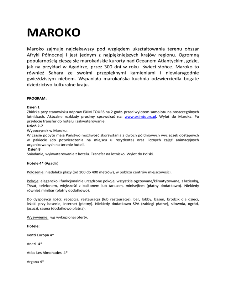 MAROKO Maroko zajmuje najciekawszy pod względem ukształtowania terenu obszar Afryki Północnej i jest jednym z najpiękniejszych krajów regionu. Ogromną popularnością cieszą się marokaoskie kurorty nad Oceanem Atlantyckim, gdzie, jak na przykład w Agadirze, przez 300 dni w roku świeci słooce. Maroko to również Sahara ze swoimi przepięknymi kamieniami i niewiarygodnie gwieździstym niebem. Wspaniała marokaoska kuchnia odzwierciedla bogate dziedzictwo kulturalne kraju. PROGRAM: Dzień 1 Zbiórka przy stanowisku odpraw EXIM TOURS na 2 godz. przed wylotem samolotu na poszczególnych lotniskach. Aktualne rozkłady prosimy sprawdzad na: www.eximtours.pl. Wylot do Maroka. Po przylocie transfer do hotelu i zakwaterowanie. Dzień 2-7 Wypoczynek w Maroku. W czasie pobytu mają Paostwo możliwośd skorzystania z dwóch półdniowych wycieczek dostępnych w pakiecie (do potwierdzenia na miejscu u rezydenta) oraz licznych zajęd animacyjnych organizowanych na terenie hoteli. Dzień 8 Śniadanie, wykwaterowanie z hotelu. Transfer na lotnisko. Wylot do Polski. Hotele 4* (Agadir) Położenie: niedaleko plaży (od 100 do 400 metrów), w pobliżu centrów miejscowości. Pokoje: elegancko i funkcjonalnie urządzone pokoje, wszystkie ogrzewane/klimatyzowane, z łazienką, TVsat, telefonem, większośd z balkonem lub tarasem, minisejfem (płatny dodatkowo). Niekiedy również minibar (płatny dodatkowo). Do dyspozycji gości: recepcja, restauracja (lub restauracje), bar, lobby, basen, brodzik dla dzieci, leżaki przy basenie, Internet (płatny). Niekiedy dodatkowo SPA (zabiegi płatne), siłownia, ogród, jacuzzi, sauna (dodatkowo płatna). Wyżywienie: wg wykupionej oferty. Hotele: Kenzi Europa 4* Anezi 4* Atlas Les Almohades 4* Argana 4* ŚWIADCZENIA: Cena obejmuje: przelot do/z Maroka + opłaty lotniskowe transfer do/z hotelu 7 rozpoczętych dób hotelowych wyżywienie zgodnie z zakupioną ofertą hotelową (HB lub All inclusive) opiekę polskojęzycznego rezydenta opiekę przedstawiciela Exim Tours na lotnisku w Polsce 2 półdniowe wycieczki: City tour - zwiedzanie rozpoczyna wizyta w północnej części miasta – Kasbah skąd roztacza się piękna panorama miasta oraz urzekający widok na najważniejszy w południowym Maroku morski port handlowy. Kontynuujemy nasze zwiedzanie oglądając centrum Agadiru, jego willowe dzielnice oraz centrum z pełne nowoczesnych budynków i kawiarenek. Zatrzymamy się na lokalnym targowisku, czyli suku gdzie będzie możliwośd zakupu pamiątek w tym marokaoskich rękodzieł. Manufaktura drzewa arganowego – poznamy sekrety tworzenia oleju arganowego, które nazywane jest Drzewem Życia lub Złotem Maroka. Olej ten otrzymywany jest z nasion drzewa arganowego, występującego wyłącznie w Afryce, w południowo-zachodniej części Maroko. Porasta ono od milionów lat między Agadirem, Marrakeszem i Essaouria oraz w pobliżu Oujda. Produkcja oleju zgodnie z tradycją wykonywana jest na wsiach głównie przez kobiety. Od 1998 roku obszary na którym rosną, został wpisany na listę rezerwatów biosferycznych UNESCO. Olej arganowy jest najbogatszym we właściwości pielęgnacyjne olejem produkowanym obecnie na świecie. Podczas wycieczki będziemy mieli okazję kupid ten marokaoski specyfik. ubezpieczenie Europaische Reiseversicherung AG (wersja standard: NW, KL, bagażu i CP). UWAGA!! ZASADY KORZYSTANIA Z PROGRAMU: Oferta skierowana jest dla polskich seniorów w wieku powyżej 50 lat, minimum jedna osoba w pokoju musi spełniad kryterium wiekowe. Dopłata 3 osoby w pokoju dwuosobowym wg aktualnej oferty w systemie rezerwacyjnym Blue Vendo. Zakwaterowanie w 4 wybranych hotelach w Maroku (Agadir) WYCIECZKI FAKULTATYWNE Szczegółowy opis wycieczek na str. 160 – 161