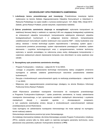 Załącznik nr 9 do SIWZ [Znak sprawy: 1/ZP/2016] SZCZEGÓŁOWY OPIS PRZEDMIOTU ZAMÓWIENIA 1. Lokalizacja terenu przewidzianego pod inwestycję: Przedmiotowa inwestycja będzie realizowana na terenie Zakładu Zagospodarowania Odpadów Komunalnych w Adamkach k. Radzynia Podlaskiego na części działki o numerze ewidencyjnym: 12/1, Biała 185b, Obręb 0019 Zabiele, gmina Radzyń Podlaski, powiat radzyński, województwo lubelskie. 2. Zakres przedmiotu zamówienia obejmuje w szczególności: wykonanie kompostowni do stabilizacji tlenowej frakcji o wielkości co najmniej 0-80 mm ulegającej biodegradacji wydzielonej ze zmieszanych odpadów komunalnych, kompostowania selektywnie zbieranych odpadów biodegradowalnych kuchennych i z pielęgnacji terenów zielonych, kompostowania ustabilizowanych komunalnych osadów ściekowych oraz suszenia RDF – roboty budowlane oraz zakup, dostawa i montaż technologii (system napowietrzania i wentylacji, system ujęcia i oczyszczenia powietrza procesowego, system odprowadzania powstających odcieków, system sterowania i czujników technologicznych wraz z oprogramowaniem, kontener techniczny wykonany w sposób pozwalający na całoroczną pracę osoby obsługującej kompostownię) z częściowo zadaszonym placem dojrzewania kompostu oraz zbiornikami na wody opadowe oraz odcieki. 3. Szczegółowy opis przedmiotu zamówienia określają: Program Funkcjonalno – Użytkowy – załącznik Nr 10 do SIWZ, (Uwaga: w przypadku zastosowania technologii równoważnej należy uwzględnić zmienione wymagania w zakresie ustalania geotechnicznych warunków posadowienia obiektów budowlanych) Decyzja o środowiskowych uwarunkowaniach zgody na realizację przedsięwzięcia – załącznik Nr 11 do SIWZ, Miejscowy plan zagospodarowania przestrzennego (dostępny na stronie Biuletynu Informacji Publicznej Gminy Radzyń Podlaski) Jeżeli Wykonawca przedstawi rozwiązanie równoważne do rozwiązania przewidzianego w Programie Funkcjonalno-Użytkowym i opisie przedmiotu zamówienia, to koszty zatwierdzenia rozwiązania równoważnego, w tym opracowania wszelkich niezbędnych dokumentacji i uzyskania niezbędnych decyzji i zezwoleń zgodnie z obowiązującymi przepisami, w tym uzyskania ewentualnej zmiany decyzji o środowiskowych uwarunkowaniach realizacji przedsięwzięcia ponosi Wykonawca. Czas wymagany do zatwierdzenia rozwiązania równoważnego nie może wpłynąć na wymagany termin realizacji zadania. Dokumentacja zatwierdzona powinna być przez Zamawiającego. Za instalację równoważną instalacji, dla której Zamawiający posiada Program Funkcjonalno–Użytkowy (PFU), zostanie uznana tylko ta, która spełni co najmniej wymagane parametry techniczne, cechy jakościowe oraz parametry użytkowe i funkcjonalne określone w PFU. 1 Załącznik nr 9 do SIWZ [Znak sprawy: 1/ZP/2016] 3. Wymagania w zakresie technicznym i technologicznym Obiekt kompostowni stanowić powinien system co najmniej czterech modułów - tuneli żelbetowych wyposażonych w elementy technologiczne, w których następuje stabilizacja i higienizacja wsadu (reaktory zamknięte). Wsad dostarczany będzie do bioreaktorów przy pomocy ładowarki kołowej. Części budowlane kompostowni tunelowej powinien stanowić obiekt jednokondygnacyjny. Kompostownia podzielona powinna być na min. 4 żelbetowe boksy o wymiarach: zgodnych z opisem w Programie Funkcjonalno–Użytkowym. Za tylną ścianą szeregu boksów powinny znajdować się wentylatory. Części budowlane kompostowni tunelowej powinny stanowić żelbetowe ściany oporowe zamocowane w żelbetowej płycie dennej pełniącej jednocześnie funkcję posadowienia i posadzki. Ściany reaktora (szczególnie tylna) poza obciążeniem ładunkiem powinna przenosić uderzenia ładowarki. Posadzka tuneli powinna mieć powierzchnię przeciwślizgową zapobiegającą poślizgom ładowarki podczas manewrowania. Ściany wewnątrz bioreaktorów nie powinny zawierać żadnych występów, zwężeń lub elementów konstrukcyjnych, które mogłyby być uszkodzone w trakcie załadunku lub rozładunku tunelu ładowarką. Każdy tunel powinien być niezależny (zamknięcie, napowietrzanie, wyciąg zanieczyszczonego powietrza do biofiltra, sterowanie procesem oraz monitoring). Wykonawca jest zobowiązany do dostawy i montażu elementów technologicznych kompostowni, w tym kompletnego systemu napowietrzania (w tym przewodów wentylacyjnych, wentylatorów, stalowych elementów konstrukcyjnych, wyposażenie kanałów w posadzce), systemu ujęcia i oczyszczenia powietrza procesowego, kompletnego dachu w konstrukcji żelbetowej lub w przypadku zastosowania dachu z tworzywa sztucznego – podwójnego (w tym stalowej konstrukcji nośnej, powłok dachowych, systemu odprowadzenia wody deszczowej), drzwi, systemu sterowania wraz z odpowiednim oprogramowaniem oraz sond pomiarowych nasycenia tlenem i innych czujników. Wytyczne i parametry elementów określono poniżej: Napowietrzanie Podstawowym elementem kompostowni jest system napowietrzania gwarantujący równomierne napowietrzanie pryzm w tunelach. Napowietrzanie powinno odbywać się poprzez wdmuchiwanie powietrza za pomocą płyty aeracyjnej, sterowanej w oparciu o parametry takie jak zawartość tlenu, temperatura. System napowietrzania powinien składać się z wentylatorów za pomocą, których przez podłogę napowietrzającą wtłaczane jest powietrze o temperaturze zewnętrznej lub podgrzane (opcjonalnie) oraz kanałów napowietrzania zapewniających odpowiednie równomierne napowietrzenie stabilizowanych odpadów. Powietrze wdmuchiwane powinno być z min. 7 wymianami powietrza na godzinę. Do transportu powietrza do wewnątrz komór należy zastosować wentylator promieniowy, który umożliwi przeciwdziałanie stracie ciśnienia wywołanej poprzez stabilizowany materiał. Każdy reaktor (moduł) powinien być obsługiwany przez oddzielny wentylator. Napowietrzanie powinno odbywać się poprzez cykliczną pracę wenty