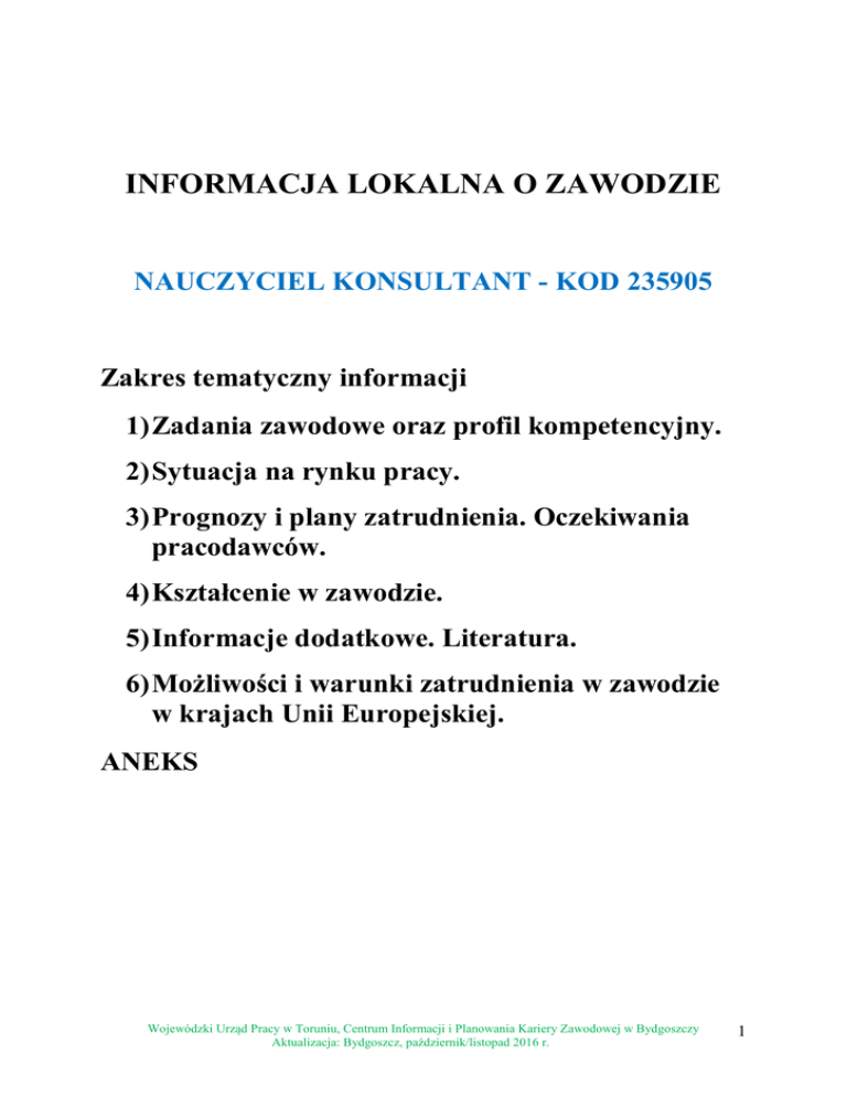 INFORMACJA LOKALNA O ZAWODZIE NAUCZYCIEL KONSULTANT - KOD 235905 Zakres tematyczny informacji 1) Zadania zawodowe oraz profil kompetencyjny. 2) Sytuacja na rynku pracy. 3) Prognozy i plany zatrudnienia. Oczekiwania pracodawców. 4) Kształcenie w zawodzie. 5) Informacje dodatkowe. Literatura. 6) Możliwości i warunki zatrudnienia w zawodzie w krajach Unii Europejskiej. ANEKS Wojewódzki Urząd Pracy w Toruniu, Centrum Informacji i Planowania Kariery Zawodowej w Bydgoszczy Aktualizacja: Bydgoszcz, październik/listopad 2016 r. 1 Nauczyciel konsultant to jeden to jeden z 2443 zawodów ujętych w obowiązującej od 01 stycznia 2015 r. klasyfikacji zawodów i specjalności na potrzeby rynku pracy (Dz. U. z 2014 r., poz. 114) opatrzony kodem 235905. W poprzedniej wersji klasyfikacji zawód ten nosił tą samą nazwę ale inny kod (235902). 1) ZADANIA ZAWODOWE ORAZ PROFIL KOMPETENCYJNY1 - diagnozowanie stanu kwalifikacji nauczycieli; - współdziałanie z nadzorem pedagogicznym, nauczycielami doradcami metodycznymi przy określaniu potrzeb doskonalenia nauczycieli; - organizowanie doskonalenia i dokształcania nauczycieli w zakresie specjalistycznym, metodycznym i wychowawczym, we współpracy ze szkołami wyższymi, zakładami kształcenia nauczycieli i innymi instytucjami prowadzącymi działalność edukacyjną; - organizowanie doskonalenia doradców metodycznych, kadry kierowniczej, pracowników nadzoru pedagogicznego i innych pracowników oświaty; - koordynowanie pracy nauczycieli doradców metodycznych oraz udzielanie im merytorycznej i metodycznej pomocy; - zbieranie, opracowywanie i upowszechnianie informacji pedagogicznej; - inspirowanie innowacji, postępu pedagogicznego w szkołach i placówkach oświatowowychowawczych oraz otaczanie tych działań opieką merytoryczną; - propagowanie i upowszechnianie nowych metod, technik i środków w nauczaniu i wychowaniu; - organizowanie wymiany doświadczeń między szkołami i nauczycielami prowadzącymi działalność innowacyjną; - udzielanie pomocy nauczycielom ubiegającym się o stopnie specjalizacji zawodowej; - pozyskiwanie lub opracowywanie oraz wydawanie i upowszechnianie materiałów metodycznych i pomocniczych dotyczących doskonalenia warsztatu pracy nauczyciela i postępu pedagogicznego; - współdziałanie z innymi placówkami doskonalenia nauczycieli. Zadanie dodatkowe: - pełnienie funkcji nadzoru pedagogicznego. PROFIL KOMPETENCYJNY2 dla grupy Specjaliści do spraw nauczania i wychowania (grupa duża3 23) Przykładowe zawody dla grupy Specjaliści do spraw nauczania i wychowania: nauczyciel/instruktor praktycznej nauki zawodu, nauczyciel konsultant, nauczyciel matematyki, nauczyciel muzyki, nauczyciel przedszkola, nauczyciel wychowania fizycznego, pedagog, wykładowca na kursach (edukator, trener), trener osobisty (coach, mentor, tutor), itp. 1 http://psz.praca.gov.pl/rynek-pracy/bazy-danych/klasyfikacja-zawodow-i-specjalnosci/wyszukiwarka-opisow-zawodow (21.08.2015 r.) NBK Narzędzie do badania kompetencji. Podręcznik dla doradców zawodowych, Warszawa 2014 r. 3 Rozporządzenie Ministra Pracy i Polityki Społecznej z dnia 7 sierpnia 2014r. w sprawie klasyfikacji zawodów i specjalności na potrzeby rynku pracy oraz zakresu jej stosowania, DZ.U. z 2014r. poz.1145 2 Wojewódzki Urząd Pracy w Toruniu, Centrum Informacji i Planowania Kariery Zawodowej w Bydgoszczy Aktualizacja: Bydgoszcz, październik/listopad 2016 r. 2 Kompetencje to cechy/dyspozycje osoby, w zakresie wiedzy, umiejętności i postaw, pozwalające realizować zadania zawodowe na wymaganym poziomie/efekty. Kompetencje są obserwowalne i mierzalne dzięki temu, że przejawiają się w zachowaniu. Podlegają procesowi uczenia się, są dynamiczne, zmienne w czasie, rozwijają się w ramach zdobywanego doświadczenia. Pozwalają określić, w jakich zadaniach, na jakim stanowisku, przyszły pracownik będzie mógł efektywnie wykorzystać swój potencjał. Tempo ich rozwoju zależy od zmiennych zewnętrznych (otoczenia) oraz względnie trwałych dyspozycji (osobowość, inteligencja).4 Są uniwersalne (transferowalne), wykorzystywane w różnych zadaniach i różnych obszarach funkcjonowania. Dla grupy Specjaliści do spraw nauczania i wychowania określono 4 kompetencje tj.: Kompetencja 1 – Dbałość o rozwój i relacje: to nawiązywanie i utrzymywanie dobrych relacji oraz przekazywania wiedzy i doświadczenia poprzez współpracę w rozwiązywaniu problemów z korzyścią dla wszystkich. Dostrzeganie współpracowników potrzebujących pomocy i zapewnienie im oczekiwanego wsparcia. Kompetencja 2 – Komunikacja interpersonalna: to przekazywanie konkretnych informacji w sposób zrozumiały dla innych. Przystępne wyjaśnianie skomplikowanych, specjalistycznych kwestii. Przekazywanie najważniejszych zagadnień i sprawdzanie, czy rozmówca rozumie komunikat. Dostosowanie stylu wypowiedzi do odbiorcy. Kompetencja 3 – Otwartość na innych: pozytywne nastawienie i traktowanie innych oraz okazywania chęci ich zrozumienia. Kompetencja 4 – Rozwiązywanie konfliktów: to osiąganie porozumienia i rozstrzyganie sporów w zespole. Zestaw kompetencji może się różnić od podanych wyżej kompetencji, w zależności od wymagań pracodawcy w konkretnym zawodzie i na konkretnym stanowisku. Zróżnicowane będzie również natężenie każdej z kompetencji. Kto i w jaki sposób może wiedzę o naszych kompetencjach można wykorzystać? Odpowiedź jest prosta My Sami oraz pracodawca. Coraz więcej pracodawców wykorzystuje analizę kompetencyjną w procesie rekrutacji. W niektórych firmach dodatkowo jest ona wykorzystywana podczas: okresowej oceny pracowników - jako narzędzie do oceny efektywności pracy; ustalania indywidualnych planów rozwoju - dostarcza informacji, jakie właściwości predysponują do np. awansów. Jest również źródłem informacji odnośnie obecnych i przyszłych potrzeb szkoleniowych. Jeśli stwierdzimy, że nie posiadamy dostateczne