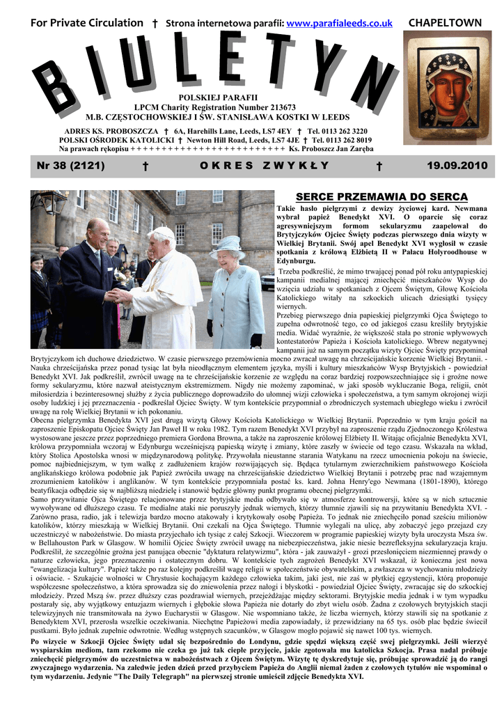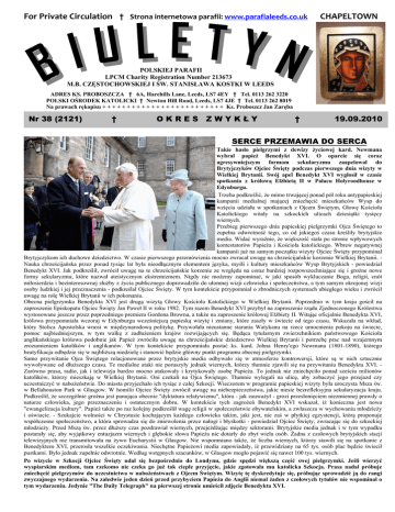 For Private Circulation † Strona internetowa parafii: www.parafialeeds.co.uk CHAPELTOWN POLSKIEJ PARAFII LPCM Charity Registration Number 213673 M.B. CZĘSTOCHOWSKIEJ I ŚW. STANISŁAWA KOSTKI W LEEDS ADRES KS. PROBOSZCZA † 6A, Harehills Lane, Leeds, LS7 4EY † Tel. 0113 262 3220 POLSKI OŚRODEK KATOLICKI † Newton Hill Road, Leeds, LS7 4JE † Tel. 0113 262 8019 Na prawach rękopisu + + + + + + + + + + + + + + + + + + + + + + + + + Ks. Proboszcz Jan Zaręba Nr 38 (2121) † OKRES ZWYKŁY † 19.09.2010 SERCE PRZEMAWIA DO SERCA Takie hasło pielgrzymi z dewizy życiowej kard. Newmana wybrał papież Benedykt XVI. O oparcie się coraz agresywniejszym formom sekularyzmu zaapelował do Brytyjczyków Ojciec Święty podczas pierwszego dnia wizyty w Wielkiej Brytanii. Swój apel Benedykt XVI wygłosił w czasie spotkania z królową Elżbietą II w Pałacu Holyroodhouse w Edynburgu. Trzeba podkreślić, że mimo trwającej ponad pół roku antypapieskiej kampanii medialnej mającej zniechęcić mieszkańców Wysp do wzięcia udziału w spotkaniach z Ojcem Świętym, Głowę Kościoła Katolickiego witały na szkockich ulicach dziesiątki tysięcy wiernych. Przebieg pierwszego dnia papieskiej pielgrzymki Ojca Świętego to zupełna odwrotność tego, co od jakiegoś czasu kreśliły brytyjskie media. Widać wyraźnie, że większość stała po stronie wpływowych kontestatorów Papieża i Kościoła katolickiego. Wbrew negatywnej kampanii już na samym początku wizyty Ojciec Święty przypominał Brytyjczykom ich duchowe dziedzictwo. W czasie pierwszego przemówienia mocno zwracał uwagę na chrześcijańskie korzenie Wielkiej Brytanii. Nauka chrześcijańska przez ponad tysiąc lat była nieodłącznym elementem języka, myśli i kultury mieszkańców Wysp Brytyjskich - powiedział Benedykt XVI. Jak podkreślił, zwrócił uwagę na te chrześcijańskie korzenie ze względu na coraz bardziej rozpowszechniające się i groźne nowe formy sekularyzmu, które nazwał ateistycznym ekstremizmem. Nigdy nie możemy zapominać, w jaki sposób wykluczanie Boga, religii, cnót miłosierdzia i bezinteresownej służby z życia publicznego doprowadziło do ułomnej wizji człowieka i społeczeństwa, a tym samym okrojonej wizji osoby ludzkiej i jej przeznaczenia - podkreślał Ojciec Święty. W tym kontekście przypomniał o zbrodniczych systemach ubiegłego wieku i zwrócił uwagę na rolę Wielkiej Brytanii w ich pokonaniu. Obecna pielgrzymka Benedykta XVI jest drugą wizytą Głowy Kościoła Katolickiego w Wielkiej Brytanii. Poprzednio w tym kraju gościł na zaproszenie Episkopatu Ojciec Święty Jan Paweł II w roku 1982. Tym razem Benedykt XVI przybył na zaproszenie rządu Zjednoczonego Królestwa wystosowane jeszcze przez poprzedniego premiera Gordona Browna, a także na zaproszenie królowej Elżbiety II. Witając oficjalnie Benedykta XVI, królowa przypomniała wczoraj w Edynburgu wcześniejszą papieską wizytę i zmiany, które zaszły w świecie od tego czasu. Wskazała na wkład, który Stolica Apostolska wnosi w międzynarodową politykę. Przywołała nieustanne starania Watykanu na rzecz umocnienia pokoju na świecie, pomoc najbiedniejszym, w tym walkę z zadłużeniem krajów rozwijających się. Będąca tytularnym zwierzchnikiem państwowego Kościoła anglikańskiego królowa podobnie jak Papież zwróciła uwagę na chrześcijańskie dziedzictwo Wielkiej Brytanii i potrzebę prac nad wzajemnym zrozumieniem katolików i anglikanów. W tym kontekście przypomniała postać ks. kard. Johna Henry'ego Newmana (1801-1890), którego beatyfikacja odbędzie się w najbliższą niedzielę i stanowić będzie główny punkt programu obecnej pielgrzymki. Samo przywitanie Ojca Świętego relacjonowane przez brytyjskie media odbywało się w atmosferze kontrowersji, które są w nich sztucznie wywoływane od dłuższego czasu. Te medialne ataki nie poruszyły jednak wiernych, którzy tłumnie zjawili się na przywitaniu Benedykta XVI. Zarówno prasa, radio, jak i telewizja bardzo mocno atakowały i krytykowały osobę Papieża. To jednak nie zniechęciło ponad sześciu milionów katolików, którzy mieszkają w Wielkiej Brytanii. Oni czekali na Ojca Świętego. Tłumnie wylegali na ulicę, aby zobaczyć jego przejazd czy uczestniczyć w nabożeństwie. Do miasta przyjechało ich tysiąc z całej Szkocji. Wieczorem w programie papieskiej wizyty była uroczysta Msza św. w Bellahouston Park w Glasgow. W homilii Ojciec Święty zwrócił uwagę na niebezpieczeństwa, jakie niesie bezrefleksyjna sekularyzacja kraju. Podkreślił, że szczególnie groźna jest panująca obecnie "dyktatura relatywizmu", która - jak zauważył - grozi przesłonięciem niezmiennej prawdy o naturze człowieka, jego przeznaczeniu i ostatecznym dobru. W kontekście tych zagrożeń Benedykt XVI wskazał, iż konieczna jest nowa "ewangelizacja kultury". Papież także po raz kolejny podkreślił wagę religii w społeczeństwie obywatelskim, a zwłaszcza w wychowaniu młodzieży i oświacie. - Szukajcie wolności w Chrystusie kochającym każdego człowieka takim, jaki jest, nie zaś w płytkiej egzystencji, którą proponuje współczesne społeczeństwo, a która sprowadza się do zniewolenia przez nałogi i błyskotki - powiedział Ojciec Święty, zwracając się do szkockiej młodzieży. Przed Mszą św. przez dłuższy czas pozdrawiał wiernych, przejeżdżając między sektorami. Brytyjskie media jednak i w tym wypadku postarały się, aby wyjątkowy entuzjazm wiernych i głębokie słowa Papieża nie dotarły do zbyt wielu osób. Żadna z czołowych brytyjskich stacji telewizyjnych nie transmitowała na żywo Eucharystii w Glasgow. Nie wspomniano także, że liczba wiernych, którzy stawili się na spotkanie z Benedyktem XVI, przerosła wszelkie oczekiwania. Niechętne Papieżowi media zapowiadały, iż przewidziany na 65 tys. osób plac będzie świecił pustkami. Było jednak zupełnie odwrotnie. Według