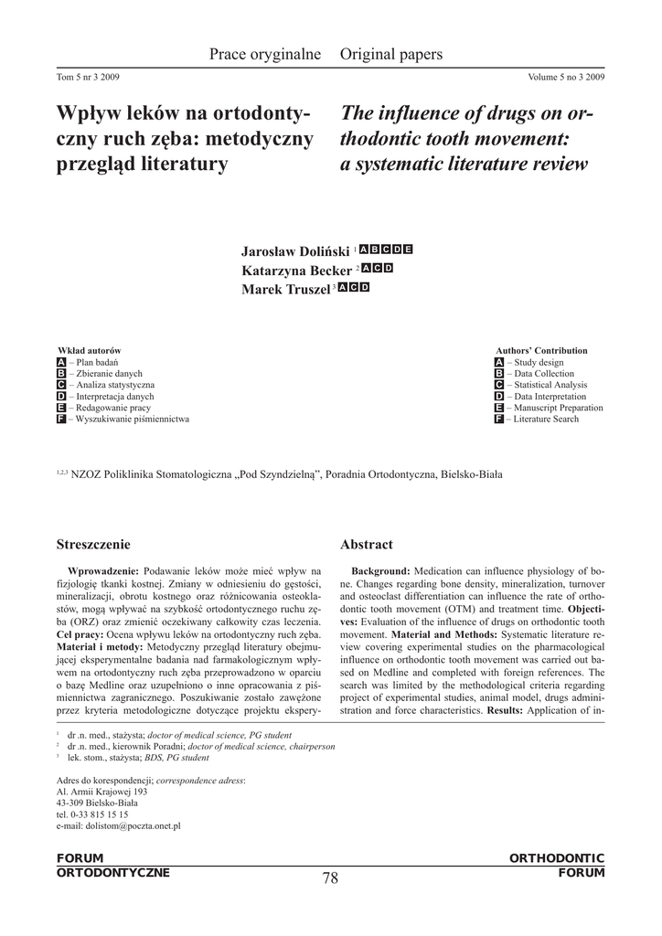 Prace oryginalne Original papers Tom 5 nr 3 2009 Volume 5 no 3 2009 Wpływ leków na ortodontyczny ruch zęba: metodyczny przegląd literatury The influence of drugs on orthodontic tooth movement: a systematic literature review Jarosław Doliński 1 A B C D Katarzyna Becker 2 A C D Marek Truszel 3 A C D Wkład autorów A – Plan badań B – Zbieranie danych C – Analiza statystyczna D – Interpretacja danych E – Redagowanie pracy F – Wyszukiwanie piśmiennictwa 1,2,3 E Authors’ Contribution A – Study design B – Data Collection C – Statistical Analysis D – Data Interpretation E – Manuscript Preparation F – Literature Search NZOZ Poliklinika Stomatologiczna „Pod Szyndzielną”, Poradnia Ortodontyczna, Bielsko-Biała Streszczenie Abstract Wprowadzenie: Podawanie leków może mieć wpływ na fizjologię tkanki kostnej. Zmiany w odniesieniu do gęstości, mineralizacji, obrotu kostnego oraz różnicowania osteoklastów, mogą wpływać na szybkość ortodontycznego ruchu zęba (ORZ) oraz zmienić oczekiwany całkowity czas leczenia. Cel pracy: Ocena wpływu leków na ortodontyczny ruch zęba. Materiał i metody: Metodyczny przegląd literatury obejmującej eksperymentalne badania nad farmakologicznym wpływem na ortodontyczny ruch zęba przeprowadzono w oparciu o bazę Medline oraz uzupełniono o inne opracowania z piśmiennictwa zagranicznego. Poszukiwanie zostało zawężone przez kryteria metodologiczne dotyczące projektu ekspery- Background: Medication can influence physiology of bone. Changes regarding bone density, mineralization, turnover and osteoclast differentiation can influence the rate of orthodontic tooth movement (OTM) and treatment time. Objectives: Evaluation of the influence of drugs on orthodontic tooth movement. Material and Methods: Systematic literature review covering experimental studies on the pharmacological influence on orthodontic tooth movement was carried out based on Medline and completed with foreign references. The search was limited by the methodological criteria regarding project of experimental studies, animal model, drugs administration and force characteristics. Results: Application of in- 1 2 3 dr .n. med., stażysta; doctor of medical science, PG student dr .n. med., kierownik Poradni; doctor of medical science, chairperson lek. stom., stażysta; BDS, PG student Adres do korespondencji; correspondence adress: Al. Armii Krajowej 193 43-309 Bielsko-Biała tel. 0-33 815 15 15 e-mail: [email protected] FORUM ORTODONTYCZNE 78 ORTHODONTIC FORUM Prace oryginalne Original papers Tom 5 nr 3 2009 Volume 5 no 3 2009 clusion criteria resulted in 27 publication, that were used as data base in this study. Bisphosphonates are OTM inhibitors. Application of parathyroid hormone, thyroxin, vitamin D3 increases OTM. Pharmacological blocking of eicosanoids synthesis decreased OTM, when their analogs increased OTM. NSAIDs working as eicosanoids inhibitors can reduce the rate of OTM, whereas paracetamol doesn’t act on OTM. Corticosteroids depending on the way of administration can increase or decrease OTM. Conclusions: The orthodontist should identify patients taking drugs in aspect of the potential influence of pharmacotherapy on orthodontic treatment. (Orthod. Forum 2009; 5:78-84). Received: 1.06.2009 Accepted: 3.09.2009 mentu badawczego, modelu zwierzęcego, sposobu podania leków oraz charakterystyki sił. Wyniki: Zastosowanie kryteriów włączenia wyselekcjonowało 27 publikacji, które posłużyły jako baza danych w niniejszym zestawieniu. Bisfosfoniany są inhibitorami ORZ. Aplikacja parathormonu, tyroksyny, witaminy D3 zwiększa ORZ. Farmakologiczne blokowanie syntezy eikozanoidów zmniejszyło ORZ, natomiast podanie ich analogów zwiększyło ORZ. NLPZ jako inhibitory eikozanoidów mogą wykazywać działanie zmniejszające szybkość ORZ, natomiast paracetamol nie wykazuje wpływu na ORZ. Kortykosterydy w zależności od sposobu podawania mogą stymulować lub hamować ORZ. Wnioski: Zasadnym jest, aby lekarz ortodonta identyfikował pacjentów przyjmujących leki pod kątem potencjalnego wpływu farmakoterapii na leczenie ortodontyczne. (Forum Ortod. 2009; 5:78-84). Nadesłano: 1.06.2009 Przyjęto do druku: 3.09.2009 Key words: drug effects orthodontic tooth movement Słowa kluczowe: wpływ leków ortodontyczny ruch zęba Wstęp Introduction Badania nad biologicznymi mechanizmami ortodontycznego ruchu zęba (ORZ) wskazują, że podstawowym czynnikiem tego procesu jest ucisk komórek więzadła ozębnowego, substancji pozakomórkowej oraz kości, co prowadzi do zmian w ekspresji genów (1,2) Różne mechanizmy sygnalizacji międzykomórkowej zostają aktywowane, prowadząc do zwiększenia przebudowy więzadła ozębnowego, miejscowej resorpcji oraz apozycji kości. Jednakże podawanie leków może w istotny sposób zmienić fizjologię tkanki kostnej w odniesieniu do gęstości, mineralizacji, obrotu kostnego oraz różnicowania osteoklastów. Klinicznie efekty stosowania leków mogą wpływać na szybkość ortodontycznego ruchu zęba oraz zmienić oczekiwany całkowity czas leczenia (3,4,5). Ma to w obecnej dobie duże znaczenie, ponieważ wzrasta w społeczeństwie liczba osób przyjmujących leki. Z tego względu podjęto metodyczny przegląd literatury obejmującej eksperymentalne badania nad farmakologicznym wpływem na ortodontyczny ruch zęba. W piśmiennictwie spotyka się ograniczoną ilość prac naukowych opartych na eksperymentalnym badaniu wpływu leków na ortodontyczny ruch zęba, w większości są one prowadzone na materiale zwierzęcym. W oparciu o założenie, że w obrębie różnych gatunków ssaków nie występują wyraźne różnice morfologiczne na poziomie komórkowym i molekularnym w danej tkance, eksperymenty na zwierzętach laboratoryjnych stanowią cenne narzędzie badawcze dla ortodoncji klinicznej. Studies on the biological mechanisms of orthodontic tooth movement indicate that the main factor of his proc
