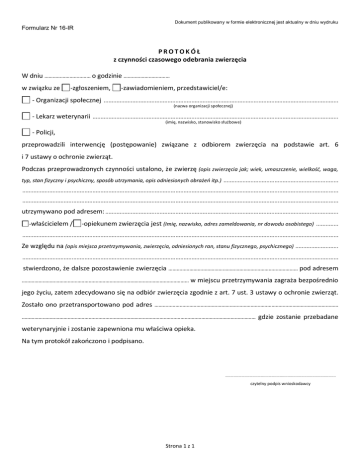 Dokument publikowany w formie elektronicznej jest aktualny w dniu wydruku Formularz Nr 16-IR PROTOKÓŁ z czynności czasowego odebrania zwierzęcia W dniu …………………………… o godzinie …………………………… w związku ze -zgłoszeniem, -zawiadomieniem, przedstawiciel/e: - Organizacji społecznej ................................................................................................................................................... (nazwa organizacji społecznej) - Lekarz weterynarii .......................................................................................................................................................... (imię, nazwisko, stanowisko służbowe) - Policji, przeprowadzili interwencję (postępowanie) związane z odbiorem zwierzęcia na podstawie art. 6 i 7 ustawy o ochronie zwierząt. Podczas przeprowadzonych czynności ustalono, że zwierzę (opis zwierzęcia jak; wiek, umaszczenie, wielkość, waga, typ, stan fizyczny i psychiczny, sposób utrzymania, opis odniesionych obrażeń itp.) ........................................................................ ...................................................................................................................................................................................................... ...................................................................................................................................................................................................... utrzymywano pod adresem: .................................................................................................................................................. -właścicielem / -opiekunem zwierzęcia jest (Imię, nazwisko, adres zameldowania, nr dowodu osobistego) .............. ...................................................................................................................................................................................................... Ze względu na (opis miejsca przetrzymywania, zwierzęcia, odniesionych ran, stanu fizycznego, psychicznego) ........................... ...................................................................................................................................................................................................... stwierdzono, że dalsze pozostawienie zwierzęcia ………………………………………………………………………………… pod adresem ………………………………………………………………………………………………………… w miejscu przetrzymywania zagraża bezpośrednio jego życiu, zatem zdecydowano się na odbiór zwierzęcia zgodnie z art. 7 ust. 3 ustawy o ochronie zwierząt. Zostało ono przetransportowano pod adres …………………………………………………………………………………………………………………… …………………………………………………………………………………………………………………………………………………… gdzie zostanie przebadane weterynaryjnie i zostanie zapewniona mu właściwa opieka. Na tym protokół zakończono i podpisano. ………………………………………………………………………………………………………….. czytelny podpis wnioskodawcy Strona 1 z 1