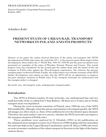 PRACE GEOGRAFICZNE, zeszyt 112 Instytut Geografii i Gospodarki Przestrzennej UJ Kraków 2003 Arkadiusz Kołoś PRESENT STATE OF URBAN RAIL TRANSPORT NETWORKS IN POLAND AND ITS PROSPECTS Abstract: in his paper the author showed direction of the urban rail transport (the MTS) development in Polish cities since the end of the 19th c. to the present epoch. Basic stages of this development, those before the 1st World War, 1919−39, 1939−45 and the post−war period were presented on examples of the cities of Wrocław, Poznań, Warsaw and Cracow. The crucial projects were also considered. In the second part the author deals with the future of the rail transport in Polish cities against the West−European experiences. He criticizes the present transport policy realized in Poland. Finally, the author shows two extreme scenarios of the MTS further development and express an idea, that the MTS will be an opportunity to improve thepoor transport situation in Polish cities if the transport networks are modernized and thetransport policy is changed. Key words: city, rail transport, tram, underground, transport policy Introduction The MTS in Poland contains 14 tram networks, one underground line and two small networks of the so−called Fast Urban Railway. All those serve 4 cities, but in 18 this transport mean was liquidated. During the socio−economic transition of Poland, since 1990 the use of the MTS fell considerably, although, when the private motorisation is developed quickly, theMTS advantages are often cited, i.e. those of low pollution level or the limited space demand. Therefore the main author’s aim is to answer, whether the MTS networks can improve the transport situation of Polish cities. These problems were analysed by S. Dziadek (1991) in his publication on theurbanized areas transport systems, by J. Petryszyn (1998) dealing with the interurban bus and tram links in the Upper Silesian Conurbation, and by B. Meyer (1998) who wrote on socio−economic conditions of the urban transport in Szczecin in the light of the barrier analysis theory. 184 PRACE GEOGRAFICZNE, ZESZYT 112 The MTS networks spatial development against that of the cities Most of Polish tram network was built before the 1st Word War and their spatial pattern partially function nowadays. Basic factor of this development was the demographical and economic growth of the cities, modified considerably by the urban population income level and the political situation: the MTS were developed then mostly in German part of present Poland’s area. Its worth to remember that the tram was then the only efficient public transport mean. The good example of the developed system is that of the city of Wrocław (Fig.1). In the interwar period only the tram network in the eastern part of the Upper Silesian Conurbation (that of Dąbrowa Górnicza Coal Basin) and the urban railway line (the EKD in Warsaw were built) The new tram lines were opened in Warsaw and Łódź, while in other cities only some routes were lengthened, like in Poznań (Fig.2.). This stagnation of the MTS development was mainly due the new transport means introduction, those of private cars, buses and trolleybuses−and the poor economic situation of Polish cities. The 2nd Word War caused considerable material destructions in Polish cities. During the post−war reconstruction the central parts of the MTS patterns in some cities were transformed the most in Warsaw (Fig.3). In the post−war period (to the 70s) the MTS grew considerably in numerous cities. Many new routes were opened, others were modernized: second lines were built and the track subgrades were separated from the urban traffic. This development was stimulated by industrialization−and by the underdevelopment of the private motorization, due to ideological principles, like at Nowa Huta, the new district of the city of Cracow (Fig.4). But in some cities, especially in the smaller ones, lying in western Poland there were neither investment nor modernization, thus the MTS became less efficient and – finally – were liquidated. Other negative effects of the above mentioned political factors were: a subordination of the new MTS routes projects to that of industrial plants and an inconsequence in modernization. Therefore some highly efficient routes (of the fast tram parameters) were built only to transport workers to such the plants, and lacked themodern lines within the city−centres. In the 60s and 70s the MTS development rate became smaller and in the 80s was nearly none. But the spatial growth of the cities was continued (the new districts were served by the bus transport). After this break, lasting over 10 years, in the second half of the 90s, several MTS routes were opened, mostly in Warsaw (a fragment of the first underground line and the tram line to the Bemowo district), in Poznań (the fast tram line, that of PST) and in Cracow, too. The post−war output of the MTS investment within the Upper Silesian Conurbation is highly negative. Although there are long tram and bus lines, this 2−million people agglomeration has no efficient MTS system. The respective projects, realized to the70s, expressed only needs or those of the great industrial plants, like Huta Katowice inDąbrowa Górnicza. Later two modern routes (NS and EW) began to be planned – but nothing of this “Regional Railway Transport System” was realized. PRESENT STATE OF URBAN RAIL TRANSPORT ... 185 The above described MTS development influences considerably its actual efficiency and the further prospects. The pre−war crisis and that of the end of the 20th c., together with its unproper evolution in the 50s and 60s deteriorated its accessibility (measured by the growing distance from the tram stop to the work (residence place) in residential urban zones. Moreover, the routes leading to the old great industrial plants serve nowadays few passengers, thus the economic efficiency of the whole system is reduced. The lack of cons