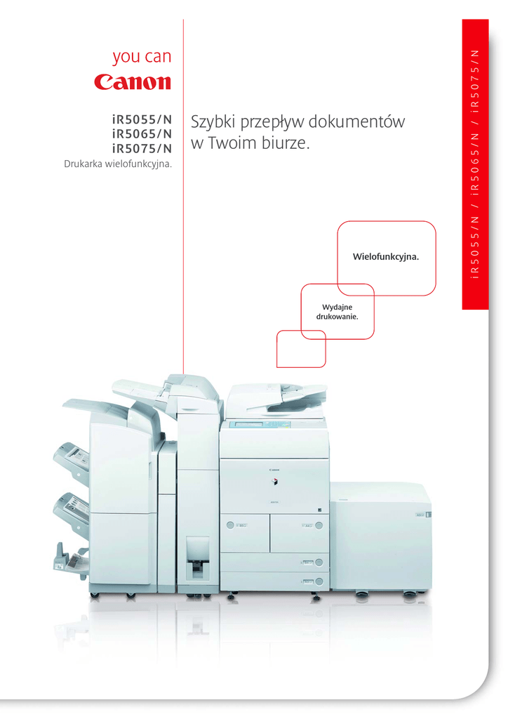 Szybki przepływ dokumentów w Twoim biurze. Drukarka wielofunkcyjna. Wielofunkcyjna. Wydajne drukowanie. iR5055/N / iR5065/N / iR5075/N iR5055/N iR5065/N iR5075/N Prawdziwie skuteczny obieg dokumentów. Drukarki Canon iR5055/N, iR5065/N i iR5075/N stanowią gamę zaawansowanych wielofunkcyjnych urządzeń, które poprawiają komunikację i sposób w jaki tworzysz, udostępniasz oraz dystrybuujesz dokumenty w swojej organizacji. Przyjazne dla użytkownika i zaprojektowane tak, aby zmaksymalizować wydajność, mogą zostać wyposażone w szeroki wachlarz opcji wykańczania, które nadadzą komunikacji dodatkowy wymiar. Gama dostępnych narzędzi do zarządzania zapewnia kontrolę kosztów oraz bezpieczeństwo. Zaprojektowane do dużych zadań. Twoje informacje będą bezpieczne. Osiągnij najwyższą wydajność. Zastępując kilka oddzielnych urządzeń jednym, które posiada właściwości ich wszystkich, dzięki iR5055/N, iR5065/N i iR5075/N wygospodarujesz nową przestrzeń w Twoim biurze. Możesz więc drukować, faksować, skanować i wysyłać dokumenty z jednego urządzenia, które może wykonywać wiele prac jednocześnie. Wysoka wydajność jest dodatkowo zwiększana przez jednoprzebiegowy system dupleksowy (ang. one - pass duplex system), który wirtualnie podwaja szybkość osiąganą podczas tradycyjnego skanowania, do 100 obrazów na minutę. Możliwości wykańczania dokumentów odpowiadają tym oferowanym przez lokalne drukarnie - w tym składanie w kształcie litery Z i C - dając Ci tym samym możliwość wykonania na miejscu prac, które poprzednio trzeba było zlecać na zewnątrz. Chroń swoje zasoby. Informacja jest kluczowym zasobem biznesowym, a Canon pomaga Ci ją chronić. Dostęp do urządzeń iR5055/N, iR5065/N oraz iR5075/N można kontrolować przy użyciu haseł, zgodnie z procedurą logowania obowiązującą w firmie, a także za pomocą odcisków palców. Dokumenty można przechowywać w bezpiecznych skrzynkach pocztowych do czasu ich wydrukowania przez danego użytkownika. Zeskanowane dokumenty, zanim zostaną wysłane dalej, można także zaszyfrować. W przypadku wyjątkowo poufnych dokumentów, w dokument drukowany można „wstawić” zabezpieczający znak wodny, który staje się widoczny, gdy ktoś próbuje skopiować dokument. iR5055/N / iR5065/N / iR5075/N iWMC umożliwia także administratorom kopiowanie ustawień i książek adresowych pomiędzy wieloma urządzeniami. Opcjonalny system e-Maintenance firmy Canon – pozwala na automatyczne zgłaszanie wszelkich ewentualnych problemów, tak więc nie trzeba się martwić o ciągłe monitorowanie urządzeń. Aby zminimalizować ryzyko ataku hakerów z zewnątrz, narzędzia sieciowe służące do uwierzytelnienia gwarantują, że tylko autoryzowane komputery mogą łączyć się z urządzeniami iR5055/N, iR5065/N oraz iR5075/N. Co więcej, twarde dyski urządzeń mogą zostać wyczyszczone lub zaszyfrowane, a „dzienniki zadań” ukryte. Oszczędne i kontrolowane drukowanie. Wykorzystywanie obu stron papieru jest nie tylko oszczędne, ale nadaje również profesjonalizmu Twojej komunikacji biznesowej. Wprowadzenie opcjonalnego oprogramowania Canon Zaprojektowane uniFLOW przenosi wiedzę do realizacji na temat drukowania pilnych zadań. i kosztów zarządzania na nowy wyższy poziom. uniFLOW dostarcza bieżące i szczegółowe informacje o tym, kto realizuje wydruk, co i gdzie jest drukowane i jaki jest koszt zadania. Umożliwia także automatycznie przekierowania zadań do bardziej oszczędnych urządzeń w sieci oraz zapewnia kontrolę wydruków w każdym z działów. Dzięki temu planowanie budżetu staje się łatwiejsze i możliwe jest obliczenie rzeczywistego zwrotu z inwestycji. Oprogramowanie uniFLOW. Bezproblemowe zarządzanie dla działu IT. Urządzenia iR5055N, iR5065N oraz iR5075N firmy Canon są „gotowe do pracy w sieci”, tak więc instalacja i przygotowanie do pracy w sieci jest niezwykle proste. Twoje informacje pozostaną bezpieczne. iW Management Console (iWMC) to aplikacja sieciowa, którą ułatwia scentralizowane zarządzanie urządzeniami sieciowymi – jest to idealne rozwiązanie dla zapracowanych działów IT. Ta standardowa funkcja umożliwia zdalne zarządzanie ustawieniami urządzenia, wykrywanie nowych urządzeń przy użyciu zautomatyzowanych zadań i zgłaszanie zaistniałych błędów poprzez e-mail. Informacje o kończącym się tonerze lub o problemach z urządzeniem mogą zostać wysłane w formie poczty e-mail, dzięki czemu możliwe jest podjęcie szybkich i sprawnych działań. Gwarantuje to minimalizację przestojów. Wdrożenie proste dla użytkowników. Identyczny interfejs użytkownika jest wspólny dla każdego urządzenia biurowego Canon. Umożliwia to szybkie wdrożenie i administrowanie wielu urządzeń Canon oraz pozwala użytkownikom na bezproblemowe przełączenie się pomiędzy urządzeniami. iWMC Main portal. Urządzenie wielofunkcyjne, które wykonuje wszystko, czego potrzebujesz. Kiedy musisz wykonać pracę, dobrze jest móc się naprawdę na kimś oprzeć. W ten sposób należy myśleć o urządzeniach iR5055/N, iR5065/N oraz iR5075/N. Jedno wydajne urządzenie na którym można polegać, pozwala Ci na drukowanie, kopiowanie, faksowanie, skanowanie i wysyłanie informacji w prosty i szybki sposób, gwarantując jakość, która Cię wyróżni! Wydajność, która pozwala na dotrzymanie każdego terminu. iR5075/N drukuje i kopiuje z zawrotną szybkością 75 stron na minutę, co czyni ją perfekcyjną dla departamentów 75 stron produkujących znaczne ilości na minutę. dokumentów. Może też stać się sercem scentralizowanych usług produkcyjnych w dużych organizacjach. iR5065/N i iR5055/N są urządzeniami o niezwykłej wydajności wynoszącej odpowiednio 65 i 55 stron na minutę. Każdy model jest produkowany jako „gotowy do pracy w sieci” - wersja N oraz wersja kopiarkowa, która może zostać rozbudowana o karty wydruków obsłu