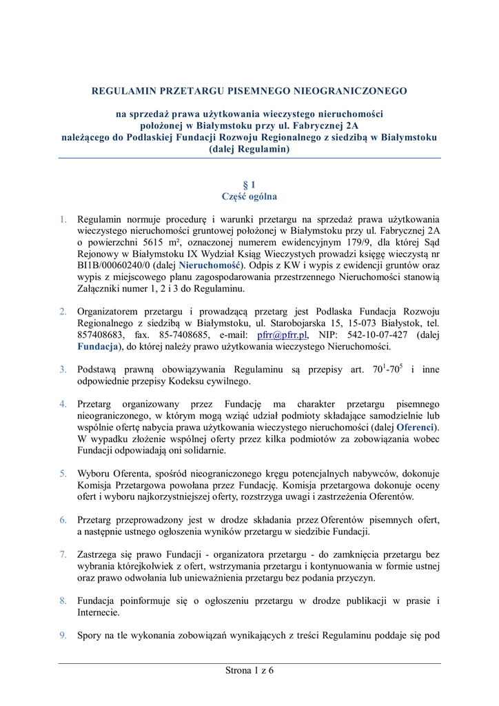 REGULAMIN PRZETARGU PISEMNEGO NIEOGRANICZONEGO na sprzedaż prawa użytkowania wieczystego nieruchomości położonej w Białymstoku przy ul. Fabrycznej 2A należącego do Podlaskiej Fundacji Rozwoju Regionalnego z siedzibą w Białymstoku (dalej Regulamin) §1 Część ogólna 1. Regulamin normuje procedurę i warunki przetargu na sprzedaż prawa użytkowania wieczystego nieruchomości gruntowej położonej w Białymstoku przy ul. Fabrycznej 2A o powierzchni 5615 m², oznaczonej numerem ewidencyjnym 179/9, dla której Sąd Rejonowy w Białymstoku IX Wydział Ksiąg Wieczystych prowadzi księgę wieczystą nr BI1B/00060240/0 (dalej Nieruchomość). Odpis z KW i wypis z ewidencji gruntów oraz wypis z miejscowego planu zagospodarowania przestrzennego Nieruchomości stanowią Załączniki numer 1, 2 i 3 do Regulaminu. 2. Organizatorem przetargu i prowadzącą przetarg jest Podlaska Fundacja Rozwoju Regionalnego z siedzibą w Białymstoku, ul. Starobojarska 15, 15-073 Białystok, tel. 857408683, fax. 85-7408685, e-mail: [email protected], NIP: 542-10-07-427 (dalej Fundacja), do której należy prawo użytkowania wieczystego Nieruchomości. 3. Podstawą prawną obowiązywania Regulaminu są przepisy art. 701-705 i inne odpowiednie przepisy Kodeksu cywilnego. 4. Przetarg organizowany przez Fundację ma charakter przetargu pisemnego nieograniczonego, w którym mogą wziąć udział podmioty składające samodzielnie lub wspólnie ofertę nabycia prawa użytkowania wieczystego nieruchomości (dalej Oferenci). W wypadku złożenie wspólnej oferty przez kilka podmiotów za zobowiązania wobec Fundacji odpowiadają oni solidarnie. 5. Wyboru Oferenta, spośród nieograniczonego kręgu potencjalnych nabywców, dokonuje Komisja Przetargowa powołana przez Fundację. Komisja przetargowa dokonuje oceny ofert i wyboru najkorzystniejszej oferty, rozstrzyga uwagi i zastrzeżenia Oferentów. 6. Przetarg przeprowadzony jest w drodze składania przez Oferentów pisemnych ofert, a następnie ustnego ogłoszenia wyników przetargu w siedzibie Fundacji. 7. Zastrzega się prawo Fundacji - organizatora przetargu - do zamknięcia przetargu bez wybrania którejkolwiek z ofert, wstrzymania przetargu i kontynuowania w formie ustnej oraz prawo odwołania lub unieważnienia przetargu bez podania przyczyn. 8. Fundacja poinformuje się o ogłoszeniu przetargu w drodze publikacji w prasie i Internecie. 9. Spory na tle wykonania zobowiązań wynikających z treści Regulaminu poddaje się pod Strona 1 z 6 rozstrzygnięcie właściwego rzeczowo Sądu z siedzibą w Białymstoku. 10. Każdy z Oferentów przystępujących do przetargu jest związany treścią Regulaminu. §2 Przedmiot przetargu 1. Przedmiotem przetargu jest sprzedaż przez Fundację na rzecz Oferenta użytkowania wieczystego Nieruchomości wraz z istniejącymi naniesieniami. 2. Cena wywoławcza przedmiotu przetargu wynosi 4.100.000,- zł (słownie: cztery miliony sto tysięcy złotych). Do ceny może zostać doliczony podatek VAT, zgodnie z obowiązującymi przepisami prawa podatkowego. §3 Postępowanie przetargowe 1. Fundacja nie dopuszcza składania ofert częściowych lub wariantowych. 2. Oferent składający ofertę pozostaje nią związany przez okres 120 dni, z zastrzeżeniem ust.5 niniejszego paragrafu. Bieg terminu związania ofertą rozpoczyna się wraz z upływem terminu składania ofert. Do przyjęcia oferty przez Fundację dochodzi z chwilą podpisania umowy sprzedaży prawa użytkowania wieczystego Nieruchomości z Oferentem, którzy złożył ofertę najkorzystniejszą. 3. Każdy Oferent może złożyć w przetargu jedną ofertę, tj. samodzielnie lub jako strona oferty wspólnej z innym Oferentem. Oferenci składający wspólną ofertę wskazują pełnomocnika do reprezentowania Oferentów. Fundacja kieruje oświadczenia i korespondencję wyłącznie do pełnomocnika Oferentów, którzy złożyli wspólną ofertę. 4. Oferent ponosi wszelkie koszty własne związane z przygotowaniem i złożeniem oferty, niezależnie od wyniku przetargu. 5. Oferent może bez ujemnych konsekwencji prawnych wycofać złożoną ofertę w okresie jej obowiązywania poprzez doręczenie Fundacji pisemnego oświadczenia o cofnięciu oferty. 6. Fundacja może przed upływem terminu składania ofert zmienić treść Regulaminu. O każdej takiej zmianie Fundacja niezwłocznie powiadomi wszystkich Oferentów na stronie internetowej www.fabryczna.pfrr.pl . Jeżeli w wyniku zmiany treści Regulaminu niezbędny jest dodatkowy czas na wprowadzanie zmian w ofertach, Fundacja przedłuża termin składania ofert i informuje o tym wszystkich Oferentów. 7. Zaproszenie do przetargu Fundacja zamieści na swojej witrynie internetowej pod adresem: www.pfrr.pl, na wybranych branżowych portalach internetowych, w dzienniku lokalnym oraz dzienniku ogólnopolskim. Regulamin wraz z załącznikami będzie udostępniony do pobrania na stronie internetowej pod adresem: http://www.fabryczna.pfrr.pl Strona 2 z 6 §4 Przygotowanie oferty 1. Ofertę należy złożyć według formularza ofertowego (Załącznik numer 4 do Regulaminu). Oferta będzie podpisana przez Oferenta lub osobę (osoby) uprawnioną do występowania w imieniu i ze skutkiem dla Oferenta, zgodnie z zasadami reprezentacji Oferenta. 2. Osoby działające w oparciu o pełnomocnictwo do reprezentowania Oferenta załączą do oferty oryginał lub poświadczoną notarialnie kopię pełnomocnictwa szczególnego do występowania w imieniu i ze skutkiem dla Oferenta w tym przetargu. 3. W przypadku składania przez kilku Oferentów oferty wspólnej należy załączyć do oferty oryginał lub poświadczoną notarialnie kopię pełnomocnictwa szczególnego do występowania w tym przetargu w imieniu i ze skutkiem dla wszystkich Oferentów. 4. Oferta winna być złożona w zamkniętej kopercie (opakowaniu) zaadresowanej do Fundacji z oznaczeniem: ,,PRZETARG FABRYCZNA” wraz z kompletem wymaganych dokumentów. 5. Oferenci zobowiązani są d