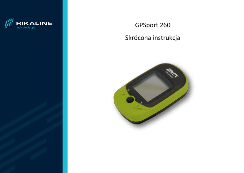 GPSport 260 Skrócona instrukcja GPSport – instrukcja obsługi Wyświetlacz LCD (1,8 cala) Podświetlenie Menu Wyjście Włącz/Stop/ Pauza Lista skrótów prędkościomierza ALT = wysokośd AVG = średnia prędkośd BAR = barometr CAL = kalorie DST = odległośd KM = kilometr KMH = kilometrów na godzinę MAX = prędkośd maksymalna MPH = mil na godzinę ODA = odometr A ODB = odometr B SPD = prędkośd TIM = czas TOD CAL = dzisiejsze kalorie VAR = wahania OK/Góra/Dół/Prawo/Lewo Nazwa Przycisk „Włącz” Ikona Funkcja Naciśnij, aby zapauzowad/wznowid działanie, gdy urządzenie jest włączone. Naciśnij przez 3 sekundy aby włączyd/ wyłączyd urządzenie. Podświetlenie Menu Wyjście OK/Góra/Dół/Prawo/Lewo Naciśnij przez 3 sekundy aby włączyd/wyłączyd podświetlenie. Powrót do menu głównego Użyj strzałek, żeby wybrad jedną z dostępnych opcji. Naciśnij przycisk OK, żeby potwierdzid wybór Jak zainstalowad GPSport w uchwycie rowerowym? Ustawienia wstępne Przy pierwszym uruchomieniu urządzenia użytkownik zostanie zapytany o preferowane ustawienia. Prosimy o wybranie za pomocą strzałek właściwego języka, jednostek, czasu i strefy czasowej, wagi i rodzaju sportu. 1. 2. 3. 4. Połącz ze sobą obydwie części uchwytu. Przeciągnij dołączone plastikowe paski przez otwory w uchwycie. Umieśd gumową podkladkę pod uchwytem i przymocuj go do kierownicy roweru, zaciągając uchwyty w plastikowych paskach w sposób zaprezentowany na ilustracji. Wsuo GPSport w uchwyt. Rozpoczęcie/zatrzymanie logowania/Autologowanie Podstawowy tryb działania/tryb sportowy Po włączeniu urządzenia pojawi się główne menu. Wybierz tryb sportowy – pojawi się strona prędkościomierza. Jesteś teraz w trybie sportowym i możesz korzystad z jego funkcji. GPSport od razu po włączeniu ustawi automatyczne zapisywanie trasy. Aby przerwad je lub zatrzymad ,wystarczy nacisnąd przycisk zasilania. Aby wznowid, proszę nacisnąd przycisk zasilania ponownie. Uwaga: zapisywanie trasy jest aktywne tylko wtedy, gdy włączony jest tryb sportowy. Użyj przycisków ze strzałkami, żeby skorzystad z innych opcji w trybie sportowym. Strona prędkościomierza może byd dopasowana do potrzeb użytkownika – można ukryd/wyświetlid na niej potrzebne informacje. Uwaga: 1.Kalibracja barometru jest automatyczna, lecz można tez dokonad jej ręcznie. 2. Kiedy aktywna jest następująca ikona: oznacza to, że trzeba dokonad ręcznej kalibracji kompasu. Aby to zrebid, przejdź do sekcji oznacznej nastepującoą ikoną: 3. Nie ładuj urządzenia w zbyt wysokiej temperaturze, gdyż może to prowadzid to uszkodzenia baterii. Informacje prawne: Wszelkie inne wymienione tutaj nazwy firm, produktów i usług są znakami towarowymi, zastrzeżonymi znakami towarowymi lub znakami usług należącymi do odpowiednich podmiotów. Rikaline nie ponosi odpowiedzialności za błędy techniczne lub redakcyjne ani za pominięcia w niniejszym tekście; nie ponosi również odpowiedzialności za szkody przypadkowe lub następcze spowodowane korzystaniem z niniejszego materiału. Informacje są przedstawione w takim stanie, w jakim przyjmuje je użytkownik i nie są objęte żadną gwarancją. Mogą ulec zmianie bez powiadomienia. Rikaline zastrzega również prawo do zmiany zawartości niniejszego dokumentu bez uprzedniego powiadomienia.