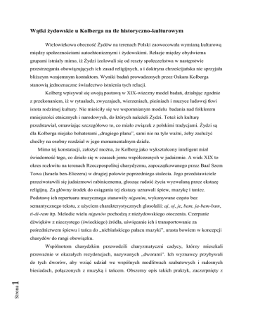 Wątki żydowskie u Kolberga na tle historyczno-kulturowym Wielowiekowa obecność Żydów na terenach Polski zaowocowała wymianą kulturową między społecznościami autochtonicznymi i żydowskimi. Relacje między obydwiema grupami istniały mimo, iż Żydzi izolowali się od reszty społeczeństwa w następstwie przestrzegania obowiązujących ich zasad religijnych, a i doktryna chrześcijańska nie sprzyjała bliższym wzajemnym kontaktom. Wyniki badań prowadzonych przez Oskara Kolberga stanowią jednoznaczne świadectwo istnienia tych relacji. Kolberg wpisywał się swoją postawą w XIX-wieczny model badań, działając zgodnie z przekonaniem, iż w rytuałach, zwyczajach, wierzeniach, pieśniach i muzyce ludowej tkwi istota rodzimej kultury. Nie mieściły się we wspomnianym modelu badania nad folklorem mniejszości etnicznych i narodowych, do których należeli Żydzi. Toteż ich kulturę przedstawiał, omawiając szczegółowo to, co miało związek z polskimi tradycjami. Żydzi są dla Kolberga niejako bohaterami „drugiego planu”, sami nie na tyle ważni, żeby zasłużyć choćby na osobny rozdział w jego monumentalnym dziele. Mimo tej konstatacji, założyć można, że Kolberg jako wykształcony inteligent miał świadomość tego, co działo się w czasach jemu współczesnych w judaizmie. A wiek XIX to okres rozkwitu na terenach Rzeczpospolitej chasydyzmu, zapoczątkowanego przez Baal Szem Towa (Israela ben-Eliezera) w drugiej połowie poprzedniego stulecia. Jego przedstawiciele przeciwstawili się judaizmowi rabinicznemu, głosząc radość życia wyzwalaną przez ekstazę religijną. Za główny środek do osiągania tej ekstazy uznawali śpiew, muzykę i taniec. Podstawę ich repertuaru muzycznego stanowiły nigunim, wykonywane często bez semantycznego tekstu, z użyciem charakterystycznych glosolalii: aj, oj, je, bam, ja-bam-bam, ti-di-ram itp. Melodie wielu nigunów pochodzą z nieżydowskiego otoczenia. Czerpanie dźwięków z nieczystego (świeckiego) źródła, uświęcanie ich i transportowanie za pośrednictwem śpiewu i tańca do „niebiańskiego pałacu muzyki”, urasta bowiem w koncepcji chasydów do rangi obowiązku. Wspólnotom chasydzkim przewodzili charyzmatyczni cadycy, którzy mieszkali przeważnie w okazałych rezydencjach, nazywanych „dworami”. Ich wyznawcy przybywali do tych dworów, aby wziąć udział we wspólnych modlitwach szabatowych i radosnych Strona 1 biesiadach, połączonych z muzyką i tańcem. Obszerny opis takich praktyk, zaczerpnięty z artykułu Stefanii Ulanowskiej1, znajduje się w III t. Mazowsza2 (s.360-361) i dotyczy dworu cadyka w Parysowie: W Parysowie (gdzie nawiasowo dodawszy, kościół parafialny jest drewniany z dachem gontowym nie malowany nawet, a synagoga murowana ma dach żelazny) mieszka rabin, uważany za świętego. Podlega on napadom epileptycznym, a więc stąd mniemanie, że widuje Pana Boga. Straszna to potęga! Słowo jego, skinienie starczy za rozkaz i nie tylko z bliższych okolic, ale nawet z Warszawy ciągną do niego starozakonni po radę i pomoc, gdyż sam przystęp do tak świętej osoby ma dawać szczęście, zdrowie i błogosławieństwo boże! […] Otoczony tajemniczością nie wychodzi nigdy z domu, na ulicy się nie pokazuje Siedzi za swojemu czerwonemi firankami, gdyż takie ma we wszystkich oknach i tylko z Panem Bogiem rozmawia, a przystęp do niego jest tak utrudniony, że trzeba mieć dużo pieniędzy, ażeby sobie audyendyę wyjednać. Skoro więc nadejdą święta jesienne, tak zwany sądny dzień i kuczki, takie tłumy ciągną do niego, że niczem są nasze odpusty. […] W czasie uroczystości dniem najważniejszym jest ten, gdy rabin ukazuje się w oknie zgromadzonym, a ci rzucają na niego pieniędzmi ze wszech stron. W zamian pisze on karteczki polecające do swego ojca nieboszczyka, z któremi-to karteczkami idą potem wszyscy na cmentarz i wrzucają je przez okienko do grobowca starego rabina, a ten modli się wtedy za nich, i na jego prośby Pan Bóg odpuszcza im grzechy. Także Przysucha stanowiła ważne centrum chasydyzmu. Istniała tam szkoła przysuska założona przez Jakuba Izaaka zwanego Świętym Żydem z Przysuchy, którego uczniowie stali się protoplastami kolejnych ważnych dynastii.3 Chasydzi modlili się w domach lub izbach zwanych sztybłami albo klojzami. Głośno przy tym śpiewali swoje niguny, kołysali się, wymachiwali rękami, tańczyli. Takie zachowania raziły innych, zwłaszcza asymilowanych wyznawców religii mojżeszowej, mogły też wydawać się śmieszne podpatrującym je Polakom. Były jednak na tyle charakterystyczne, by stać się kluczowym elementem budowanego przez otoczenie stereotypu nie tylko chasydów, ale i – ogólnie – Żydów. Glosolalie przywodzące na myśl chasydzkie niguny Strona 2 występują w większości teksów piosenek o tematyce żydowskiej zanotowanych przez 1 Stefania Ulanowska, Z ziemi czerskiej, „Czas” 1884, nr 171, s. 1. Oskar Kolberg, Mazowsze, cz. III, Dzieła wszystkie, t. 26, Wrocław-Poznań 1963, s. 360 i n. 3 Marcin Wodziński, Groby cadyków w Polsce, Wrocław 1998, s. 18 i n. 2 Kolberga (przykł. 1). Najprawdopodobniej z tego źródła pochodzą również niektóre zapisane przez Kolberga melodie. Zachodzące w muzyce Polaków i Żydów dyfuzje można też niewątpliwie wiązać z instytucją wędrownych chazanów, czyli kantorów, którzy podróżowali ze swoim chórem do miast i wsi, aby uczestniczyć w nabożeństwach szabatowych i świątecznych. Dla małomiasteczkowych i wiejskich społeczności możliwość posłuchania goszczącego w sztetl kantora stanowiła nie lada atrakcję. Słuchanie „profesjonalnych” śpiewaków dostarczało bowiem rozrywki ludziom, którzy nie mieli innej możliwości uczestniczenia w imprezach kulturalnych. Wpływy śpiewów synagogalnych zarówno w pieśniach, jak i w melodiach bez tekstu z kolbergowskiego zbioru są ewidentne4. Warto ponadto odnotować, ż