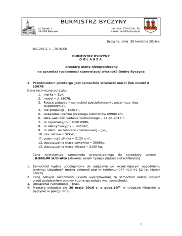 BURMISTRZ BYCZYNY ul. Rynek 1 46-220 Byczyna tel. fax. 77/413 41 50 e-mail: [email protected] Byczyna, dnia 20 kwietnia 2016 r. WG.2613. 1 . 2016.SK BURMISTRZ BYCZYNY OGŁASZA przetarg ustny nieograniczony na sprzedaż ruchomości stanowiącej własność Gminy Byczyna 1. Przedmiotem przetargu jest samochód strażacki marki Żuk model A 1507B Dane techniczne pojazdu: 1. marka – Żuk, 2. model – A 1507B, 3. Rodzaj pojazdu – samochód specjalistyczny , pożarniczy (bez wyposażenia), 4. rok produkcji - 1986 r., 5. wskazania licznika przebiegu kilometrów 69900 km, 6. data ważności badania technicznego – 11.04.2017 r. 7. nr rejestracyjny – ODH 0586, 8. nr identyfikacyjny - 445347, 9. nr ident. na tabliczce znamionowej – jw., 10. moc silnika – 52kW, 11. pojemność silnika – 2120 cm3, 12. dopuszczalna masa całkowita – 3000kg, 13. dopuszczalna masa własna – 2100 kg, Cena wywoławcza samochodu przeznaczonego do sprzedaży : 8.500,00 zł/brutto (słownie: osiem tysięcy pięćset złotych/brutto). wynosi 1. Samochód będzie udostępniony do oglądania po wcześniejszym uzgodnieniu terminu. Uzgodnień można dokonać pod nr telefonu: 077 413 41 52 (p. Marcin Czech). 2. Cenę nabycia ruchomości (kwota wylicytowana) za samochód należy wpłacić przed podpisaniem umowy kupna-sprzedaży ww. samochodu. 3. Obciążenia ruchomości – brak. 4. Przetarg odbędzie się 20 maja 2016 r. o godz.10 00 w Urzędzie Miejskim w Byczynie w pokoju nr 9. 1 5. W przetargu mogą brać udział osoby prawne i fizyczne, które wpłacą wadium w wysokości 500,00 zł nie później niż do dnia 16.05.2016 r. Wadium można należy wpłacić na rachunek bankowy Urzędu Miejskiego w Byczynie B.S. Namysłów o/Byczyna 56 8890 1040 0000 1818 2005 0004 (liczy się data wpływu na konto). 6. Wpłacone wadium zostanie: - zaliczone na poczet ceny nabycia ruchomości, jeżeli osoba wpłacająca wadium wygra przetarg, - zwrócone, jeżeli osoba wpłacająca wadium nie wygra przetargu, - wadium ulega przepadkowi w razie uchylania się uczestnika wygrywającego przetarg od zawarcia umowy. 7. Cena nabycia ruchomości równa się cenie osiągniętej w przetargu Należność płatna przelewem na konto Urzędu Miejskiego w Byczynie B.S. Namysłów o/ Byczyna 83 8890 1040 0000 1818 2005 0003 najpóźniej w dniu zawarcia umowy kupna-sprzedaży. 8. Termin zawarcia umowy kupna - sprzedaży zostanie ustalony w terminie nie krótszym niż 7 dni od dnia doręczenia zawiadomienia o rozstrzygniętym przetargu, ale nie później niż 21 dni od daty przeprowadzonego przetargu. 9. Jeżeli osoba ustalona jako nabywca ruchomości nie stawi się bez usprawiedliwienia w miejscu i terminie podanym w zawiadomieniu o rozstrzygniętym przetargu, organizator przetargu może odstąpić od zawarcia umowy, a wpłacone wadium nie podlega zwrotowi. 10. Nabywca przejmuje ruchomość w istniejącym stanie faktycznym i prawnym. 11. Szczegółowe informacje można uzyskać w Urzędzie Miejskim w Byczynie , 46-220 Byczyna, ul. Rynek 1, pokój nr 25, tel. 077-413-41-50 lub www.bip.byczyna.pl . 12. Burmistrz Byczyny może odwołać ogłoszony przetarg jedynie z uzasadnionej przyczyny informując niezwłocznie o tym zainteresowanych w formie właściwej dla ogłoszenia o przetargu. Z up. Burmistrza Katarzyna Zawadzka Z-ca Burmistrza Sporządził : Szymon Kondracki 2