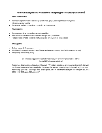 Pomoc nauczyciela w Przedszkolu Integracyjno-Terapeutycznym MIŚ Opis stanowiska: • • Pomoc w sprawowaniu dziennej opieki nad grupą dzieci pełnosprawnych i z niepełnosprawnością Czuwanie nad utrzymaniem czystości w Przedszkolu Wymagania: • • • Doświadczenie w na podobnym stanowisku Aktualne badania sanitarno-epidemiologiczne (SANEPID) Odpowiedzialność, wysoka motywacja do pracy, dobra organizacja Oferujemy: • • • Dobre warunki finansowe Możliwość zaangażowania i współtworzenia nowoczesnej placówki terapeutycznej Przyjazną atmosferę pracy CV wraz ze zdjęciem oraz list motywacyjny prosimy przesłać na adres: [email protected] Prosimy o dopisanie następującej klauzuli: "Wyrażam zgodę na przetwarzanie moich danych osobowych zawartych w mojej ofercie pracy dla potrzeb niezbędnych do realizacji procesu rekrutacji zgodnie z ustawą z dnia 29 sierpnia 1997 r. o ochronie danych osobowych (Dz. U. z 2002 r. Nr 101, poz. 926, ze zm.)"