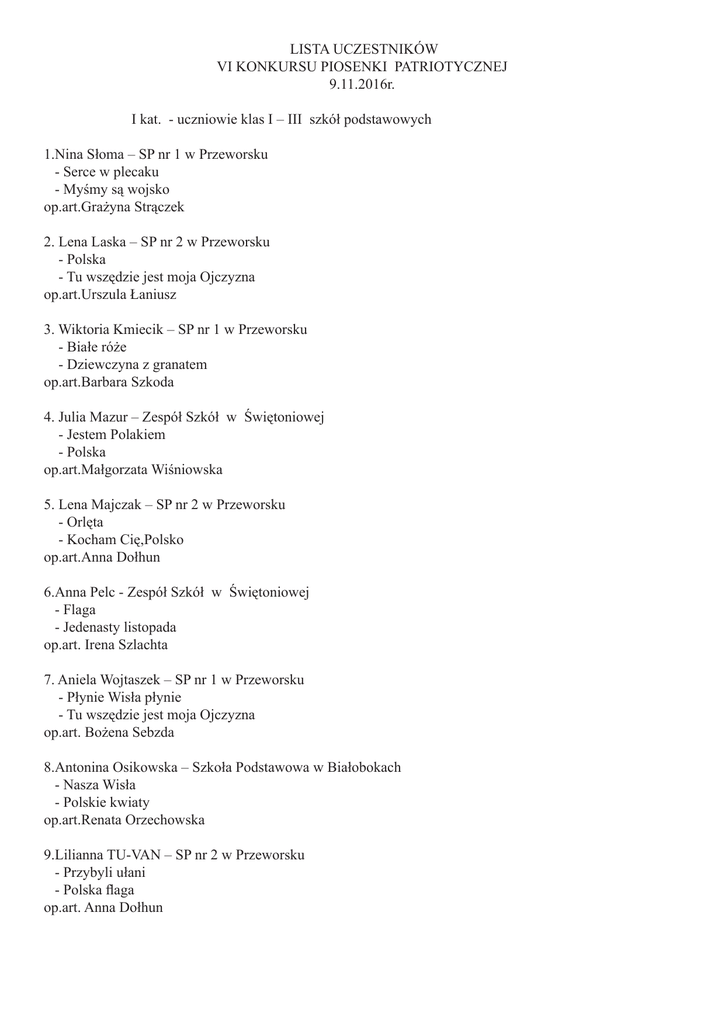 LISTA UCZESTNIKÓW VI KONKURSU PIOSENKI PATRIOTYCZNEJ 9.11.2016r. I kat. - uczniowie klas I – III szkół podstawowych 1.Nina Słoma – SP nr 1 w Przeworsku - Serce w plecaku - Myśmy są wojsko op.art.Grażyna Strączek 2. Lena Laska – SP nr 2 w Przeworsku - Polska - Tu wszędzie jest moja Ojczyzna op.art.Urszula Łaniusz 3. Wiktoria Kmiecik – SP nr 1 w Przeworsku - Białe róże - Dziewczyna z granatem op.art.Barbara Szkoda 4. Julia Mazur – Zespół Szkół w Świętoniowej - Jestem Polakiem - Polska op.art.Małgorzata Wiśniowska 5. Lena Majczak – SP nr 2 w Przeworsku - Orlęta - Kocham Cię,Polsko op.art.Anna Dołhun 6.Anna Pelc - Zespół Szkół w Świętoniowej - Flaga - Jedenasty listopada op.art. Irena Szlachta 7. Aniela Wojtaszek – SP nr 1 w Przeworsku - Płynie Wisła płynie - Tu wszędzie jest moja Ojczyzna op.art. Bożena Sebzda 8.Antonina Osikowska – Szkoła Podstawowa w Białobokach - Nasza Wisła - Polskie kwiaty op.art.Renata Orzechowska 9.Lilianna TU-VAN – SP nr 2 w Przeworsku - Przybyli ułani - Polska flaga op.art. Anna Dołhun 10.Maja Kałamarz – SP nr 1 w Przeworsku - Kwiaty polskie - Wojenko,wojenko op.art.Grażyna Strączek 11. Gabriela Balawender – Szkoła Podstawowa w Białobokach - Deszcz,jesienny deszcz - Rozkwitały pąki białych róż op.art.Agnieszka Dobrucka 12.Jakub Turek – SP nr 2 w Przeworsku - Serce w plecaku - Dzień dobry syrenko op.art. Anna Dołhun 13.Martyna Stelmach – SP nr 1 w Przeworsku - Warszawo ma - Jedenasty listopada op.art.Justyna Stelmach 14.Eliza Kotarba – SP nr 1 w Przeworsku - Pytasz mnie - Jedenasty listopada op.art. Ewa Cyrnek 15.Weronika Kud -Zespół Szkół w Gaci - Nasza Wisła -W domu ojczystym op.art.Ewwlina Bielówka 16.Alicja Stepaniak – SP nr 2 w Przeworsku - Białe róże - Ojczyzno ma op.art. Urszula Łaniusz 17.Adrianna Zubek – SP nr 1 w Przeworsku - Rozkwitały pąki białych róż - Ojczyzno ma op.art.Bożena Sebzda 18.Wiktoria Cebulak – Zespół Szkół w Świętoniowej - Przybyli ułani - Wojenko op.art.Irena Szlachta 19.Miłosz Łapa – SP nr 1 w Przeworsku - Marsz Pierwszej Brygady - Piechota op.art. Grazyna Strączek 20.Julia Cyburt – SP nr 2 w Przeworsku - Historia Polski - Moja Ojczyzna op.art.Anna Dołhun 21.Alicja Stanowska – SP nr 2 w Przeworsku - To nasza Ojczyzna - To co ważne- blisko masz op.art.Agnieszka Bartnik 22.Oliwia Janusz – SP nr 2 w Przeworsku - Przybyli ułani - Wojenko ,wojenko op.art. Edyta Puchała – Bułaś II kat. - uczniowie klas I V– VI szkół podstawowych 1.Aleksandra Uchman – SP nr 3 w Przeworsku -Ułani,ułani - Pierwsza Brygada op.art. Agata Wilk 2.Julia Stepaniak – SP nr 2 w Przeworsku - Cisza, Modlitwa Katyńska - Ojczyzna op.art. Mariusz Siuśta 3.Amelia Sobiegraj – SP nr 2 w Przeworsku - Warszawo ma - W mojej Ojczyźnie op.art. Anna Dołhun 4. Natalia Michniewska - SP nr 2 w Przeworsku - Wojenko,wojenko - Ojczyzno ma op.art. Mariusz Siuśta 5.Wiktoria Ruchała - SP nr 2 w Przeworsku - Dziewczyna z granatem - Taki kraj op.art.Mariusz Siuśta 6.Nina Majczak - SP nr 2 w Przeworsku - Walczyk Lilu - Wrzosy op.art.Anna Dołhun 7.Karina Zaręba - SP nr 2 w Przeworsku - Miejcie nadzieję - Ojczyzna op.art. Mariusz Siuśta 8.Barbara Derewecka – SP nr 3 w Przeworsku - Białe róże - Jedenasty listopada op.art. Agata Wilk 9.Pola Łosiniecka - SP nr 1 w Przeworsku - Kolęda Warszawska - Powrócisz tu op.art. Mariusz Siusta 10. Aleksandra Firleta - SP nr 2 w Przeworsku - W listopadzie - Cisza, Modlitwa Katyńska op.art. Anna Dołhun 11.Julia Stanowska - SP nr 2 w Przeworsku - Ojczyzno ma - Czy jest coś piękniejszego na tym świecie op.art. Anna Dołhun 12.Edyta Cwynar – SP nr 1 w Przeworsku - Dziś idę walczyć mamo - Rozkwitały pąki białych róż op.art.Renata Nadłonek 13.Zuzanna Mazur – SP nr 1 w Przeworsku - Ojczyzno ma - Szara piechota op.art. Renata Nadłonek kat. III – uczniowie gimnazjum 1.Oliwia Jarosz – Gimnazjum nr 1 w Przeworsku - Orzeł biały - Jaworze rodzinny op.art. Jagoda Magoń 2. Nikola Piątek – ZS – Gimnazjum w Świętoniowej - Biały orzeł - Aby ktos mógł żyć op.art. Małgorzata Wisniowska 3. Zofia Kozak - Gimnazjum nr 1 w Przeworsku - Taki kraj - Miejcie nadzieję op.art. Sabina Cieślak 4. Maria Wojnarowicz - Gimnazjum nr 1 w Przeworsku - Kolęda Warszawska - Cisza, Modlitwa Katyńska op.art.Sabina Cieślak 5. Katarzyna Borcz - Gimnazjum nr 1 w Przeworsku - Walczyk - Niech się Pani pomodli op.art.Jagoda Magoń kat. IV-uczniowie szkół ponadgimnazjalnych 1.Gabriela Obłoza – ZSOiZ w Przeworsku - Wolność - Tango na głos,orkiestrę i jeszcze jeden głos op.art. Alicja Domka 2. Jakub Gujda – Niepubliczna Szkoła Muzyczna w Przeworsku - Kozak - Ostatni list op.art. Natalia Cieślachowska – Trojnar 3. Aleksandra Wajda – ZSOiZ w Przeworsku - Modlitwa dziewczyńska - Kolęda Warszawska op.art. Agnieszka Rogalska – Ruchała 4. Patrycja Bieniasz – ZSOiZ w Przeworsku - Lot orłów przerwany we mgle - Póki Polska żyje w nas op.art. Joanna Komenda 5.Iwona Domańska – ZSOiZ w Przeworsku - Dziewczyna z granatem - Taki kraj op.art. Joanna Komenda 6. Julia Markowska – ZSOiZ w Przeworsku - W wielkim świecie zagubiona - Powrócisz tu op.art. Joanna Komenda 7. Klaudia Nykiel – ZSOiZ w Przeworsku - Warszawo ma - Białe róże op.art. Agnieszka Rogalska – Ruchała