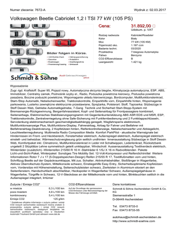 Numer zlecenia: 7672-A Wydruk z: 02.03.2017 Volkswagen Beetle Cabriolet 1,2 l TSI 77 kW (105 PS) Cena: 31.892,00 Rodzaj nadwozia Kolor Moc Pojemność sko. Badanie techni. Przekładnia Paliwo CO2-Effizenzklasse Leergewicht Kabriolet/Roadster Biały 77 kW (105 KM) 1.197 ccm 03/2020 7-biegowa Automatyka Benzyna B 1.421 kg Udokum. p. VAT Wyposażenie Zugr.-lgd. Kraftstoff: Super 95, Pojazd nowy, Automatyczna skrzynia biegów, Klimatyzacja automatyczna, ESP, ABS, Immobilizer, Centralny zamek, Podnośnik szyby el., Radio, Poduszka powietrzna kierowcy, Poduszka powietrzna pasażera, Boczne poduszki powietrzne, Wspomaganie układu kierowniczego, Bordcomputer, Multifunktionslenkrad, Start-/Stop Automatik, Nebelscheinwerfer, Traktionskontrolle, Einparkhilfe vorn, Einparkhilfe hinten, Wspomaganie parkowania, Lusterko zewnętrzne elektrycznie przestawiane, Sprężarka, Polsterart: Stoff, Tapicerka: Sitzbezüge in Stoff Dessin Web, Getriebe Automatikgetriebe, 7-Gang Technik und Sicherheit Start-Stopp-System mit Bremsenergie-Rückgewinnung, Berganfahrassistent, Kopf- und Seitenairbag für Frontpassagiere kombiniert, Seitenairbags, Elektronisches Stabilisierungsprogramm mit Gegenlenkunterstützung ABS ASR EDS und MSR, ESP, Traktionskontrolle, Zentralverriegelung ohne Safe-Sicherung mit Funkfernbedienung und 2 Funkklappschlüsseln, Servolenkung elektromechanisch geschwindigkeitsabhängig geregelt, Wegfahrsperre elektronisch, Multifunktionsanzeige Plus, Multifunktions-Display, Fahrerairbag, Airbag für Fahrer und Beifahrer mit Beifahrerairbag-Deaktivierung, 2 Kopfstützen hinten, Reifenkontrollanzeige, Nebelscheinwerfer und Abbiegelicht, Leuchtweitenregulierung Multimedia Radio Composition Media Komfort ParkPilot - akustische Warnsignale bei Hindernissen im Front- und Heckbereich, Fensterheber elektrisch, Außenspiegel elektrisch, Außenspiegel elektrisch einstell- und beheizbar, Wärmeschutzverglasung grün seitlich undhinten Innenausstattung Sitzbezüge in Stoff Dessin Web, Komfortpaket inkl. Climatronic, Multifunktionslenkrad in Leder mit Schaltwippen, Lederlenkrad, Rücksitzbank ungeteilt 2 Sitzplätze Lehne symmetrisch geteilt umklappbar, Windschott Aussenausstattung Textilverdeck elektrisch, Winterräder (zusätzlich) -Winterreifen 215/60 R 16 H -Stahlräder 6 1/5J X 16 m Radvollblenden Pakete Licht-und-Sicht-Paket, Winterpaket Sonstiges Tire Mobility Set: 12-Volt-Kompressor und Reifendichtmittel Weitere Informationen Rotor 7 J x 17 (5-Doppelspeichen-Design) Reifen 215/55 R 17, Textilfußmatten vorn und hinten, Schriftzug Beetle auf der Gepäckraumklappe, Mit zus. Schalter, Aktivkohlebehälter, Stoßfänger in Wagenfarbe, Aktives Überrollschutz-System, Mittelkonsole schwarz, Einstiegshilfe Easy Entry, Sicherheitsoptimierte Kopfstützen vorn, Vordersitze mit Höheneinstellung, Seitenschutzleisten schwarz, Zierleisten in Aluminium eloxiert an den Seitenfenstern, Handschuhfach abschließbar, Heckspoiler in Wagenfarbe/ Schwarz, Außenspiegelgehäuse in Wagenfarbe, Türgriffe in Schwarz, 12-V-Steckdose an der Mittelkonsole vorn und hinten, Blinkleuchten seitlich in die Außenspiegel integriert, Irrtümer Zużycie / Emisja CO2* w mieście poza miastem kombinowany Emisja CO2 6,3 L/100 km 4,8 L/100 km 5,4 L/100 km 125 g/km * Dodatkowe oficjalne informacje o zużyciu paliwa i emisji CO2 nowych samochodów osobowych można znaleźć w przewodniku zużycia paliwa i emisji CO2 nowych samochodów osobowych, dostępnym bezpłatnie we wszystkich punktach sprzedaży oraz w Deutschen Automobil Treuhand GmbH pod adresem www.dat.de CO2-Effizenzklasse Dane kontaktowe Auf der Grundlage der gemessenen CO2-Emission unter Berücksichtigung der Masse des Fahrzeugs ermittelt. Schmidt & Söhne Aschersleben GmbH & Co. KG Siemensstraße 1 D-06449 Aschersleben Tel. 03473 8733-0 Fax 03473 8733-55 [email protected] http://www.schmidt-soehne.com Numer zlecenia: 7672-A Volkswagen Beetle Cabriolet 1,2 l TSI 77 kW (105 PS) Wydruk z: 02.03.2017