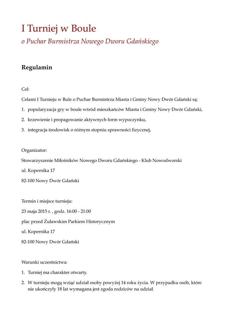 I Turniej w Boule o Puchar Burmistrza Nowego Dworu Gdańskiego Regulamin Cel: Celami I Turnieju w Bule o Puchar Burmistrza Miasta i Gminy Nowy Dwór Gdański są: 1. popularyzacja gry w boule wśród mieszkańców Miasta i Gminy Nowy Dwór Gdański, 2. krzewienie i propagowanie aktywnych form wypoczynku, 3. integracja środowisk o różnym stopniu sprawności fizycznej, Organizator: Stowarzyszenie Miłośników Nowego Dworu Gdańskiego - Klub Nowodworski ul. Kopernika 17 82-100 Nowy Dwór Gdański Termin i miejsce turnieju: 23 maja 2015 r. , godz. 16:00 - 21:00 plac przed Żuławskim Parkiem Historycznym ul. Kopernika 17 82-100 Nowy Dwór Gdański Warunki uczestnictwa: 1. Turniej ma charakter otwarty. 2. W turnieju mogą wziąć udział osoby powyżej 14 roku życia. W przypadku osób, które nie ukończyły 18 lat wymagana jest zgoda rodziców na udział. 3. W turnieju biorą udział zespoły dwuosobowe. 4. Niezbędnym warunkiem uczestnictwa w turnieju jest przesłanie do 15 maja 2015 r. formularza zgłoszeniowego na adres: [email protected] lub dostarczenie go osobiście do biura Żuławskiego Parku Historycznego, ul. Kopernika 17, 82 - 100 Nowy Dwór Gdański. Regulamin gry: 1. W I Turnieju w Bule o Puchar Burmistrza Nowego Dworu Gdańskiego obowiązują zasady Polskiej Federacji Pentaques (Boules). Dostępne na stronie http:// www.petanque.pl/regulaminy/ 2. Organizator wyznacza sędziego, który dokonuje omówienie zasad gry przed rozpoczęciem turnieju. 3. Gra będzie miała charakter dubeltu, każdy z graczy otrzyma po 3 kule. 4. Gra toczyć się będzie do 13 punktów. 5. Rozgrywki będą miały charakter pucharowy. 6. Rozstawienie drużyn zostanie dokonane poprzez losowanie. 7. Na drużynę przy polu gry czeka się 10 minut, gdy ta się nie stawi - wygrywa walkowerem drużyna przeciwna. 8. Sędzia dokonuje zasad interpretacji zasad gry i rozstrzyga spory. Jego decyzje są ostateczne. Przepisy porządkowe: 1. Organizatorzy mają obowiązek zagwarantowania wyposażenia niezbędnego do gry (kul). 2. W czasie turnieju uczestnika jak i osoby postronne obowiązuje odpowiednie zachowanie. 3. Wszystkie inne sporne sprawy i te nie ujęte w niniejszym regulaminie rozstrzyga organizator Turnieju. 4. Organizator zastrzega sobie możliwość zmiany regulaminu turnieju. 5. Organizator nie odpowiada za rzeczy pozostawione bez opieki za wyjątkiem rzeczy oddanych do depozytu organizatora. 6. Nieprzestrzeganie regulaminu wiąże się z możliwością usunięcia zawodnika z turnieju.