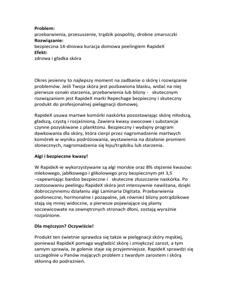 Problem: przebarwienia, przesuszenie, trądzik pospolity, drobne zmarszczki Rozwiązanie: bezpieczna 14-dniowa kuracja domowa peelingiem RapideX Efekt: zdrowa i gładka skóra Okres jesienny to najlepszy moment na zadbanie o skórę i rozwiązanie problemów. Jeśli Twoja skóra jest pozbawiona blasku, widać na niej pierwsze oznaki starzenia, przebarwienia lub blizny - skutecznym rozwiązaniem jest RapideX marki Repechage bezpieczny i skuteczny produkt do profesjonalnej pielęgnacji domowej. RapideX usuwa martwe komórki naskórka pozostawiając skórę młodszą, gładszą, czystą i rozjaśnioną. Zawiera kwasy owocowe i substancje czynne pozyskiwane z planktonu. Bezpieczny i wydajny program dawkowania dla skóry, która cierpi przez nagromadzenie martwych komórek w wyniku podróżowania, wystawienia na działanie promieni słonecznych, nagromadzenia się łoju/trądziku lub starzenia. Algi i bezpieczne kwasy! W RapideX-ie wykorzystywane są algi morskie oraz 8% stężenie kwasów: mlekowego, jabłkowego i glikolowego przy bezpiecznym pH 3,5 –zapewniając bardzo bezpieczne i skuteczne złuszczanie naskórka. Po zastosowaniu peelingu RapideX skóra jest intensywnie nawilżana, dzięki dobroczynnemu działaniu algi Laminaria Digitata. Przebarwienia posłoneczne, hormonalne i pozapalne, jak również blizny potrądzikowe stają się mniej widoczne, a pierwsze pojawiające się plamy soczewicowate na zewnętrznych stronach dłoni, zostają wyraźnie rozjaśnione. Dla mężczyzn? Oczywiście! Produkt ten świetnie sprawdza się także w pielęgnacji skóry męskiej, ponieważ RapideX pomaga wygładzić skórę i zmiękczyć zarost, a tym samym sprawia, że golenie staje się przyjemniejsze. RapideX sprawdzi się szczególnie u Panów mających problem z twardym zarostem i skórą skłonną do podrażnień. Peeling bez podrażnień? Peeling RapiedeX jest doskonałym rozwiązaniem dla osób, które nie mogą korzystać z agresywnych zabiegów złuszczania i nie chcą narażać się na skutki uboczne takie jak łuszczenie, duże podrażnienie i zaczerwienienie skóry. Kwasy owocowe zawarte w peelingu mają wielokierunkowe działanie na skórę. Po pierwsze delikatnie złuszczają martwy naskórek odsłaniając tym samym jaśniejszą skórę, po drugie nawilżają skórę, dzięki czemu skóra wygląda zdrowiej, po trzecie zwiększają napięcie i elastyczność skóry, poprzez stymulowanie procesów naprawczych w skórze. RapideX świetnie sprawdzi się także w przypadku skór najbardziej wymagających, wrażliwych i naczyniowych, Stosowanie RapideX zapakowany jest w specjalne, jednorazowe aplikatory, które gwarantują sterylność produktu. Jest niezwykle skuteczny i łatwy w użyciu. Aby uzyskać maksymalne rezultaty, stosuj przez 14 dni. Po wieczornym oczyszczeniu skóry odkręć aplikator, zdejmij nasączony wacik i nałóż równomiernie na oczyszczoną skórę twarzy, szyi lub wierzchu dłoni. Omijaj okolice oczu i błony śluzowe. Wyrzucaj aplikator po każdym użyciu.