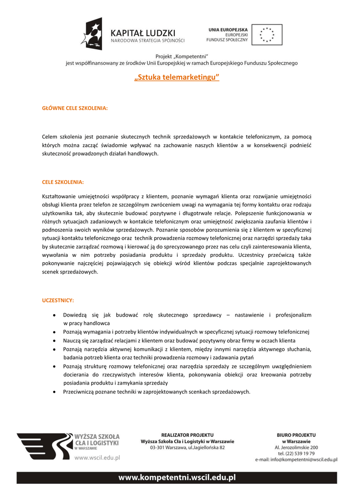„Sztuka telemarketingu” GŁÓWNE CELE SZKOLENIA: Celem szkolenia jest poznanie skutecznych technik sprzedażowych w kontakcie telefonicznym, za pomocą których można zacząć świadomie wpływać na zachowanie naszych klientów a w konsekwencji podnieść skuteczność prowadzonych działań handlowych. CELE SZKOLENIA: Kształtowanie umiejętności współpracy z klientem, poznanie wymagań klienta oraz rozwijanie umiejętności obsługi klienta przez telefon ze szczególnym zwróceniem uwagi na wymagania tej formy kontaktu oraz rodzaju użytkownika tak, aby skutecznie budować pozytywne i długotrwałe relacje. Polepszenie funkcjonowania w różnych sytuacjach zadaniowych w kontakcie telefonicznym oraz umiejętność zwiększania zaufania klientów i podnoszenia swoich wyników sprzedażowych. Poznanie sposobów porozumienia się z klientem w specyficznej sytuacji kontaktu telefonicznego oraz technik prowadzenia rozmowy telefonicznej oraz narzędzi sprzedaży taka by skutecznie zarządzać rozmową i kierować ją do sprecyzowanego przez nas celu czyli zainteresowania klienta, wywołania w nim potrzeby posiadania produktu i sprzedaży produktu. Uczestnicy przećwiczą także pokonywanie najczęściej pojawiających się obiekcji wśród klientów podczas specjalnie zaprojektowanych scenek sprzedażowych. UCZESTNICY: Dowiedzą się jak budować rolę skutecznego sprzedawcy – nastawienie i profesjonalizm w pracy handlowca Poznają wymagania i potrzeby klientów indywidualnych w specyficznej sytuacji rozmowy telefonicznej Nauczą się zarządzać relacjami z klientem oraz budować pozytywny obraz firmy w oczach klienta Poznają narzędzia aktywnej komunikacji z klientem, między innymi narzędzia aktywnego słuchania, badania potrzeb klienta oraz techniki prowadzenia rozmowy i zadawania pytań Poznają strukturę rozmowy telefonicznej oraz narzędzia sprzedaży ze szczególnym uwzględnieniem docierania do rzeczywistych interesów klienta, pokonywania obiekcji oraz kreowania potrzeby posiadania produktu i zamykania sprzedaży Przeciwniczą poznane techniki w zaprojektowanych scenkach sprzedażowych. Szkolenie zawiera: Wszystkie elementy klasycznego kursu efektywnej sprzedaży przez telefon Pełen zestaw narzędzi niezbędny do podwyższenia efektywności prowadzonych działań handlowych Wiedzę, jak skutecznie przeprowadzić klienta przez transakcję tak aby obie strony były zadowolone z rezultatów Sposób realizacji: Szkolenie przeprowadzone będzie podczas dwóch dni (16 godzin) w trakcie którego uczestnicy będą mogli poznać najważniejsze narzędzia sprzedaży i obsługi klienta zakończone modułem sprzedażowym pozwalającym na przećwiczenie poznanych technik. MODUŁ I – PRZYGOTOWANIE I PLANOWANIE DZIAŁAŃ TELEMARKETINGOWYCH – WPROWADZENIE W OBSZAR TELEMARKETINGU Telemarketing – podejście nowoczesne i tradycyjne; Telemarketing jako sposób pozyskiwania klientów; Prawo wielkich liczb; Nastawienie kluczem do sukcesu w rozmowie telefonicznej; Zarządzanie czasem rozmowy i ustalania priorytetów; MODUŁ II – BUDOWANIE WŁASNEGO WIZERUNKU I SAVOIR VIVRE W ROZMOWIE TELEFONICZNEJ – CZYLI KLUCZOWE ELEMENTY KOMUNIKACJI Znaczenie pierwszych sekund kontaktu telefonicznego; Poziom świadomy i nieświadomy rozmowy telefonicznej; Język prokliencki; Dopasowywanie się na poziomie werbalnym i niewerbalnym do rozmówcy; Praca głosem – o czym warto pamiętać; MODUŁ III – SPRAWDZONE TECHNIKI PROWADZENIA ROZMOWY HANDLOWEJ PRZEZ TELEFON – CZ.1 Etapy rozmowy telefonicznej – przychodzącej i wychodzącej; Typologia klientów – dopasowanie przekazu do stylu komunikacyjnego rozmówcy; Potrzeby psychologiczne i merytoryczne każdego z typów; Nawiązanie kontaktu – kluczowy etap w rozmowie telemarketingowej; Debiutowe zagrywki klientów – „nie jestem zainteresowany”,itp. MODUŁ IV – SPRAWDZONE TECHNIKI PROWADZENIA ROZMOWY HANDLOWEJ PRZEZ TELEFON - CZ.2 Badanie potrzeb klientów – poznaj firmę klienta i jego; Narzędzia kontroli rozmowy – sztuka zadawania pytań, parafrazowanie, klaryfikacja i inne; Aktywne słuchanie – słuchając słyszeć; Mówienie językiem korzyści – model Cecha-Zaleta-Korzyść; Budowanie argumentacji – słowa perswazyjne; MODUŁ V – SPRAWDZONE TECHNIKI PROWADZENIA ROZMOWY HANDLOWEJ PRZEZ TELEFON - CZ.3 Radzenie sobie z obiekcjami klientów – sprawdzone sposoby Radzenie sobie z typowymi zagrywkami klientów „jest za drogo”, „mam lepszą ofertę” oraz inne; Zielone światła do finalizowania; Sprawdzone techniki finalizacji; MODUŁ VI – ASERTYWNOŚĆ W KONTAKTACH TELEFONICZNYCH – SKUTECZNE SPOSOBY RADZENIA SOBIE Z TRUDNYMI SYTUACJAMI Prawa asertywności; Radzenie sobie z agresywnym rozmówcą – asertywne stawianie granic; Rozmowa z Klientem nastawionym na "nie"; Radzenie sobie z Klientem dominującym w rozmowie; Rozmowa z klientem, któremu muszę odmówić;