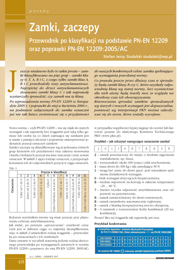 porady Zamki, zaczepy Przewodnik po klasyfikacji na podstawie PN-EN 12209 oraz poprawki PN-EN 12209:2005/AC Stefan Jerzy Siudalski [email protected] eszcze niedawno było to takie proste – zamki klasyfikowano na pięć grup – zamki klasy 0, T, A, B i C, z czego tylko zamki klas A, B i C przechodziły testy antywłamaniowe. Najczęściej do drzwi antywłamaniowych stosowano zamki klasy C i tak naprawdę wystarczyło sprawdzić, czy zamek ma tę klasę. Po wprowadzeniu normy PN-EN 12209 w listopadzie 2005 r. i poprawki do niej w kwietniu 2006 r., na podstawie załączonych do zamka oznaczeń już nie tak łatwo zorientować się o przydatności do naszych konkretnych celów zamka spełniającego wymagania powołanej normy. Co prawda jeszcze przez dłuższy czas w sprzedaży będą zamki klasy B czy C, które uzyskały odpowiednią klasę wg starej normy, lecz wystawione dla nich atesty będą traciły moc ze względu na określony czas ich obowiązywania. Równoczesna sprzedaż zamków sprawdzanych wg starych i nowych wymagań jest dopuszczalna, ponieważ wg interpretacji PKN można odwoływać się do norm, które zostały wycofane. Nowa norma – czyli PN-EN 12209 – ma się nijak do starych wymagań i tak naprawdę bez ściągawki pod ręką tylko geniusz lub osoba na co dzień zajmująca się zamkami jest w stanie z pamięci odczytać i poprawnie zinterpretować jedenaście pozycji oznaczeń zamków. Zamki i zaczepy są sklasyfikowane wg aż jedenastu różnych grup kryteriów ich przydatności oraz zakresu stosowania i każda z kolejnych pozycji ma inne znaczenie i inny zestaw oznaczeń. W tabeli 1 ujęto rodzaje oznaczeń, z przyporządkowaniem ich do odpowiednich pozycji w ciągu oznaczeń. w przypadku wątpliwości lepiej sięgnąć do normy lub kierować pytanie do właściwego Komitetu Technicznego PKN (www.pkn.pl). J 11 Cyfra 0 lub litery od A do H Cyfry od 1 do 2 10 Cyfry od 0 do 4 Cyfry od 1 do 9 9 Cyfra 0 lub litery od A do H Litery od A do X Litery od A do T Pozycja w klasyfikacji 4 5 6 7 8 Cyfry od 1 do 7 3 Cyfra 0 lub litery od A do G 2 Cyfra 0 1 Cyfry od 1 do 3 Oznaczenia Tab. 1 Kolorem wyróżniłem istotne wg mnie pozycje przy planowaniu ochrony antywłamaniowej. Jak widać, po pewnym „uproszczeniu” czytelność oznaczeń jest w dalszym ciągu co najmniej skomplikowana, więc w tabeli 2 umieściłem rodzaj ściągawki – przewodnika po oznaczeniach i ich symbolach. Dane zawarte w tej tabeli stanowią jedynie rodzaj skróconego przewodnika po wymaganiach zawartych w normie PN-EN 12209 i poprawce do niej PN-EN 12209: 2005/AC; nr 4, LIPIEC – SIERPIEŃ 2007 48 Przykład – jak odczytać następujące oznaczenie zamka? 2 C 1 1 0 E 7 E E 3 E 2 – zamek przeznaczony do miejsc o średnim zagrożeniu wandalizmem, np. biura, C – wytrzymałość około 100 tysięcy cykli uruchomienia, 1 – masa drzwi do 100 kg i siła zamykająca 50 N 1 – mogą być użyte do drzwi ppoż. pod warunkiem spełnienia dodatkowych wymagań, 0 – brak wymagań dotyczących bezpieczeństwa, E – średnia odporność na korozję w zakresie temperatury –20 ... 80 °C, 7 – bardzo wysoka odporność antywłamaniowa oraz odporność na przewiercenie, E – zamek nawierzchniowy do drzwi rozwiernych, E – zamek zastawkowy automatycznie ryglowany, 3 – zamek z klamką bezsprężynową mocno obciążoną, E – 6 zastawek z rozszerzeniem liczby kombinacji (20 tys. kombinacji). Proste? Bez tej ściągawki tak naprawdę ani rusz. Przykład kodowania: Kolejność w oznaczeniach Tab. 2. Oznaczenia klasyfikacji zamków 1. 1 – mieszkania, 2 – biura, 3 – szkoły 2. A, B, C – kolejno 50 tys. 100 tys. oraz 200 tys. cykli bez obciążania zapadki, F, G, H – jw. z obciążeniem zapadki siłą 10 N, L, M, – kolejno 100 tys i 200 tys cykli z obciążeniem zapadki 25 N, R, S – jw. z obciążeniem zapadki 50 N, W, X – jw. z obciążeniem zapadki 120 N 3. 1 – masa drzwi do 100kg, siła zamykająca 50 N, 2 – masa drzwi do 200 kg, siła jw., 3 – masa drzwi > 200 kg, siła jw., 4 – masa drzwi do 100 kg, siła zamykająca 25 N, 5 – masa drzwi do 200 kg, siła jw., 6 – masa drzwi > 200 kg, siła jw., 7 – masa drzwi do 100 kg, siła zamykająca 15 N, 8 – masa drzwi do 200 kg, siła jw., 9 – masa drzwi > 200 kg, siła jw. 4. 0 – brak dopuszczenia do drzwi ppoż., 1 – odpowiednie do drzwi ppoż. pod warunkiem... 5. 0 – brak wymagań dotyczących bezpieczeństwa 6. 7. 8. 0 A B C D E F G 1 2 3 4 5 6 7 – – A B C D E F H J ––––– K L M N P R S T 9. 10. 11. 1) 0 A B C D E F G H 0 1 2 3 4 0 A B C D E F G H – nieokreślona odporność na korozję, brak wymagań temperaturowych, – niska, brak wymagań temperaturowych, – średnia, brak wymagań temperaturowych, – wysoka, brak wymagań temperaturowych, – bardzo wysoka, brak wymagań temperaturowych, – średnia, zakres temperatur –20 ... +80 °C, – wysoka, zakres temperatur –20 ... +80 °C, – bardzo wysoka, zakres temperatur –20 ... 80 °C – zabezpieczenia minimalne, bez badania odporności na nawiercenia, – zabezpieczenia niskie, bez badania odporności na nawiercenia, – zabezpieczenia średnie, bez badania odporności na nawiercenia, – zabezpieczenia wysokie, bez badania odporności na nawiercenia, – zabezpieczenia wysokie, z odpornością na nawiercenia, – zabezpieczenia bardzo wysokie, bez odporności na nawiercenia, – zabezpieczenia bardzo wysokie, z odpornością na nawiercenia, Typ zamka Typ zamka Drzwi Drzwi Wyjście wpuszczany wierzchni rozwierane przesuwne kontrolowane tak – tak tak tak – tak – tak – – tak – tak tak tak – tak tak – – tak – tak tak – tak – – tak – do wewnątrz – ––––– ––––– ––––– ––––– ––––– tak – tak – wyjście tak – – tak kontrolowane – tak tak – kluczem, – tak – tak dotyczy tak – – – pozycji – tak tak – od K do T tak – tak – do wew. tak – tak ta
