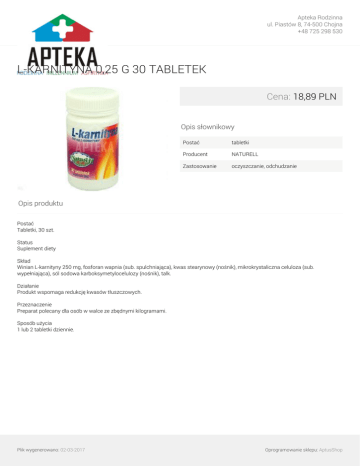 Apteka Rodzinna ul. Piastów 8, 74-500 Chojna +48 725 298 530 L-KARNITYNA 0,25 G 30 TABLETEK Cena: 18,89 PLN Opis słownikowy Postać tabletki Producent NATURELL Zastosowanie oczyszczanie, odchudzanie Opis produktu Postać Tabletki, 30 szt. Status Suplement diety Skład Winian L-karnityny 250 mg, fosforan wapnia (sub. spulchniająca), kwas stearynowy (nośnik), mikrokrystaliczna celuloza (sub. wypełniająca), sól sodowa karboksymetylocelulozy (nośnik), talk. Działanie Produkt wspomaga redukcję kwasów tłuszczowych. Przeznaczenie Preparat polecany dla osób w walce ze zbędnymi kilogramami. Sposób użycia 1 lub 2 tabletki dziennie. Plik wygenerowano: 02-03-2017 Powered by TCPDF (www.tcpdf.org) Oprogramowanie sklepu: AptusShop