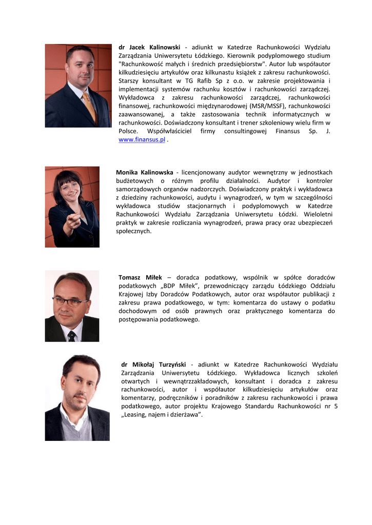 dr Jacek Kalinowski - adiunkt w Katedrze Rachunkowości Wydziału Zarządzania Uniwersytetu Łódzkiego. Kierownik podyplomowego studium "Rachunkowośd małych i średnich przedsiębiorstw". Autor lub współautor kilkudziesięciu artykułów oraz kilkunastu książek z zakresu rachunkowości. Starszy konsultant w TG Rafib Sp z o.o. w zakresie projektowania i implementacji systemów rachunku kosztów i rachunkowości zarządczej. Wykładowca z zakresu rachunkowości zarządczej, rachunkowości finansowej, rachunkowości międzynarodowej (MSR/MSSF), rachunkowości zaawansowanej, a także zastosowania technik informatycznych w rachunkowości. Doświadczony konsultant i trener szkoleniowy wielu firm w Polsce. Współwłaściciel firmy consultingowej Finansus Sp. J. www.finansus.pl . Monika Kalinowska - licencjonowany audytor wewnętrzny w jednostkach budżetowych o różnym profilu działalności. Audytor i kontroler samorządowych organów nadzorczych. Doświadczony praktyk i wykładowca z dziedziny rachunkowości, audytu i wynagrodzeo, w tym w szczególności wykładowca studiów stacjonarnych i podyplomowych w Katedrze Rachunkowości Wydziału Zarządzania Uniwersytetu Łódzki. Wieloletni praktyk w zakresie rozliczania wynagrodzeo, prawa pracy oraz ubezpieczeo społecznych. Tomasz Miłek – doradca podatkowy, wspólnik w spółce doradców podatkowych „BDP Miłek”, przewodniczący zarządu Łódzkiego Oddziału Krajowej Izby Doradców Podatkowych, autor oraz współautor publikacji z zakresu prawa podatkowego, w tym: komentarza do ustawy o podatku dochodowym od osób prawnych oraz praktycznego komentarza do postępowania podatkowego. dr Mikołaj Turzyński - adiunkt w Katedrze Rachunkowości Wydziału Zarządzania Uniwersytetu Łódzkiego. Wykładowca licznych szkoleo otwartych i wewnątrzzakładowych, konsultant i doradca z zakresu rachunkowości, autor i współautor kilkudziesięciu artykułów oraz komentarzy, podręczników i poradników z zakresu rachunkowości i prawa podatkowego, autor projektu Krajowego Standardu Rachunkowości nr 5 „Leasing, najem i dzierżawa”.