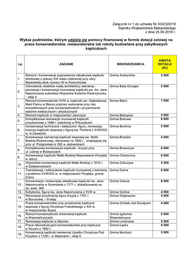 Załącznik nr 1 do uchwały Nr XXII/322/16 Sejmiku Województwa Małopolskiego z dnia 25.04.2016 r. Wykaz podmiotów, którym udziela się pomocy finansowej w formie dotacji celowej na prace konserwatorskie, restauratorskie lub roboty budowlane przy zabytkowych kapliczkach Lp. 1. 2. 3. 4. 5. 6. 7. 8. 9. 10. 11. 12. 13. 14. 15. 16. 17. 18. 19. ZADANIE Remont i konserwacja wyposażenia zabytkowej kapliczki domkowej z połowy XIX wieku położonej przy ulicy Beskidzkiej obok numeru 50 w Andrychowie Odnowienie obiektów małej architektury sakralnej – pionizacja i konserwacja murowanej kapliczki pw. św. Jana Nepomucena autorstwa Wojciecha Kułacha Wawrzyńcoka – etap II Remont konserwatorski XVIII w. kapliczki pw. Najświętszej Marii Panny w Bieczu poprzez wykonanie przy niej kompleksowych prac konserwatorskich i przywrócenie walorów estetycznych i artystycznych Remont kapliczki w miejscowości Jawczyce Kompleksowa renowacja murowanej kapliczki przydomowej z 1888 r. położonej w Wilczyskach Konserwacja techniczna i estetyczna figury, renowacja korpusu kapliczki słupowej z figurą św. Floriana z XVIII/XIX w. w Zawadzie Konserwacja kamiennej kapliczki słupowej pw. Matki Boskiej Różańcowej, datowanej na 1892 r., znajdującej się przy ul. Podgórskiej nr 262 w Jadownikach Kompleksowa konserwacja kapliczki - krzyża przy ul. Leśnej w Brzeszczach Konserwacja kapliczki Matki Boskiej Niepokalanie Poczętej w Jelczy Wykonanie konserwacji kapliczki Matki Boskiej z 1910 r. w Dziekanowicach Translokacja i odtworzenie kapliczki murowanej z kamienia z przełomu XVIII/XIX w. w miejscowości Porąbka, gmina Dobra Konserwacja i restauracja zabytkowej kapliczki św. Jana Nepomucena w Szreniawie z 1771 r. zlokalizowanej na dz. ewid. 369 Kobylanka, figura św. Jana Nepomucena z XVIII w. Renowacja przydrożnej figury krzyża z 1761 r. w Borusowej – III etap Prace konserwatorskie przy przydrożnej kapliczce słupowej z figurą Chrystusa Frasobliwego z XIX w. w miejscowości Bujne Remont konserwatorski drewnianej kapliczki w Wawrzeńczycach Renowacja kapliczki w Męcinie Prace rekonstrukcyjno-konserwatorskie przy kapliczce w Kiczyni z 1882 r. Konserwacja kapliczki kamiennej Upadku Chrystusa Pod Krzyżem z 1728 r. w Skawcach – etap II WNIOSKODAWCA KWOTA DOTACJI (ZŁ) Gmina Andrychów 5 000 Gmina Biały Dunajec 5 000 Gmina Biecz 7 000 Gmina Biskupice Gmina Bobowa 5 000 6 000 Gmina Bochnia 5 000 Gmina Brzesko 4 000 Gmina Brzeszcze 6 000 Gmina Charsznica 6 000 Gmina Dobczyce 5 000 Gmina Dobra 8 000 Gmina Gołcza 6 000 Gmina Gorlice Gmina Gręboszów 4 000 5 000 Gmina Gródek nad Dunajcem 4 000 Gmina IgołomiaWawrzeńczyce Gmina Limanowa Gmina Łącko 5 000 Gmina Mucharz 5 000 5 000 6 000 20. 21. 22. 23. 24. 25. 26. 27. 28. 29. 30. 31. 32. 33. 34. 35. 36. 37. 38. 39. 40. 41. 42. 43. 44. 45. 46. Prace restauratorskie przy kapliczce z rzeźbą Jana Nepomucena zlokalizowanej w sąsiedztwie Zamku Kmitów i Lubomirskich w Nowym Wiśniczu Kontynuacja prac konserwatorskich kapliczki św. Jana Nepomucena w Głębowicach Remont murowanej przydrożnej kapliczki w Łowczówku z roku 1658 – kontynuacja etap III: remont tynków zewnętrznych oraz konserwacja pokrycia dachowego Konserwacja kapliczki św. Jana Nepomucena w Mokrej Wsi Konserwatorskie prace ratunkowe kapliczki z początku XIX w. św. Jana Nepomucena w Piekarach Wykonanie prac konserwatorskich i restauratorskich przy kapliczce św. Jana Chrzciciela z drugiej połowy XIX w. w Biskupicach Radłowskich Renowacja kapliczki figuralnej dłuta rzeźbiarza Antoniego Hybla Renowacja zabytkowego pomnika – kapliczki na cmentarzu choleryczny w Łosiu Kompleksowa konserwacja techniczna i estetyczna kapliczki z 1828 r. pw. Matki Boskiej Bolesnej w Sieprawiu Odnowa kapliczki (figury) Matki Boskiej w miejscowości Maciejów Kompleksowa renowacja kapliczki słupowej z 1866 r. zwieńczonej figurą św. Jana Nepomucena zlokalizowanej w miejscowości Ryczów Prace remontowo-konserwatorskie barokowej kapliczki z 1779 r. pw. św. Kingi w Starym Sączu (kontynuacja – etap III) Renowacja przydrożnej figury Matki Boskiej Bolesnej z 1820 r. w Zakrzowie Konserwacja kamiennej kapliczki z ujęciem wody z przełomu XIX i XX w. w Harbutowicach, etap I Konserwacja zabytkowej kapliczki kamiennej z 1910 roku w Świdrówce, gmina Szczucin Kompleksowy remont kapliczki przydrożnej pw. św. Jana Nepomucena z ok. 1830 r. w miejscowości Swoszowa Remont zabytkowej kapliczki domkowej pw. Najświętszego Serca Jezusowego w Łękawce Remont kapliczki Kłósków w Trzcianie Prace konserwatorskie przy kapliczce przydrożnej z 1901 roku przy ul. Mickiewicza w Tuchowie Prace remontowo-konserwatorskie kapliczki w Tymbarku przedstawiającej modlitwę Chrystusa w Ogrojcu z 1933 r. Remont figury przydrożnej – krzyża w Gładyszowie Rewitalizacja kapliczki słupowej „Serca Matki Bożej” z 1892 roku, zlokalizowanej na terenie gminy Wadowice w miejscowości Barwałd Dolny Pełna konserwacja techniczna i estetyczna kapliczki słupowej zwieńczonej krzyżem z roku 1899 w miejscowości Chorągwica Konserwacja kapliczki słupowej z obrazem przedstawiającym Matkę Bożą z XVIII wieku w Wiśniowej Wykonanie prac remontowo-konserwatorskich kapliczki pw. Upadku Chrystusa w Budzyniu Odnowienie rzeźby kamiennej z przełomu XIX/XX wieku znajdującej się w Siedliszowicach, dz. nr 393 Remont i konserwacja przydrożnej kapliczki z 1909 roku w miejscowości Łąkta Górna, gmina Żegocina Gmina Nowy Wiśnicz 5 000 Gmina Osiek 5 000 Gmina Pleśna 5 000 Gmina Podegrodzie 7 000 Gmina Proszowice 6 000 Gmina Radłów 5 000 Gmina Ropa 6 000 Gmina Ropa 3 000 Gmina Siepraw 6 000 Gmina Słaboszów 5 000 Gmina Spytkowice 5 000 Gmina Stary Sącz 5 000 Gmina Stryszów 6 000 Gmina Sułkowice 11 000 Gmina Szczucin 8 000 Gmina Szerzyny 8 000 Gmina Tarnów 7 000 Gmina Trzciana 5 000 Gmina Tuchów 6 000 Gmina Tymbark 7 000 Gmina Uście Gorlickie Gmina Wadowice 7 000 6 000 Gmina Wieliczka 6 000 Gmina Wiśniowa 6 00