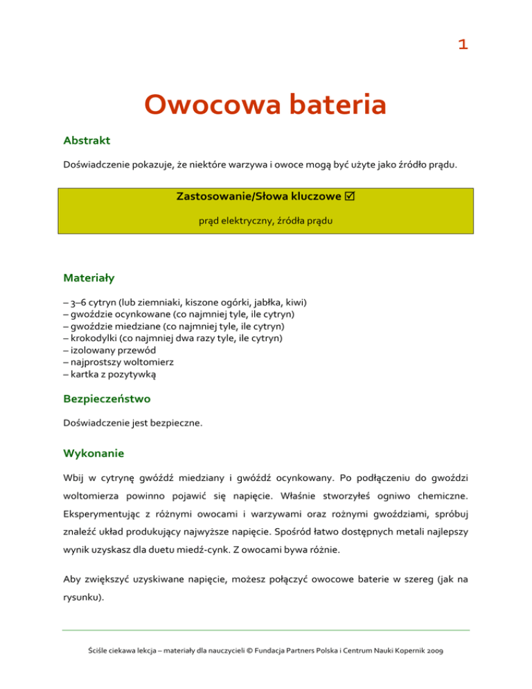 1 Owocowa bateria Abstrakt Doświadczenie pokazuje, że niektóre warzywa i owoce mogą być użyte jako źródło prądu. Zastosowanie/Słowa kluczowe prąd elektryczny, źródła prądu Materiały – 3–6 cytryn (lub ziemniaki, kiszone ogórki, jabłka, kiwi) – gwoździe ocynkowane (co najmniej tyle, ile cytryn) – gwoździe miedziane (co najmniej tyle, ile cytryn) – krokodylki (co najmniej dwa razy tyle, ile cytryn) – izolowany przewód – najprostszy woltomierz – kartka z pozytywką Bezpieczeństwo Doświadczenie jest bezpieczne. Wykonanie Wbij w cytrynę gwóźdź miedziany i gwóźdź ocynkowany. Po podłączeniu do gwoździ woltomierza powinno pojawić się napięcie. Właśnie stworzyłeś ogniwo chemiczne. Eksperymentując z różnymi owocami i warzywami oraz rożnymi gwoździami, spróbuj znaleźć układ produkujący najwyższe napięcie. Spośród łatwo dostępnych metali najlepszy wynik uzyskasz dla duetu miedź‐cynk. Z owocami bywa różnie. Aby zwiększyć uzyskiwane napięcie, możesz połączyć owocowe baterie w szereg (jak na rysunku). Ściśle ciekawa lekcja – materiały dla nauczycieli © Fundacja Partners Polska i Centrum Nauki Kopernik 2009 2 Wytłumaczenie Jak to się dzieje, że w drucie płynie prąd? Prąd to powolny dryf elektronów z obszaru, gdzie jest ich „za dużo”. Zatem na jednym gwoździu powstaje nadmiar elektronów (ujemny potencjał elektryczny), które drutem popłyną do drugiego gwoździa (dodatni potencjał elektryczny). Spróbujmy teraz odpowiedzieć na pytanie, na którym gwoździu (miedzianym czy ocynkowanym) i dlaczego, powstaje nadmiar elektronów. Wyobraźmy sobie, że mamy słoik kwasu siarkowego (H 2 SO 4 ). Jeżeli umieścimy w nim cynkowy pręt, żrący kwas natychmiast zacznie go rozpuszczać. Pojawią się bąbelki wodoru zbierające się na powierzchni cynku. Oto co dokładnie się dzieje: 1. cząsteczki kwasu rozpadają się na trzy jony: H+ H+ i SO42‐ 2. atomy cynku na powierzchni pręta tracą dwa elektrony (2e‐) i stają się jonami Zn2+ (reakcja utleniania – tę elektrodę nazywamy anodą) 3. jony Zn2+ łączą się z jonami SO42‐, tworząc ZnSO 4 , który rozpuszcza się w kwasie 4. elektrony z atomów cynku łączą się z jonami H+ i tworzą cząsteczki H 2 (wodór gazowy). W owocach co prawda nie ma silnego kwasu siarkowego, tylko inne, łagodniejsze kwasy organiczne, ale proces przebiega podobnie. Przyglądając się przedstawionemu zespołowi reakcji dochodzimy do wniosku, że jest to mechanizm przeniesienia dwóch elektronów z atomu Zn na dwa jony H+. Z energetycznego punktu widzenia takie przeniesienie jest dla układu korzystne. Okazuje się, że miedź w tych samych warunkach niechętnie oddaje elektrony. Przeniesienie elektronów z atomu Cu na jony H+ wymagałoby dostarczenia do Ściśle ciekawa lekcja – materiały dla nauczycieli © Fundacja Partners Polska i Centrum Nauki Kopernik 2009 3 układu energii, jest więc energetycznie niekorzystne. Mało tego. Jeśli w okolicy elektrody miedzianej w sposób spontaniczny powstaną jony Cu2+, to chętniej przyjmą jakiś zawieruszony elektron niż przyłączą się do reszty kwasowej SO42‐. Co się stanie, gdy połączymy elektrody Zn i Cu drutem (czyli gdy stworzymy elektronom łatwą drogę między tymi elektrodami)? Elektrony „wyczują” następującą sytuację: od strony elektrody cynkowej będą „przywoływane” z pewną siłą przez jony H+, ale od strony elektrody miedzianej będą „przywoływane” przez jony H+ i dodatkowo przez chętnie je przyjmujące jony Cu2+. Elektrony będą miały więc większe powinowactwo do strony miedzianej i tam właśnie przepłyną! Otrzymamy prąd! Bąbelki wodoru będą wydzielały się głównie na elektrodzie miedzianej, gdyż tam „przylatują” elektrony z elektrody cynkowej. Okazuje się, że każdy metal ma naturalną tendencję do oddawania elektronów w środowisku jonów H+. Mówi o tym potencjał elektrochemiczny. Im bardziej ujemny jest ten potencjał, tym chętniej metal oddaje elektrony jonom H+. Im bardziej jest dodatni, tym trudniej metal oddaje elektrony (możemy też powiedzieć, że tym chętniej je przyjmuje). Metale można ułożyć w szereg od najniższego do najwyższego potencjału elektrochemicznego, tzw. szereg elektrochemiczny (w tabelce poniżej znajdują się tylko niektóre metale). Elektrony zawsze przepływają od metalu o niższym potencjale do metalu o wyższym potencjale elektrochemicznym i robią to tym „szybciej”, im większa jest różnica między tymi potencjałami. Nazwa pierwiastka Symbol pierwiastka Potencjał [V] Potas K ‐2,92 Wapń Ca ‐2,84 Sód Na ‐2,71 Magnez Mg ‐2,38 Glin Al ‐1,66 Cynk Zn ‐0,76 Chrom Cr ‐0,71 Żelazo Fe ‐0,44 Nikiel Ni ‐0,24 Ściśle ciekawa lekcja – materiały dla nauczycieli © Fundacja Partners Polska i Centrum Nauki Kopernik 2009 4 Ołów Pb ‐0,13 Wodór H 0 Miedź Cu +0,37 Srebro Ag +0,8 Rtęć Hg +0,85 Platyna Pt +1,2 Złoto Au +1,42 Z przedstawionej tabeli można wywnioskować, że bateria oparta na cynku i złocie byłaby znacznie lepsza od tej opartej na cynku i miedzi (powinna generować większe napięcie elektryczne). Czy ktoś zechce poświęcić swoją złotą biżuterię, żeby to sprawdzić? Rozwiązywanie problemów Najbardziej wydajna bateria powstaje na bazie ogórków kiszonych. Żeby zasilić kartkę z pozytywką, wystarczą trzy ogórki, podczas gdy cytryn potrzeba ok. sześciu. Jeśli zamiast pozytywki używa się diody, trzeba pamiętać, że dioda zapala się tylko przy prawidłowym podłączeniu („+” baterii należy połączyć z dłuższą nóżką diody). Testując różne owoce i warzywa, trzeba pamiętać o wymyciu gwoździ przed przełożeniem do innej „baterii”. Jeśli na metalu pozostanie sok z poprzednio użytego owocu lub warzywa, wyniki będą zafałszowane. Po zakończeniu doświadczenia powinno się wymyć i osuszyć gwoździe (będą dłużej służyły)