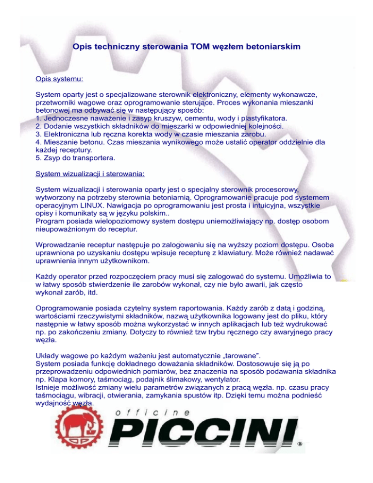 Opis techniczny sterowania TOM węzłem betoniarskim Opis systemu: System oparty jest o specjalizowane sterownik elektroniczny, elementy wykonawcze, przetworniki wagowe oraz oprogramowanie sterujące. Proces wykonania mieszanki betonowej ma odbywać się w następujący sposób: 1. Jednoczesne naważenie i zasyp kruszyw, cementu, wody i plastyfikatora. 2. Dodanie wszystkich składników do mieszarki w odpowiedniej kolejności. 3. Elektroniczna lub ręczna korekta wody w czasie mieszania zarobu. 4. Mieszanie betonu. Czas mieszania wynikowego może ustalić operator oddzielnie dla każdej receptury. 5. Zsyp do transportera. System wizualizacji i sterowania: System wizualizacji i sterowania oparty jest o specjalny sterownik procesorowy, wytworzony na potrzeby sterownia betoniarnią. Oprogramowanie pracuje pod systemem operacyjnym LINUX. Nawigacja po oprogramowaniu jest prosta i intuicyjna, wszystkie opisy i komunikaty są w języku polskim.. Program posiada wielopoziomowy system dostępu uniemożliwiający np. dostęp osobom nieupoważnionym do receptur. Wprowadzanie receptur następuje po zalogowaniu się na wyższy poziom dostępu. Osoba uprawniona po uzyskaniu dostępu wpisuje recepturę z klawiatury. Może również nadawać uprawnienia innym użytkownikom. Każdy operator przed rozpoczęciem pracy musi się zalogować do systemu. Umożliwia to w łatwy sposób stwierdzenie ile zarobów wykonał, czy nie było awarii, jak często wykonał zarób, itd. Oprogramowanie posiada czytelny system raportowania. Każdy zarób z datą i godziną, wartościami rzeczywistymi składników, nazwą użytkownika logowany jest do pliku, który następnie w łatwy sposób można wykorzystać w innych aplikacjach lub też wydrukować np. po zakończeniu zmiany. Dotyczy to również tzw trybu ręcznego czy awaryjnego pracy węzła. Układy wagowe po każdym ważeniu jest automatycznie „tarowane”. System posiada funkcję dokładnego doważania składników. Dostosowuje się ją po przeprowadzeniu odpowiednich pomiarów, bez znaczenia na sposób podawania składnika np. Klapa komory, taśmociąg, podajnik ślimakowy, wentylator. Istnieje możliwość zmiany wielu parametrów związanych z pracą węzła. np. czasu pracy taśmociągu, wibracji, otwierania, zamykania spustów itp. Dzięki temu można podnieść wydajność węzła.
