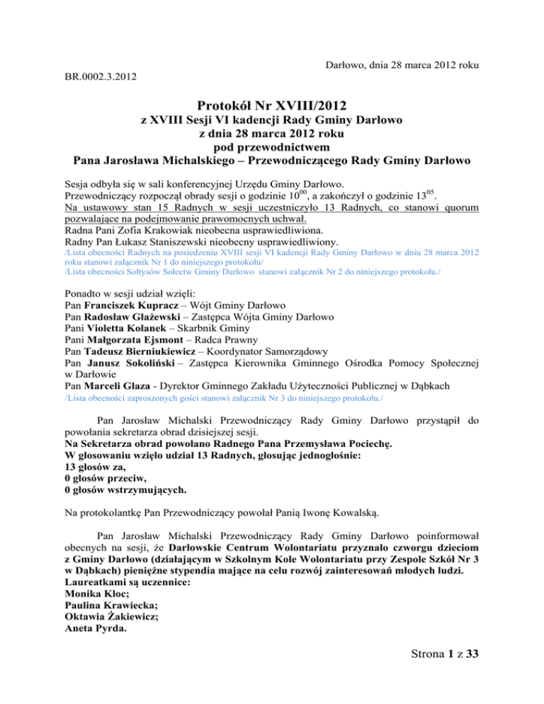Darłowo, dnia 28 marca 2012 roku BR.0002.3.2012 Protokół Nr XVIII/2012 z XVIII Sesji VI kadencji Rady Gminy Darłowo z dnia 28 marca 2012 roku pod przewodnictwem Pana Jarosława Michalskiego – Przewodniczącego Rady Gminy Darłowo Sesja odbyła się w sali konferencyjnej Urzędu Gminy Darłowo. Przewodniczący rozpoczął obrady sesji o godzinie 1000, a zakończył o godzinie 1305. Na ustawowy stan 15 Radnych w sesji uczestniczyło 13 Radnych, co stanowi quorum pozwalające na podejmowanie prawomocnych uchwał. Radna Pani Zofia Krakowiak nieobecna usprawiedliwiona. Radny Pan Łukasz Staniszewski nieobecny usprawiedliwiony. /Lista obecności Radnych na posiedzeniu XVIII sesji VI kadencji Rady Gminy Darłowo w dniu 28 marca 2012 roku stanowi załącznik Nr 1 do niniejszego protokołu/ /Lista obecności Sołtysów Sołectw Gminy Darłowo stanowi załącznik Nr 2 do niniejszego protokołu./ Ponadto w sesji udział wzięli: Pan Franciszek Kupracz – Wójt Gminy Darłowo Pan Radosław Głażewski – Zastępca Wójta Gminy Darłowo Pani Violetta Kolanek – Skarbnik Gminy Pani Małgorzata Ejsmont – Radca Prawny Pan Tadeusz Bierniukiewicz – Koordynator Samorządowy Pan Janusz Sokoliński – Zastępca Kierownika Gminnego Ośrodka Pomocy Społecznej w Darłowie Pan Marceli Glaza - Dyrektor Gminnego Zakładu Użyteczności Publicznej w Dąbkach /Lista obecności zaproszonych gości stanowi załącznik Nr 3 do niniejszego protokołu./ . Pan Jarosław Michalski Przewodniczący Rady Gminy Darłowo przystąpił do powołania sekretarza obrad dzisiejszej sesji. Na Sekretarza obrad powołano Radnego Pana Przemysława Pociechę. W głosowaniu wzięło udział 13 Radnych, głosując jednogłośnie: 13 głosów za, 0 głosów przeciw, 0 głosów wstrzymujących. Na protokolantkę Pan Przewodniczący powołał Panią Iwonę Kowalską. Pan Jarosław Michalski Przewodniczący Rady Gminy Darłowo poinformował obecnych na sesji, że Darłowskie Centrum Wolontariatu przyznało czworgu dzieciom z Gminy Darłowo (działającym w Szkolnym Kole Wolontariatu przy Zespole Szkół Nr 3 w Dąbkach) pieniężne stypendia mające na celu rozwój zainteresowań młodych ludzi. Laureatkami są uczennice: Monika Kloc; Paulina Krawiecka; Oktawia Żakiewicz; Aneta Pyrda. Strona 1 z 33 Pan Radosław Głażewski Zastępca Wójta Gminy Darłowo poprosił o wystąpienie laureatek na środek sali wraz z Panią Dorotą Kuriatą Prezes Darłowskiego Centrum Wolontariatu i Panią Wiesławą Grabińską Dyrektor Zespołu Szkół Nr 3 w Dąbkach. Pan Radosław Głażewski oznajmił, że ta czwórka młodzieży z Gminy Darłowo jako jedyni z Powiatu Sławieńskiego brała udział w konkursie i dostała nagrody pieniężne, które zostały dzisiaj wręczone na rozwinięcie ich pasji i zainteresowań. Następnie mówca przedstawił w skrócie funkcjonowanie Darłowskiego Centrum Wolontariatu: „Niedługo ukaże się wspaniały teledysk, który będzie można zobaczyć na stronie Darłowskiego Centrum Wolontariatu. Darłowskie Centrum Wolontariatu zajmuje się działalnością bezinteresowną na rzecz społeczeństwa. Możemy to zobaczyć w takich akcjach jak dzisiejsze wręczenie stypendium, które jest nowością – to jest pierwszy raz. Na rynku w Darłowie coroczne święto z okazji przyjazdu „Świętego Mikołaja”, dzieci się wspaniale bawią. Organizowane są akcje charytatywne, zbierane są pieniążki. Oczywiście znamy wszyscy „Działaj Lokalnie”, mamy trzech laureatów zeszłorocznych. Zachęcamy bardzo, aby w tym roku nasze Sołectwa i Stowarzyszenia brały udział, gdyż ogłoszony jest właśnie nabór. W tamtym roku Cisowo wygrało, Nowy Jarosław i Słowino „Fitness Babeczki”, także zachęcamy. Oraz taka dobra akcja dla Hani naszej z Sulimic – zbieramy nakrętki tu także, w Urzędzie, żeby wspomóc w leczeniu Hani. Także, zapraszamy do udziału. Darłowskie Centrum Wolontariatu w dalszym ciągu – chociaż jest wielu partnerów, tak jak Bank Spółdzielczy w Darłowie, jak Hotel „Delfin” w Dąbkach – szuka partnerów, aby rozwijać działalność tego stowarzyszenia.” Pani Dorota Kuriata Prezes Darłowskiego Centrum Wolontariatu serdecznie podziękowała wszystkim za to, że przyjaźnie podchodzą do Stowarzyszenia i włączają się do wielu akcji. „Uśmiech na twarzy to jest to, co nam mówi: „Dziękuję.” Serdecznie chciałam podziękować właśnie Gminie Darłowo, bo drzwi zawsze dla Centrum Wolontariatu są otwarte.” Pani Prezes oznajmiła, że Centrum Wolontariatu utrzymuje się tylko z pracy społecznej, a wszyscy członkowie stowarzyszenia są wolontariuszami i tym samym potwierdziła, że warto działać i warto robić coś dla innych. „Ci młodzi ludzie, właśnie te dziewczyny, które są stypendystkami od tego roku naszego Funduszu Stypendialnego pod nazwą „Wolontariusz z Pasją” oprócz tego, że dają siebie innym, chcą też rozwijać siebie i oprócz tego, że zmieniają świat na lepszy wokół siebie, chcą zmienić również troszkę siebie.” Laureatki otrzymały nagrody. Pan Radosław Głażewski Zastępca Wójta Gminy Darłowo ze strony przede wszystkim mieszkańców, radnych i wszystkich samorządowców podziękował bardzo Pani Dorocie Kuriata Prezes Stowarzyszenia, za działalność na rzecz mieszkańców Gminy Darłowo i wręczył bukiet kwiatów. Pani Dorota Kuriata Prezes Darłowskiego Centrum Wolontariatu podziękowała również Pani Wiesławie Grabińskiej Dyrektor Zespołu Szkół Nr 3 w Dąbkach, że w szkole może tak prężnie działać Szkolne Koło Wolontariatu. Ponadto mówczyni podziękowała Pani Koordynator Wolontariatu, która opiekuje się stypendystkami i wpaja im w serca, że warto pomagać innym, i warto działać. Ad. 1.3. Pan Jarosław Michalski Przewodniczący Rady Gminy Darłowo przystąpił do ustalenia porządku obrad, przy czym przypomniał, że proponowany porządek obrad wszyscy Radni otrzymali wraz z zawiadomieni