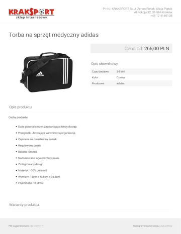 P.H.U. KRAKSPORT Sp.J. Zenon Piętak, Alicja Piętak Al.Pokoju 32, 31-564 Kraków +48 12 4140108 Torba na sprzęt medyczny adidas Cena od: 265,00 PLN Opis słownikowy Czas dostawy 2-5 dni Kolor Czarny Producent adidas Opis produktu Cechy produktu: Duża główna kieszeń zapewniająca łatwy dostęp. Przegródki ułatwiające wewnętrzną organizację. Zapinana na dwustronny zamek. Regulowany pasek. Boczna kieszeń. Nadrukowane logo oraz trzy paski. Zintegrowany design. Materiał: 100% poliamid. Wymiary: 15cm x 43,5cm x 33,5cm. Pojemność: 18 litrów. Warianty produktu Plik wygenerowano: 02-03-2017 Oprogramowanie sklepu: AptusShop P.H.U. KRAKSPORT Sp.J. Zenon Piętak, Alicja Piętak Al.Pokoju 32, 31-564 Kraków +48 12 4140108 uniwersalny Plik wygenerowano: 02-03-2017 Powered by TCPDF (www.tcpdf.org) 265,00 PLN Oprogramowanie sklepu: AptusShop