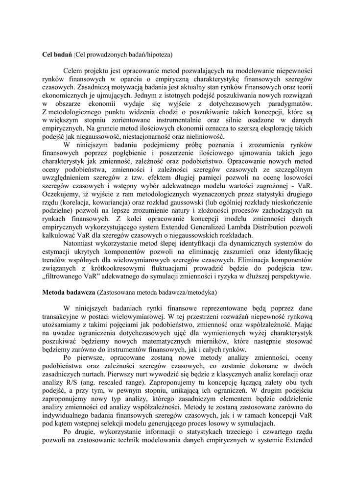 Cel badań (Cel prowadzonych badań/hipoteza) Celem projektu jest opracowanie metod pozwalających na modelowanie niepewności rynków finansowych w oparciu o empiryczną charakterystykę finansowych szeregów czasowych. Zasadniczą motywacją badania jest aktualny stan rynków finansowych oraz teorii ekonomicznych je ujmujących. Jednym z istotnych podejść poszukiwania nowych rozwiązań w obszarze ekonomii wydaje się wyjście z dotychczasowych paradygmatów. Z metodologicznego punktu widzenia chodzi o poszukiwanie takich koncepcji, które są w większym stopniu zorientowane instrumentalnie oraz silnie osadzone w danych empirycznych. Na gruncie metod ilościowych ekonomii oznacza to szerszą eksplorację takich podejść jak niegaussowość, niestacjonarność oraz nieliniowość. W niniejszym badaniu podejmiemy próbę poznania i zrozumienia rynków finansowych poprzez pogłębienie i poszerzenie ilościowego ujmowania takich jego charakterystyk jak zmienność, zależność oraz podobieństwo. Opracowanie nowych metod oceny podobieństwa, zmienności i zależności szeregów czasowych ze szczególnym uwzględnieniem szeregów z tzw. efektem długiej pamięci pozwoli na ocenę losowości szeregów czasowych i wstępny wybór adekwatnego modelu wartości zagrożonej - VaR. Oczekujemy, iż wyjście z ram metodologicznych wyznaczonych przez statystyki drugiego rzędu (korelacja, kowariancja) oraz rozkład gaussowski (lub ogólniej rozkłady nieskończenie podzielne) pozwoli na lepsze zrozumienie natury i złożoności procesów zachodzących na rynkach finansowych. Z kolei opracowanie koncepcji modelu zmienności danych empirycznych wykorzystującego system Extended Generalized Lambda Distribution pozwoli kalkulować VaR dla szeregów czasowych o niegaussowskich rozkładach. Natomiast wykorzystanie metod ślepej identyfikacji dla dynamicznych systemów do estymacji ukrytych komponentów pozwoli na eliminację zaszumień oraz identyfikację trendów wspólnych dla wielowymiarowych szeregów czasowych. Eliminacja komponentów związanych z krótkookresowymi fluktuacjami prowadzić będzie do podejścia tzw. „filtrowanego VaR” adekwatnego do symulacji zmienności i ryzyka w dłuższej perspektywie. Metoda badawcza (Zastosowana metoda badawcza/metodyka) W niniejszych badaniach rynki finansowe reprezentowane będą poprzez dane transakcyjne w postaci wielowymiarowej. W tej przestrzeni rozważań niepewność rynkową utożsamiamy z takimi pojęciami jak podobieństwo, zmienność oraz współzależność. Mając na uwadze ograniczenia dotychczasowych ujęć dla wymienionych wyżej charakterystyk poszukiwać będziemy nowych matematycznych mierników, które następnie stosować będziemy zarówno do instrumentów finansowych, jak i całych rynków. Po pierwsze, opracowane zostaną nowe metody analizy zmienności, oceny podobieństwa oraz zależności szeregów czasowych, co zostanie dokonane w dwóch zasadniczych nurtach. Pierwszy nurt wywodzić się będzie z klasycznych analiz korelacji oraz analizy R/S (ang. rescaled range). Zaproponujemy tu koncepcję łączącą zalety obu tych podejść, a przy tym, w pewnym stopniu, unikającą ich ograniczeń. W drugim podejściu zaproponujemy nowy typ analizy, którego zasadniczym elementem będzie oddzielenie analizy zmienności od analizy współzależności. Metody te zostaną zastosowane zarówno do indywidualnego badania finansowych szeregów czasowych, jak i w ramach koncepcji VaR pod kątem wstępnej selekcji modelu generującego proces losowy w symulacjach. Po drugie, wykorzystanie informacji o statystykach trzeciego i czwartego rzędu pozwoli na zastosowanie technik modelowania danych empirycznych w systemie Extended Generalized Lambda Distribution, w szczególności dla modeli VaR dla szeregów czasowych o niegaussowskich rozkładach. Po trzecie, zastosowanie metod ślepej identyfikacji sygnałów pozwoli na stworzenie modelu generującego wielowymiarowe finansowe szeregi czasowe. Zakładany ogólny dynamiczny system przestrzeni zmiennych stanów stwarza uniwersalną strukturę badania szerokiej klasy modeli m.in. ARMA, ARIMA. Otwiera to możliwość analizy wewnętrznych zależności oraz charakterystyk systemu generującego, co prowadzić może do nowych technik filtracji i estymacji trendów. Eliminacja wewnętrznych komponentów odpowiadających za krótkoterminowe fluktuacje pozwoli zaproponować tzw. filtrowany Value at Risk adekwatny do długoterminowych ocen ryzyka i zmienności, a w szczególności dla szeregów cechujących się zw. efektem długiej pamięci. Wpływ rezultatów (Wpływ spodziewanych rezultatów na rozwój nauki, cywilizacji, społeczeństwa) Patrząc na całokształt planowanych prac oczekujemy, iż badanie wzajemnie splecionych zagadnień: zmienności, współzależności, podobieństwa doprowadzi do lepszego zrozumienia złożonej natury niepewności rynkowej. Zamiarem pracy jest także wskazanie na metodologiczne kwestie rozwoju teorii ekonomicznej w kontekście dalszej i nieuniknionej automatyzacji, zarówno realnych rynków finansowych, jak i metod ich analizy. W szczególności, zaproponowany w pracy aparat pojęciowy i narzędziowy rozszerza aktualny stan wiedzy oraz możliwości poznania zjawisk rynkowych w odniesieniu do ryzyka i zmienności. Z kolei opracowanie nowych metod oceny podobieństwa, zmienności i współzależności szeregów czasowych oraz koncepcji modelowania zmienności danych empirycznych z wykorzystaniem systemu Extended Generalized Lambda Distribution w metodologii VaR dla szeregów o niegaussowskich rozkładach w sposób istotny przyczyni się wypełnienia luki w tym obszarze badawczym. Opracowanie metod ślepej separacji do identyfikacji ukrytych komponentów w dynamicznych systemach rynkowych pozwoli z jednej strony eliminować zaszumienia, a z drugiej strony identyfikować trendy, które są wspólne dla wielu szeregów czasowych. Eliminacja komponentów szumowych, związany