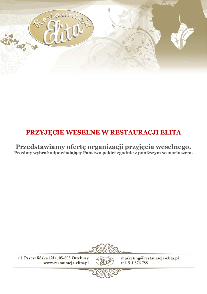 PRZYJĘCIE WESELNE W RESTAURACJI ELITA Przedstawiamy ofertę organizacji przyjęcia weselnego. Prosimy wybrać odpowiadający Państwu pakiet zgodnie z poniższym scenariuszem. SCENARIUSZ PRZYJĘCIA WESELNEGO Aperitiff w oczekiwaniu na Młodą Parę Tradycyjne powitanie Młodej Pary chlebkiem przez Rodziców Na początek serwujemy: 2 zupy do wyboru i 1 danie główne lub 2 dania główne do wyboru (po 50% każdej pozycji) Deser Danie gorące: „specjalność wieczoru” Tort weselny Danie gorące (np. Boeuf Stroganow) Danie gorące na zakończenie (np. barszczyk czerwony z pasztecikiem) OFERTA WESELNA 2016 ... miłość jest wtedy, kiedy chcesz z kimś przeżywać wszystkie cztery pory roku. Kiedy chcesz z kimś uciekać przed wiosenną burzą pod osypane kwieciem bzy, a latem zbierać z tym kimś jagody... i pływać w rzece. Jesienią robić razem powidła i uszczelniać okna przed wiatrem. Zimą - pomagać przetrwać katar i długie wieczory, a jak już będzie zimno, rozpalać razem w piecu. Janusz Leona Wiśniewski Szanowni Państwo, Dziękujemy za zainteresowanie ofertą weselną Restauracji Elita. Cieszymy się, że bierzecie nas Państwo pod uwagę szukając miejsca na organizację przyjęcia weselnego. Od 15 lat specjalizujemy się w organizacji wesel, imprez okolicznościowych oraz cateringu. Służymy naszym Gościom doświadczeniem i radą od momentu przekroczenia progu restauracji. Zdajemy sobie sprawę, że organizacja przyjęcia weselnego to ważne wydarzenie w Państwa rodzinie dlatego dołożymy wszelkich starań by zadbać o najdrobniejszy szczegół. Restauracja Elita to miejsce o niezapomnianej przyjaznej i rodzinnej atmosferze, będziecie Państwo czuć się u nas jak w domu. Zapewniamy Państwu: • • • • • • wyśmienitą kuchnię; profesjonalną obsługę kelnerską; opiekę wedding plannera przy ustalaniu szczegółów; doradztwo przy wyborze menu; opiekę wizażystki i florystki; elastyczność i indywidualne podejście do każdego klienta; Zapraszamy do zapoznania się z naszą ofertą. Zespół Restaura ELITARNE WESELE W PIĄTEK Cena przyjęcia weselnego w piątek to 220 zł /osoba (dla minimum 70 osób): dziecko (4-12 lat) - 60% ceny podstawowej obsługa (zespół muzyczny / Dj / fotograf / kamerzysta / ) 60% ceny Cena zawiera: o o o o o o o o o o o o o o o o o o menu składające się z 5 dań gorących i 14 przekąsek zimnych (w tym 3 sałatki); aperitiff na powitanie Gości weselnych; wódka w ilości 0,5l na parę (marki: Wyborowa, Żubrówka Biała, Bols, Smirnoff) bufet słodki oraz tort weselny w stylu amerykańskim (smak do wyboru); opiekę wizażystki dla Panny Młodej (makijaż próbny - gratis; usługa dopłata 450 zł) napoje bezalkoholowe, soki, woda mineralna (soki Hortex, napoje gazowane Coca- Cola, Fanta, Sprite w butelkach plastikowych 0,5l) obsługę kelnerską (nasz standard to 1 kelner na ok 25 osób); pokój VIP dla nowożeńców oraz dwa pokoje dwuosobowe ze śniadaniem do dyspozycji Rodziców Państwa Młodych lub Gości; rozwinięcie czerwonego dywanu na wejście Młodej Pary; organizację przyjęcia weselnego przy stołach prostokątnych (do 130 osób) dekoracje kwiatowe w stylu pastel vintage – bukiety na stołach, w hollu oraz toaletach; chlebek dla rodziców na powitanie Młodej Pary; teren wokół restauracji do wyłącznej dyspozycji w godzinach zawartych w umowie; pokaz zdjęć przygotowany przez Młodą Parę na monitorze znajdującym się w holu; „pakiet awaryjny” ustawiony w toaletach damskich zawierający artykuły pomocne w sytuacjach awaryjnych np. igła z nitką, plasterki z opatrunkiem itp. pokrowce na krzesła i elegancką dekorację krzeseł; bezpłatny parking dla Gości; prezent niespodziankę dla Młodej Pary od Restauracji El ELITARNE WESELE W SOBOTĘ Cena przyjęcia weselnego w sobotę to 240 zł / osoba (dla minimum 80 osób) dziecko (4-12 lat) - 60% ceny podstawowej obsługa (zespół muzyczny / Dj / fotograf / kamerzysta / ) 60% ceny Cena zawiera: o o o o o o o o o o o o o o o menu składające się z 5 dań gorących i 14 przekąsek zimnych (w tym 3 sałatki); aperitiff na powitanie Gości weselnych; bufet słodki zgodnie z ofertą menu; napoje bezalkoholowe, soki, woda mineralna (soki Hortex, napoje gazowane Coca- Cola, Fanta, Sprite w butelkach plastikowych 0,5l) obsługę kelnerską ( nasz standard to 1 kelner na 25 osób ); pokój VIP dla nowożeńców; organizację przyjęcia weselnego przy stołach prostokątnych (do 130 osób) dekoracje kwiatowe w stylu pastel vintage – bukiety na stołach, w hollu oraz toaletach; chlebek dla rodziców na powitanie Młodej Pary; teren wokół restauracji do wyłącznej dyspozycji w godzinach zawartych w umowie; pokaz zdjęć przygotowany przez Młodą Parę na monitorze znajdującym się w holu; „pakiet awaryjny” ustawiony w toaletach damskich zawierający artykuły pomocne w sytuacjach awaryjnych np. igła z nitką, plasterki z opatrunkiem itp. pokrowce na krzesła z elegancką dekoracją; bezpłatny parking dla Gości; prezent niespodziankę dla Młodej Pary od Restauracji Elita; ELITARNE WESELE ALL INCLUSIVE Cena przyjęcia weselnego w pakiecie all inclusive to 295 zł /osoba: dziecko (4-12 lat) - 60% ceny podstawowej obsługa (zespół muzyczny / Dj / fotograf / kamerzysta / ) 60% ceny Pakiet można zrealizować w piątek dla minimum 70 osób lub w sobotę dla minimum 80 osób. Cena zawiera: o menu składające się z 5 dań gorących i 14 przekąsek zimnych (w tym 3 sałatki) o powitanie Gości weselnych w ogrodzie restauracji Elita lampką wina musującego z borówką i owocami w czekoladzie ; o wódka weselna bez limitu (marki: Wyborowa, Żubrówka Biała, Bols, Smirnoff pojemność 0,5l); o bufet słodki zgodnie z ofertą oraz tort weselny w stylu amerykańskim (smak do wyboru); o opiekę wizażystki (makijaż) – makijaż próbny – gratis – realizacja usługi dopłata 100 zł/os.; o napoje bezalkoholowe, soki, woda mineralna (soki Hor