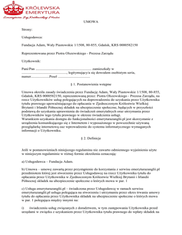 UMOWA Strony: Usługodawca: Fundacja Adam, Wały Piastowskie 1/1508, 80-855, Gdańsk, KRS 0000582150 Reprezentowana przez Piotra Olszewskiego - Prezesa Zarządu Użytkownik: Pani/Pan ............................................................. zamieszkały w ................................................., legitymujący/a się dowodem osobistym seria, numer....................Pesel ................................... § 1. Postanowienia wstępne Umowa określa zasady świadczenia przez Fundację Adam, Wały Piastowskie 1/1508, 80-855, Gdańsk, KRS 0000582150, reprezentowaną przez: Piotra Olszewskiego - Prezesa Zarządu, na rzecz Użytkowników usług polegających na doprowadzeniu do uzyskania przez Użytkownika tytułu prawnego upoważniającego do opłacania w Zjednoczonym Królestwie Wielkiej Brytanii i Irlandii Północnej składek na ubezpieczenie społeczne, będących w przyszłości podstawą do uzyskania uprawnienia do świadczeń emerytalnych oraz utrzymania przez Użytkowników tego tytułu prawnego w okresie świadczenia usługi. Warunkiem uzyskania dostępu do funkcjonalności emeryturazanglii.pl jest skorzystanie z urządzenia komunikującego się z Internetem i wyposażonego w powszechnie używaną przeglądarkę internetową oaz wprowadzenie do systemu informatycznego wymaganych informacji o Użytkowniku. § 2. Definicje Jeśli w postanowieniach niniejszego regulaminu nie zawarto odmiennego wyjaśnienia użyte w niniejszym regulaminie w różnej formie określenia oznaczają: a) Usługodawca – Fundacja Adam. b) Umowa – umowę zawartą przez przystąpienie do korzystania z serwisu emeryturazanglii.pl przedmiotem której jest stworzenie przez Usługodawcę na rzecz Użytkownika tytułu do opłacania przez Użytkownika w Zjednoczonym Królestwie Wielkiej Brytanii i Irlandii Północnej składek na ubezpieczenie społeczne o których mowa w par. 1 c) Usługa emeryturazanglii.pl – świadczona przez Usługodawcę w ramach serwisu emeryturazanglii.pl usługa polegająca na stworzeniu i utrzymaniu przez okres trwania umowy tytułu do opłacania przez Użytkownika składek na ubezpieczenie społeczne o których mowa w par. 1 polegająca między innymi na: i) świadczeniu usług związanych z doradztwem, w tym zastępowania Użytkownika przed urzędami w związku z uzyskaniem przez Użytkownika tytułu prawnego do wpłaty składek na świadczenie emerytalne oraz indywidualnego rachunku udostępnionego z Her Majesty’s Revenue and Customs – HMRC (brytyjskiego urzędu nieministerialnego odpowiedzialnego za pobieranie podatków, niektórych składek społecznych oraz innych obowiązków delegowanych przez szczególne przepisy prawa brytyjskiego) ii) świadczeniu usług doradczych i pomocy w uzyskaniu numeru NIN (National Insurance Number) przez Użytkownika, w tym dokonania wszelkich niezbędnych czynności zmierzających do jego pozyskania jak: umówienie osobistej wizyty w JobCenter+, zapewnienie asysty w trakcie pobytu Użytkownika w Wielkiej Brytanii związanego z uzyskaniem NIN; iii) świadczeniu usług doradczych i pomocy, w tym zastępowania Użytkownika przed urzędami i instytucjami w okresie obowiązywania niniejszej umowy i wykonywania za Użytkownika czynności związanych z utrzymaniem tego tytułu (składanie właściwych wniosków, deklaracji, sprawozdań) i przekazywania Użytkownikowi informacji o indywidualnym rachunku bankowym w HMRC lub innym, na który Użytkownik zobowiązuje się opłacać składki emerytalne w odstępach czasowych przewidzianych przez HMRC. Użytkownik przyjmuje do wiadomości, że wysokość składki może ulec zmianie w okresie obowiązywania umowy. iv) regularnie, nie później niż na 7 dni przed terminem zapłaty składki emerytalnej wskazywania Użytkownikowi poprzez zamieszczenie tych danych poprzez serwis emeryturazanglii.pl, za pośrednictwem podanego przez Użytkownika adresu e-mail, aktualnego numeru rachunku, na który Użytkownik zobowiązuje się wpłacić składkę w wymaganej przez HMRC wysokości oraz o wysokości tej składki. d) Użytkownik – osoba fizyczna, posiadająca obywatelstwo polskie lub obywatelstwo innego państwa członkowskiego Unii Europejskiej – korzystająca z pełni paw publicznych oraz korzystająca ze swobód przepływu, osób, usług i kapitału wynikających z Traktatu o Funkcjonowaniu Unii Europejskiej, która korzysta z serwisu emeryturazanglii.pl zlecając Usługodawcy wykonanie usługi emeryturazanglii.pl na warunkach określonych w niniejszej umowie. § 3. Przedmiot umowy – prawa i obowiązki stron Obowiązki usługodawcy. Usługodawca zobowiązany jest do: a) utrzymania przez okres obowiązywania niniejszej umowy serwisu www.emeryturazanglii.pl i zapewnienia funkcjonalności tego serwisu, to jest w szczególności udostępnienia Użytkownikowi w formie elektronicznej informacji umożliwiających użytkownikowi terminowe odprowadzenie składek emerytalnych we właściwej wysokości na indywidualny numer rachunku w HMRC lub inny, b) podejmowaniu na rzecz Użytkownika czynności faktycznych i prawnych koniecznych do utrzymania aktywnego tytułu do opłacania przez użytkownika składek określonych w pkt. a) powyżej, c) podejmowania innych czynności informacyjnych na rzecz Użytkownika w tym informowania użytkownika o zmianie przepisów prawa mogących mieć wpływ na uzyskanie przez użytkownika świadczeń emerytalnych, d) zawiadomienia Użytkownika o konieczności stawienia się w urzędzie lub instytucji na terenie Zjednoczonego Królestwa Wielkiej Brytanii i Irlandii Północnej w celu osobistego dopełnienia formalności związanych z uzyskaniem tytułu do odprowadzania składek, Obowiązki utrzymania serwisu emeryturazanglii.pl mogą zostać wykonane bądź przez utworzenie indywidualnego profilu w serwisie, bądź poprzez okresowe wysyłanie Użytkownikowi wiadomości e-mail. Obowiązki Użytkownika. Użytkownik zobowiązany jest do: a) podania Usługodawcy, poprzez wprowad