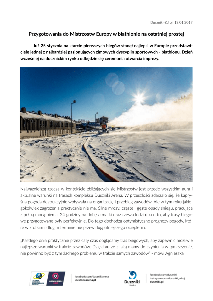 Duszniki-Zdrój, 13.01.2017 Przygotowania do Mistrzostw Europy w biathlonie na ostatniej prostej Już 25 stycznia na starcie pierwszych biegów stanął najlepsi w Europie przedstawiciele jednej z najbardziej pasjonujących zimowych dyscyplin sportowych - biathlonu. Dzień wcześniej na dusznickim rynku odbędzie się ceremonia otwarcia imprezy. Najważniejszą rzeczą w kontekście zbliżających się Mistrzostw jest przede wszystkim aura i aktualne warunki na trasach kompleksu Duszniki Arena. W przeszłości zdarzało się, że kapryśna pogoda destrukcyjnie wpływała na organizację i przebieg zawodów. Ale w tym roku jakiegokolwiek zagrożenia praktycznie nie ma. Silne mrozy, częste i gęste opady śniegu, pracujące z pełną mocą niemal 24 godziny na dobę armatki oraz rzesza ludzi dba o to, aby trasy biegowe przygotowane były perfekcyjnie. Do tego dochodzą optymistyczne prognozy pogody, które w krótkim i długim terminie nie przewidują silniejszego ocieplenia. „Każdego dnia praktycznie przez cały czas doglądamy tras biegowych, aby zapewnić możliwie najlepsze warunki w trakcie zawodów. Dzięki aurze z jaką mamy do czynienia w tym sezonie, nie powinno być z tym żadnego problemu w trakcie samych zawodów” - mówi Agnieszka Uznańska, dyrektor Miejskiego Ośrodka Kultury i Sporty w Dusznikach-Zdroju. „Intensywne prace trwają jeszcze na samym obiekcie - do wykończenia pozostało jeszcze kilka drobiazgów jeśli chodzi o samą infrastrukturę” - dodaje dyrektor MOKiS. Ośrodek Sportów Zimowych Duszniki Arena przed Mistrzostwami Europy przeszedł gruntowną przebudowę. Cała inwestycja rozciągnięta została w czasie na okres dwóch lat. Zmodernizowany został sam centralny stadion, na którym zlokalizowane będą start, meta oraz strzelnice. Specjalnie na te zawody wybudowany został budynek, w którym mieścić się będzie biuro zawodów oraz biura prasowe. Dodatkowo zwiększono także liczbę dostępnych miejsc dla kibiców na trybunach, gruntownie zmodernizowano także inne elementy - ławki, bariery, miejsca parkingowe czy pomieszczenia ekip, serwisantów czy dziennikarzy. 10 stycznia odbyła się na obiekcie inspekcja Międzynarodowej Unii Biathlonu, która dotychczas prowadzone działania oceniła bardzo pozytywnie. „Inwestycja Duszniki Arena jest modernizowana nie tylko z myślą o tegorocznych Mistrzostwa Europy. Dla nikogo nie jest tajemnicą, że naszym celem jest organizacja pierwszych w Polsce zawodów Pucharu Świata w biathlonie, o które będzie się ubiegać w kolejnych latach” - mówi burmistrz Dusznik-Zdroju, Piotr Lewandowski. Już dziś wiadomo, że udział w imprezie potwierdziło wiele europejskich gwiazd biathlonu. Wśród kobiet będą to przede wszystkim reprezentantki Polski - Monika Hojnisz, Krystyna Guzik oraz Magdalena Gwizdoń, ale także Ukrainka Walia Semerenko - mistrzyni świata i złota medalistka olimpijka w biegu sztafetowym. Również wśród mężczyzn do udziału w zawodach zgłoszonych zostało wielu medalistów najważniejszych imprez - Serhij Semenov, Aleksiej Wołkow, Dymitr Małyszko. Mocne ekipy do Dusznik wysyłają także Norwegowie, Niemcy oraz Francuzi. Pierwsze konkurencje Mistrzostw rozegrane zostaną 25 stycznia - będzie to bieg mężczyzn na 20 kilometrów (godzina 10:00) oraz kobiet na 15 kilometrów (godzin 13:30). Dzień wcześniej w centrum miasta odbędzie się uroczysta ceremonia otwarcia imprezy, a już w poniedziałek (23 stycznia) odbywać się będą pierwsze treningi. IBU Otwarte Mistrzostwa Europy w biathlonie w Dusznikach-Zdroju to doskonała okazja to bliższego poznania tej pasjonującej dyscypliny sportu, a także samych Dusznik-Zdroju i zmodernizowanej Duszniki Arena. Tym bardziej, że zaraz po zakończeniu zawodów obiekt znów udostępniony zostanie wszystkim amatorom narciarstwa biegowego, którzy korzystać będą mogli z niego również po zmroku. Wiele biegnących tędy tras posiada sztuczne oświetlenie, co dodaje temu miejscu wyjątkowego uroku. Wszelkie aktualizowane na bieżąco informacje dotyczące zawodów, spraw organizacyjnych czy akredytacji dla dziennikarzy dostępne są na stronie dedykowanej Mistrzostwom Europy: www.dusznikiarena.pl, a także pod adresem: email: offi[email protected] tel: 748 669 438 fax: 748 669 708 MOKiS - Miejski Ośrodek Kultury i Sportu w Dusznikach-Zdroju ul. Zdrojowa 8 57-340 Duszniki-Zdrój