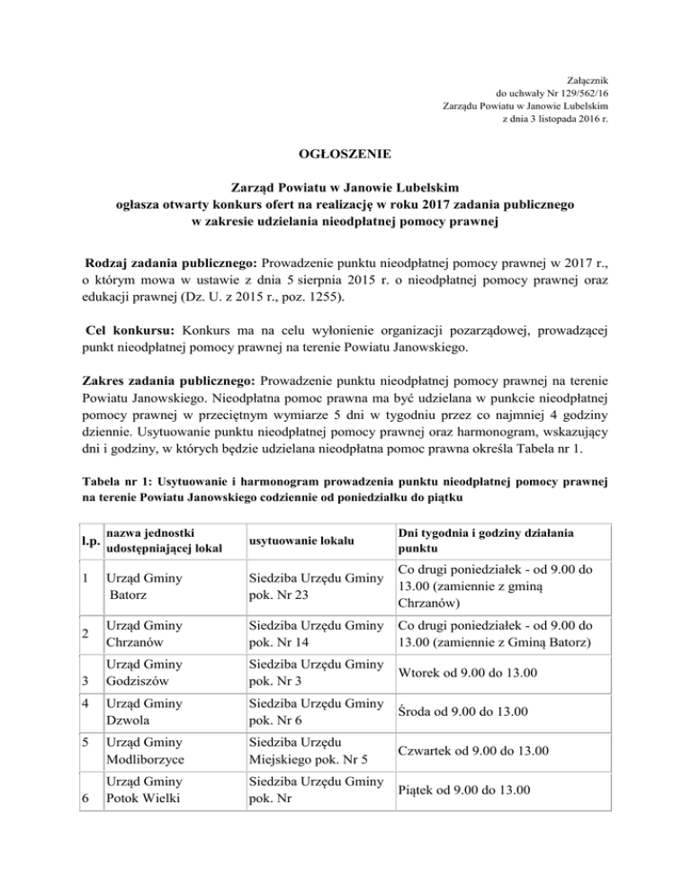 Załącznik do uchwały Nr 129/562/16 Zarządu Powiatu w Janowie Lubelskim z dnia 3 listopada 2016 r. OGŁOSZENIE Zarząd Powiatu w Janowie Lubelskim ogłasza otwarty konkurs ofert na realizację w roku 2017 zadania publicznego w zakresie udzielania nieodpłatnej pomocy prawnej Rodzaj zadania publicznego: Prowadzenie punktu nieodpłatnej pomocy prawnej w 2017 r., o którym mowa w ustawie z dnia 5 sierpnia 2015 r. o nieodpłatnej pomocy prawnej oraz edukacji prawnej (Dz. U. z 2015 r., poz. 1255). Cel konkursu: Konkurs ma na celu wyłonienie organizacji pozarządowej, prowadzącej punkt nieodpłatnej pomocy prawnej na terenie Powiatu Janowskiego. Zakres zadania publicznego: Prowadzenie punktu nieodpłatnej pomocy prawnej na terenie Powiatu Janowskiego. Nieodpłatna pomoc prawna ma być udzielana w punkcie nieodpłatnej pomocy prawnej w przeciętnym wymiarze 5 dni w tygodniu przez co najmniej 4 godziny dziennie. Usytuowanie punktu nieodpłatnej pomocy prawnej oraz harmonogram, wskazujący dni i godziny, w których będzie udzielana nieodpłatna pomoc prawna określa Tabela nr 1. Tabela nr 1: Usytuowanie i harmonogram prowadzenia punktu nieodpłatnej pomocy prawnej na terenie Powiatu Janowskiego codziennie od poniedziałku do piątku nazwa jednostki udostępniającej lokal usytuowanie lokalu Dni tygodnia i godziny działania punktu Urząd Gminy Batorz Siedziba Urzędu Gminy pok. Nr 23 Co drugi poniedziałek - od 9.00 do 13.00 (zamiennie z gminą Chrzanów) Urząd Gminy Chrzanów Siedziba Urzędu Gminy pok. Nr 14 Co drugi poniedziałek - od 9.00 do 13.00 (zamiennie z Gminą Batorz) Urząd Gminy Godziszów Siedziba Urzędu Gminy pok. Nr 3 Wtorek od 9.00 do 13.00 4 Urząd Gminy Dzwola Siedziba Urzędu Gminy pok. Nr 6 Środa od 9.00 do 13.00 5 Urząd Gminy Modliborzyce Siedziba Urzędu Miejskiego pok. Nr 5 Czwartek od 9.00 do 13.00 Urząd Gminy Potok Wielki Siedziba Urzędu Gminy pok. Nr Piątek od 9.00 do 13.00 l.p. 1 2 3 6 Planowana wysokość środków publicznych przeznaczonych na realizację zadania: W roku 2017 – Na realizację zadania planuje przeznaczyć dotację w wysokości 60725,88 zł. Powiat Janowski przeznaczył środki finansowe na realizację przedmiotowego zadania publicznego: w roku 2015 – 0, w roku 2016 – 59 700 zł. Termin realizacji zadania: od 01.01.2017 r. do 31.12.2017 r. PODMIOTY UPRAWNIONE DO ZŁOŻENIA OFERTY: 1. Do złożenia ofert w konkursie uprawnione są organizacje pozarządowe prowadzące działalność pożytku publicznego. 2. O powierzenie prowadzenia punktu nieodpłatnej pomocy prawnej może ubiegać się organizacja pozarządowa w zakresie, o którym mowa w art. 4 ust. 1 pkt 1b ustawy dnia 24 kwietnia 2003 roku o działalności pożytku publicznego i o wolontariacie, która spełnia łącznie następujące warunki: 1) posiada co najmniej dwuletnie doświadczenie w wykonywaniu zadań wiążących się z udzielaniem porad prawnych lub informacji prawnych; 2) przedstawi zawarte umowy lub promesy ich zawarcia z adwokatem, radcą prawnym, doradcą podatkowym lub osobą, o której mowa w art. 11 ust. 3 pkt 2 ustawy z dnia 5 sierpnia 2015 r. o nieodpłatnej pomocy prawnej oraz edukacji prawnej; 3) daje gwarancję należytego wykonania zadania, w szczególności przez złożenie pisemnego zobowiązania: a) zapewnienia poufności w związku z udzielaniem nieodpłatnej pomocy prawnej i jej dokumentowaniem, b) zapewnienia profesjonalnego i rzetelnego udzielania nieodpłatnej pomocy prawnej, w szczególności w sytuacji, gdy zachodzi konflikt interesów. 3. Osoby realizujące bezpośrednio zadania muszą posiadać odpowiednie kwalifikacje i doświadczenie w tym zakresie, zgodnie art. 5 oraz art. 11 ust. 3 ustawy o nieodpłatnej pomocy prawnej oraz edukacji prawnej. 4. O powierzenie prowadzenia punktu nieodpłatnej pomocy prawnej nie może ubiegać się organizacja pozarządowa, która w okresie dwóch lat poprzedzających przystąpienie do otwartego konkursu ofert nie rozliczyła się z dotacji przyznanej na wykonanie zadania publicznego lub wykorzystała dotację niezgodnie z celem jej przyznania, jak również organizacja pozarządowa, z którą rozwiązano umowę. Termin dwóch lat biegnie odpowiednio od dnia rozliczenia się z dotacji i zwrotu nienależnych środków wraz z odsetkami albo rozwiązania umowy. WARUNKI KORZYSTANIA Z POMIESZCZEŃ 1. Powiat Janowski zapewni, że lokale w których będzie usytuowany punkt nieodpłatnej pomocy prawnej będzie miał wyodrębnione pomieszczenie umożliwiające zachowanie dyskrecji przy udzielaniu nieodpłatnej pomocy prawnej. 2. Pomieszczenie, w którym będzie udzielana nieodpłatna pomoc prawna będzie wyposażone co najmniej w biurko oraz dwa krzesła. 3. Powiat zapewni, że wyposażenie lokalu w którym będzie usytuowany punkt nieodpłatnej pomocy prawnej będzie zapewniało bezpieczne przechowywanie dokumentów zawierających dane osobowe. 4. Lokal, w którym będzie usytuowany punkt nieodpłatnej pomocy prawnej będzie miał odpowiedni dostęp do sieci energetycznej, telefonicznej oraz teleinformatycznej. 5. Powiat zapewni właściwe warunki oczekiwania osób ubiegających się o udzielenie nieodpłatnej pomocy prawnej. W pomieszczeniach przeznaczonych dla osób oczekujących, umieszczona zostanie informacja o wszystkich punktach nieodpłatnej pomocy prawnej na terenie Powiatu, o zasadach udzielania nieodpłatnej pomocy prawnej, osobach uprawnionych do jej otrzymania oraz sposobach wykazywania uprawnień do uzyskania nieodpłatnej pomocy prawnej. 6. Osoba świadcząca pomoc prawną, uprawniona będzie do korzystania z lokalu, w którym umiejscowiony jest punkt nieodpłatnej pomocy prawnej oraz korzystania z sieci energetycznej, telefonicznej oraz teleinformatycznej w godzinach określonych w Tabeli nr 1. 7. Osoba świadcząca pomoc prawną będzie zobowiązana do dokumentowania każdego przypadku udzielania pomocy prawnej w sposób określony ustawą z dnia 5 sierpnia 2015 r. o nieodpłatnej pomocy prawnej oraz 